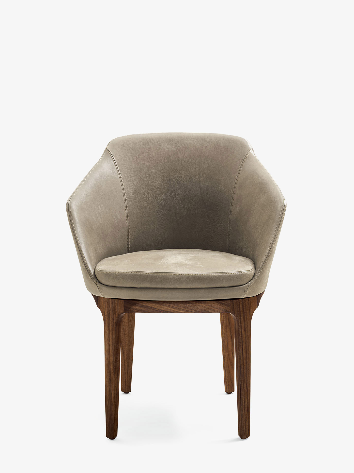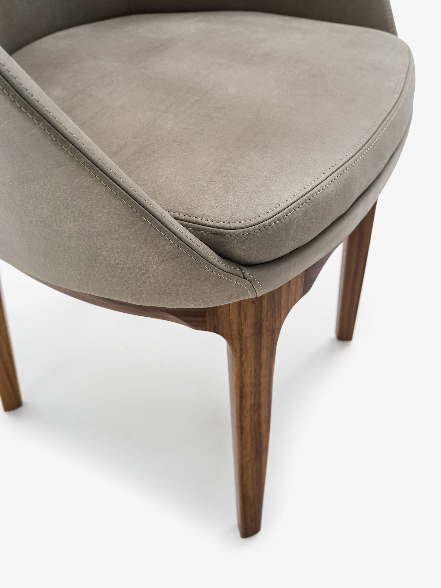Eleganter und umhüllender Armlehnstuhl mit Struktur aus Polyurethanschaum. Der weiche Sitzpolster. Variante des ursprünglichen Stuhls, mit Holzbeinen.