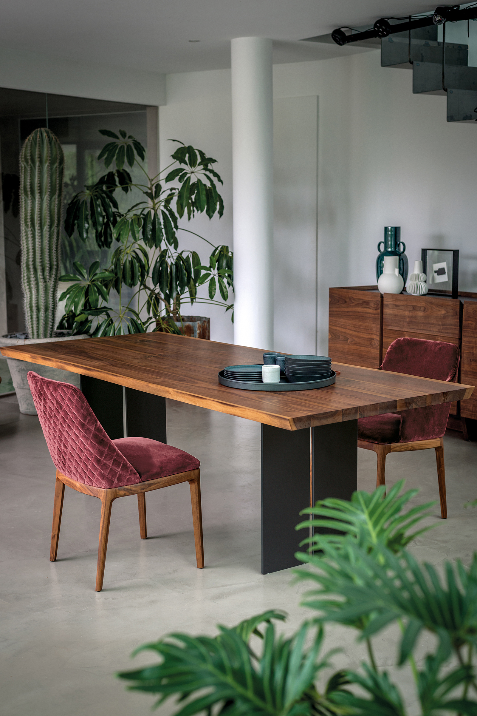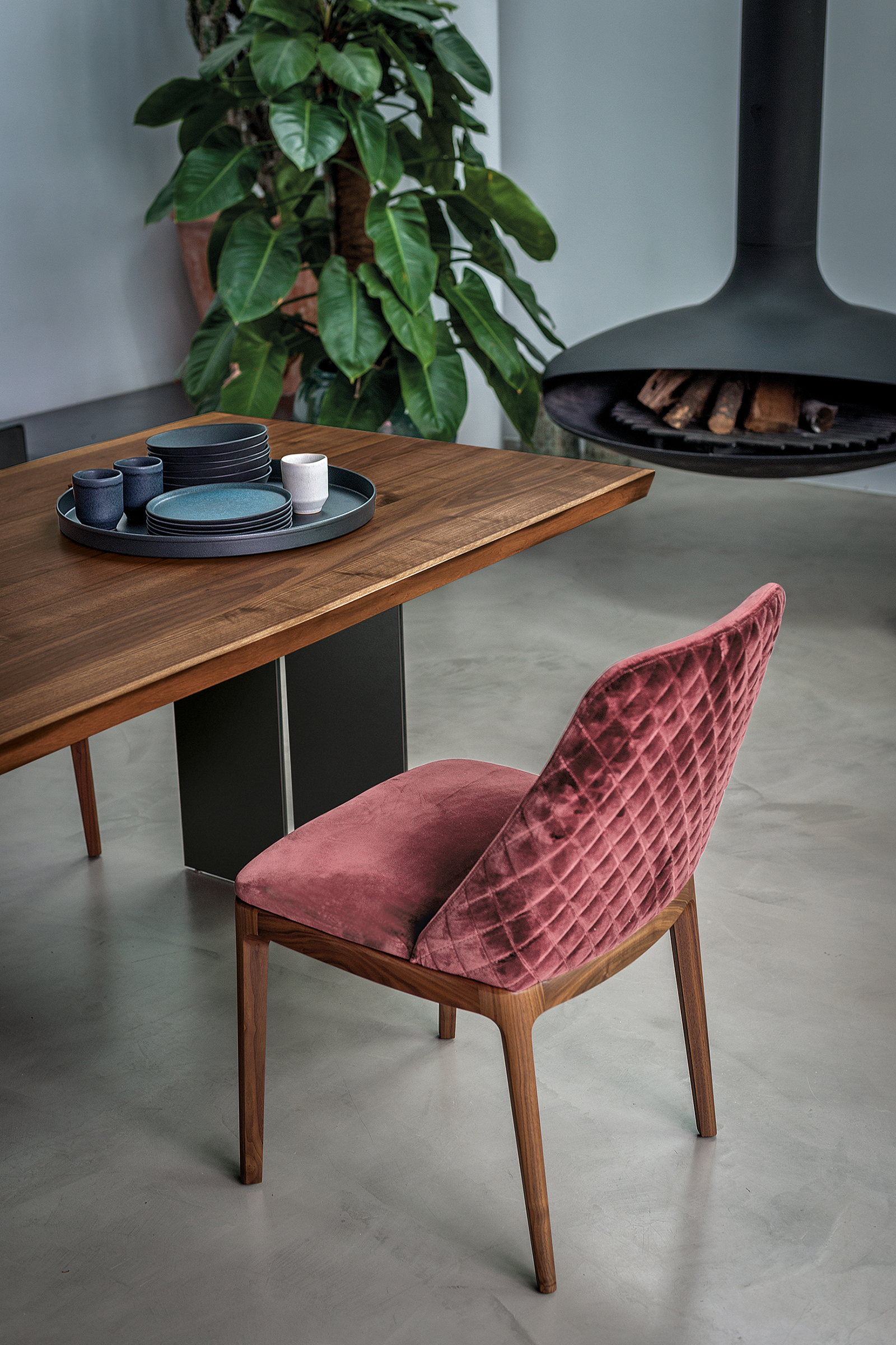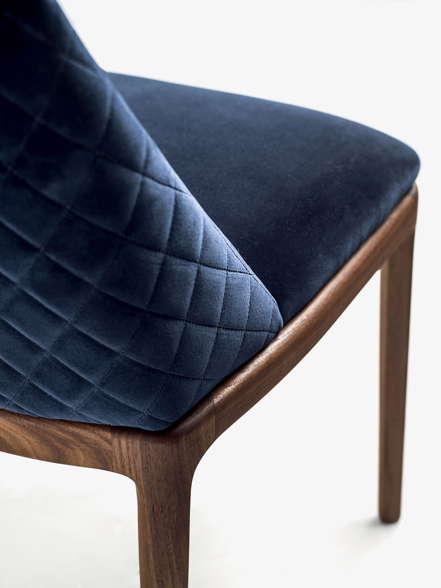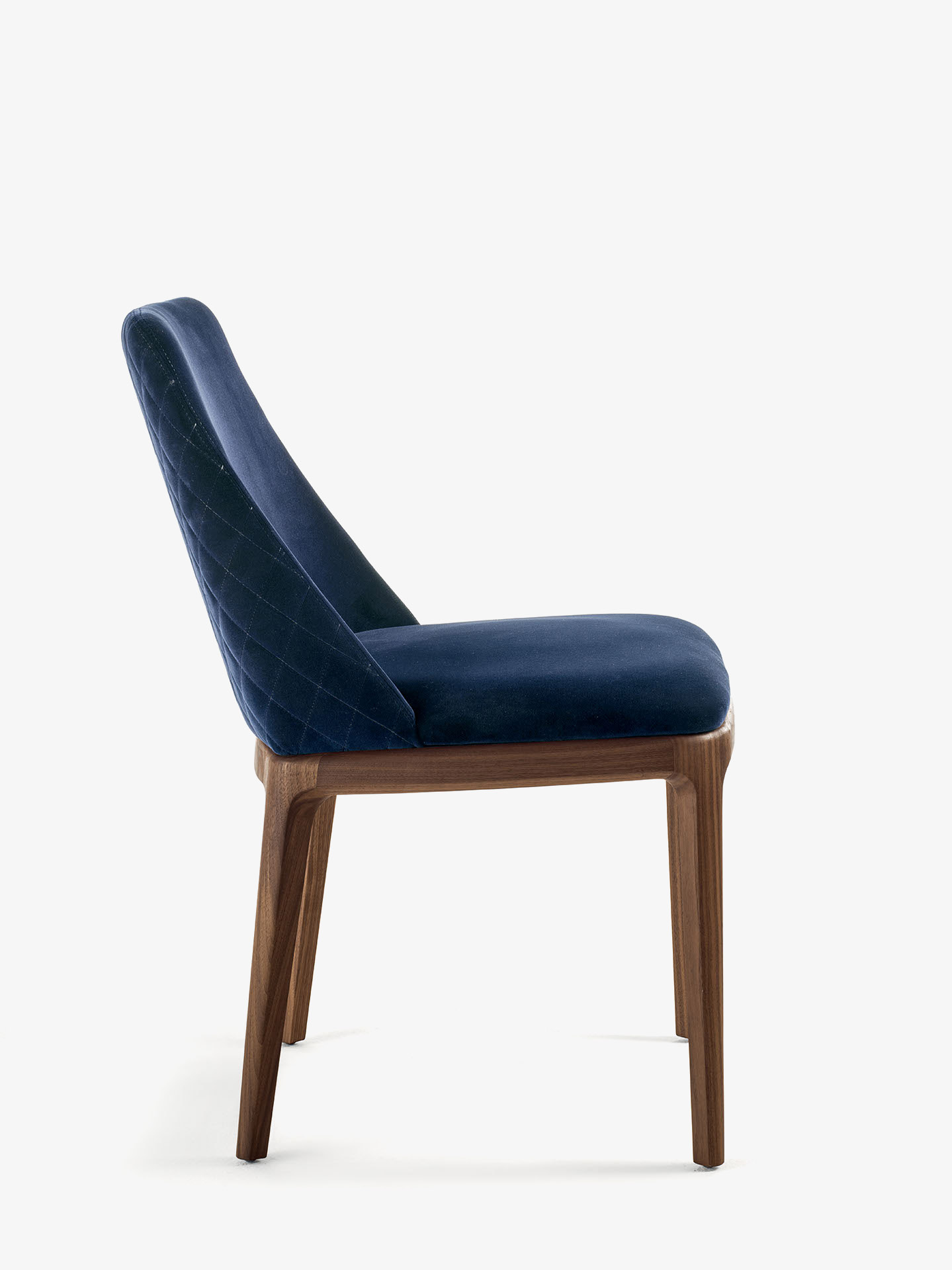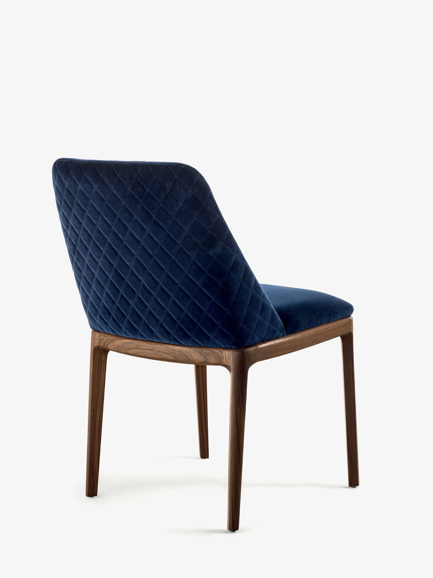 Eleganter Stuhl mit Beinen aus Massivholz, Sitz und Rückenlehne aus Polyurethanschaum. Version ohne Armlehne, mit Leder- oder Stoffbezug. Die Rückseite des Bezugs kann glatt oder mit Rautennähten sein.