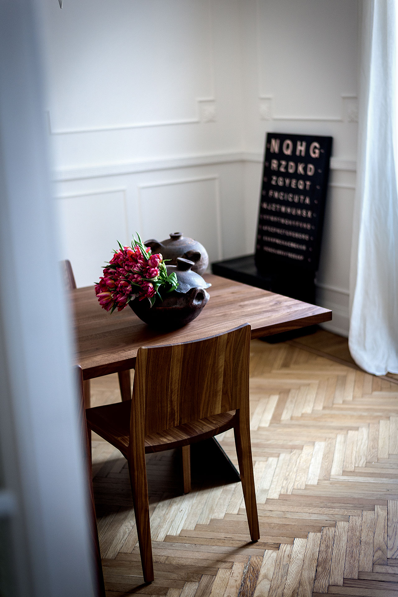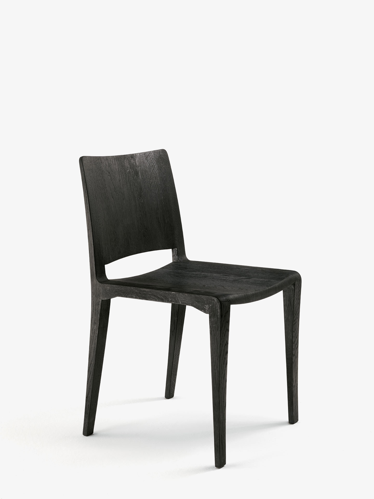 Stuhl völlig aus Massivholz. Variante des Modells Piano Design Chair, jedoch mit einer breiteren Sitzfläche und einer niedrigeren Rückenlehne.