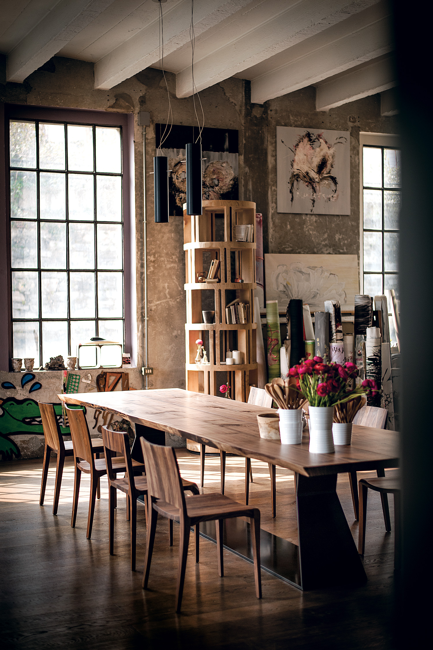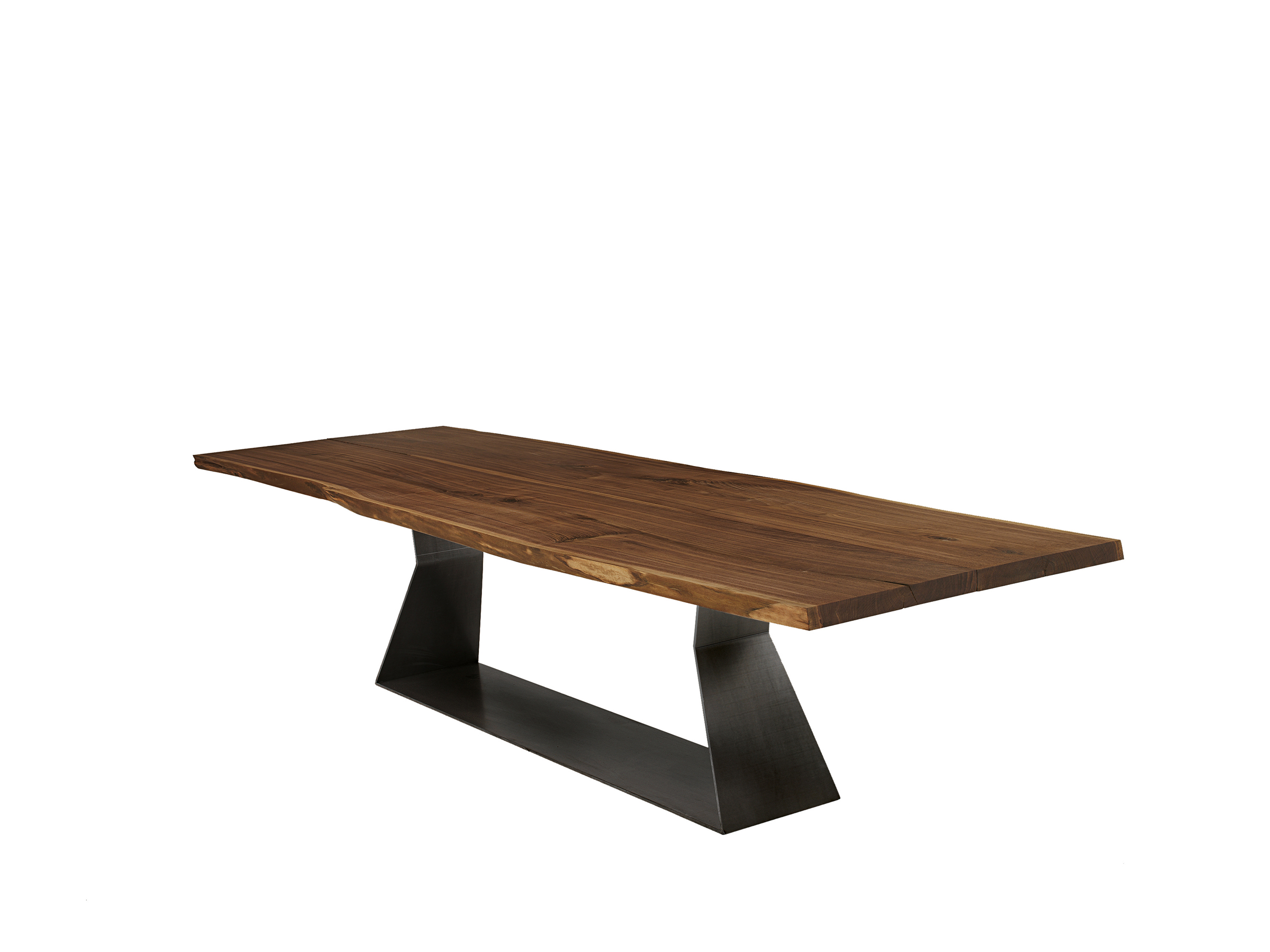 Tisch mit Platte aus Massivholz, bestehend aus zwei Planken mit Naturkanten und Mittelfuge. Auf Anfrage Planken um 30 cm verschoben positioniert (Bedrock Plank B). Gestell mit geometrischem Design aus Eisen gefertigt.