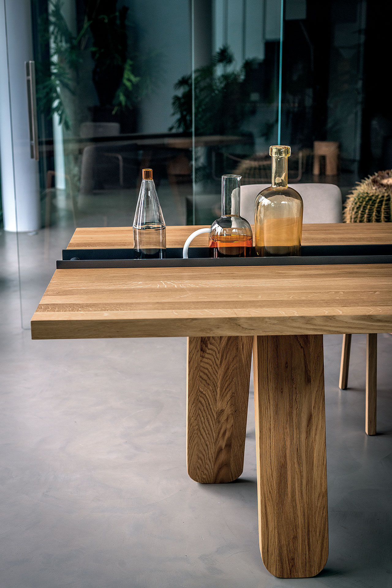 Tisch mit Platte bestehend aus verleimten Massivholzleisten, mit geraden Kanten; in der Mitte des Tisches befindet sich eine Einbuchtung in Form eines Eisenbehälters, der sich über die komplette Länge des Tisches erstrecht. Vier massive Beine mit geometrischem Abschnitt stützen die Tischplatte.
