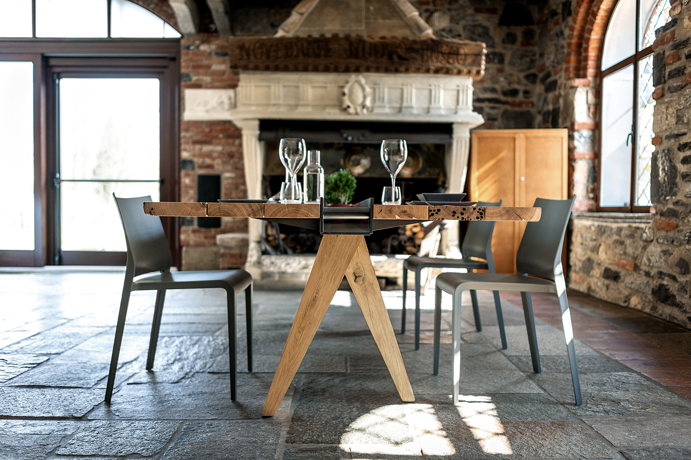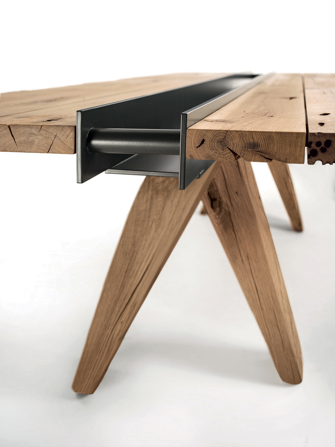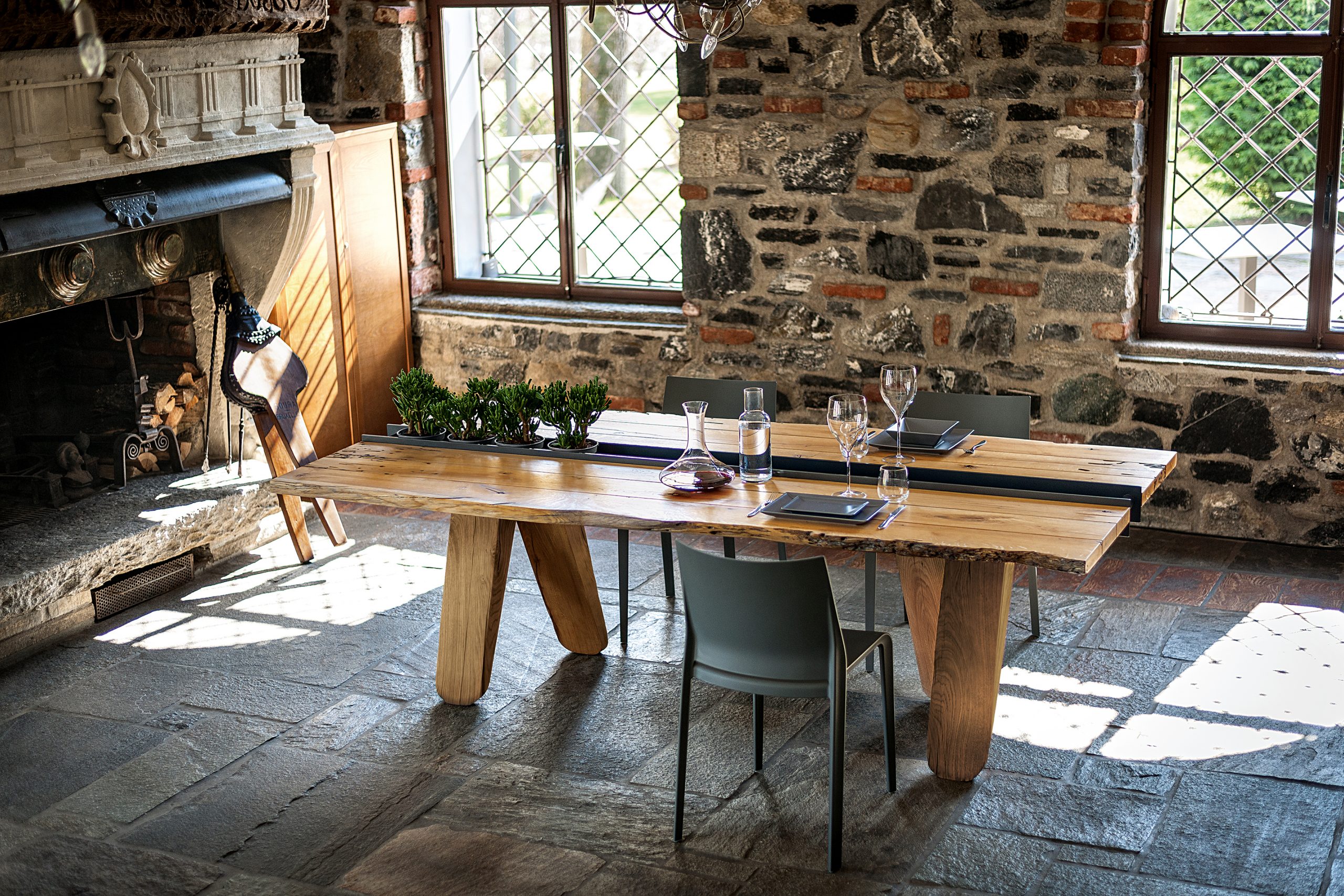 Tisch mit Platte aus Brettern in Briccola, nicht verleimt, mit Naturkanten; in der Mitte des Tisches befindet sich eine Einbuchtung in Form eines Eisenbehälters, der sich über die komplette Länge des Tisches erstrecht. Vier massive Beine stützen die Tischplatte.