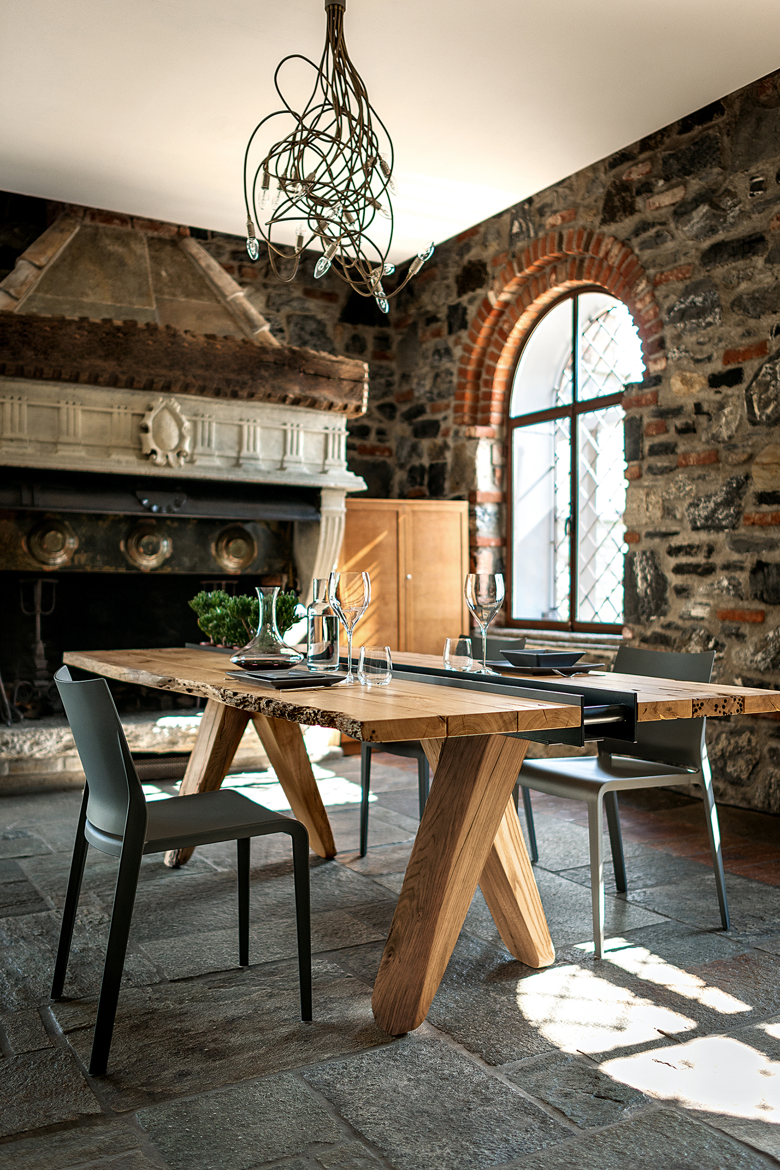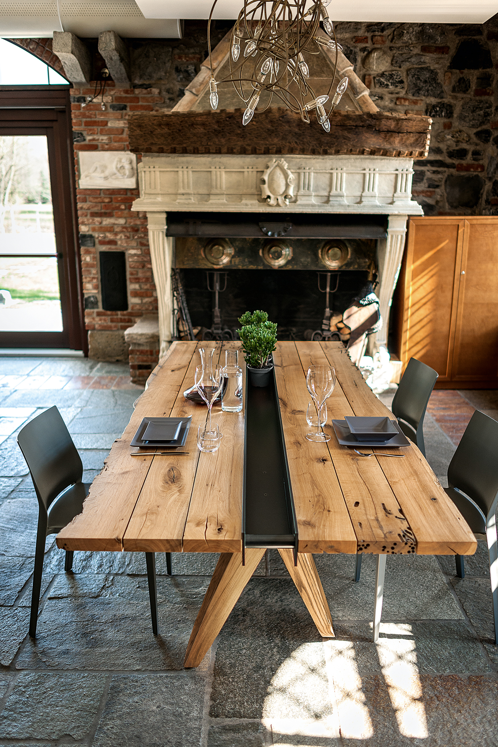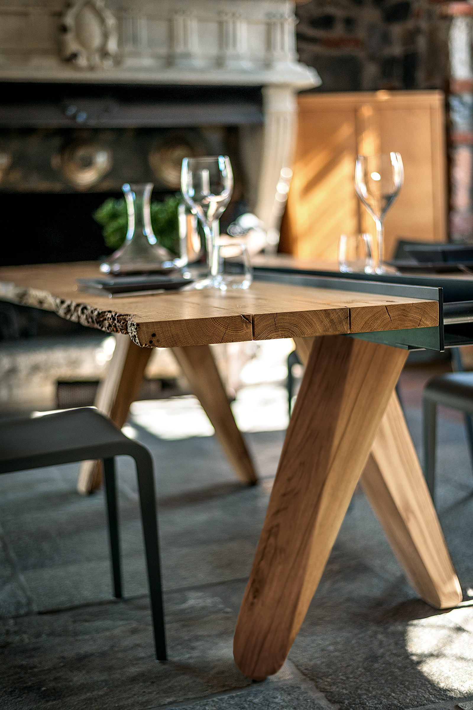 Tisch mit Platte aus Brettern in Briccola, nicht verleimt, mit Naturkanten; in der Mitte des Tisches befindet sich eine Einbuchtung in Form eines Eisenbehälters, der sich über die komplette Länge des Tisches erstrecht. Vier massive Beine stützen die Tischplatte.