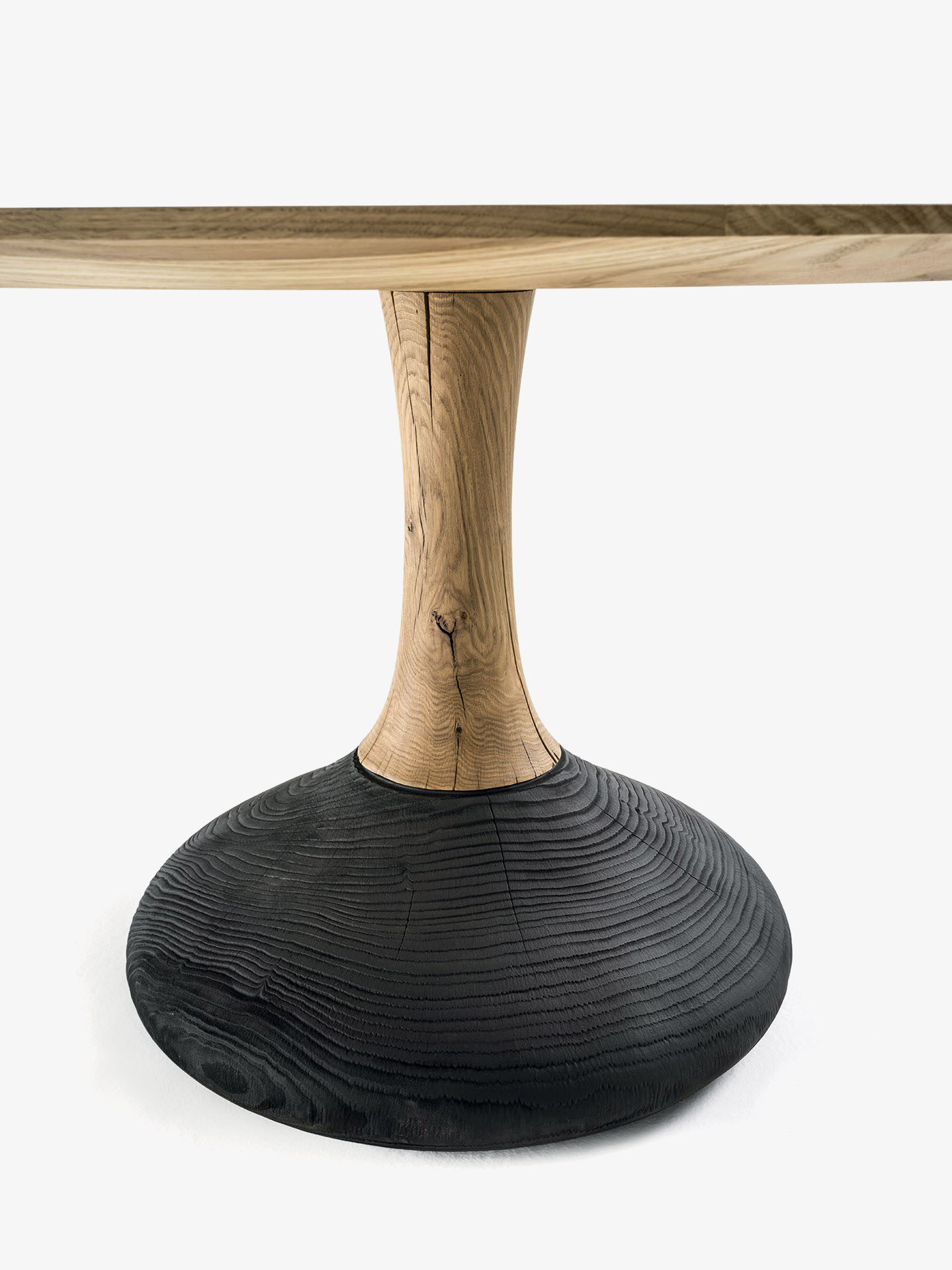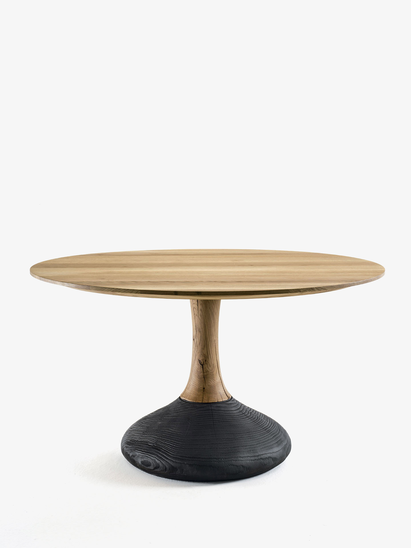 Runder oder quadratischer Tisch mit Platte bestehend aus verleimten Massivholzleisten. Gestell bestehend aus einem mittleren Bein im gleichen Holz wie die Platte und unterem Teil in Zeder, Vulcano Ausführung.