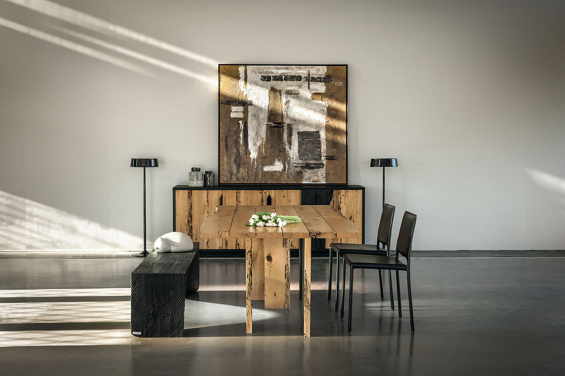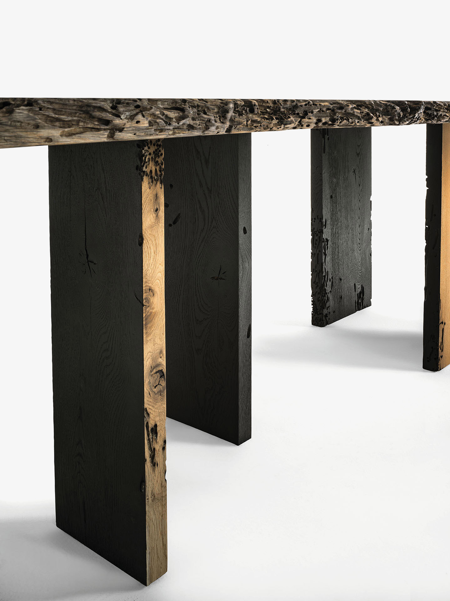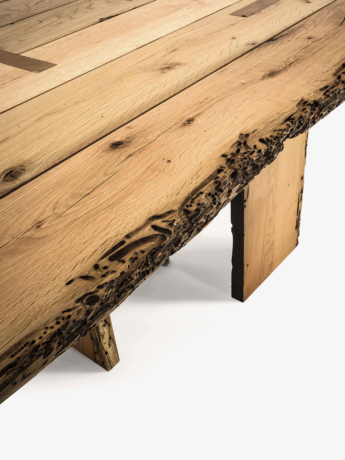 Tisch mit Platte bestehend aus Brettern in Briccola, nicht verleimt, mit Naturkanten. Das Gestell besteht aus Beinen, die durch die Platte durchstoßen und zum Teil in Vulcano-Ausführung sind.