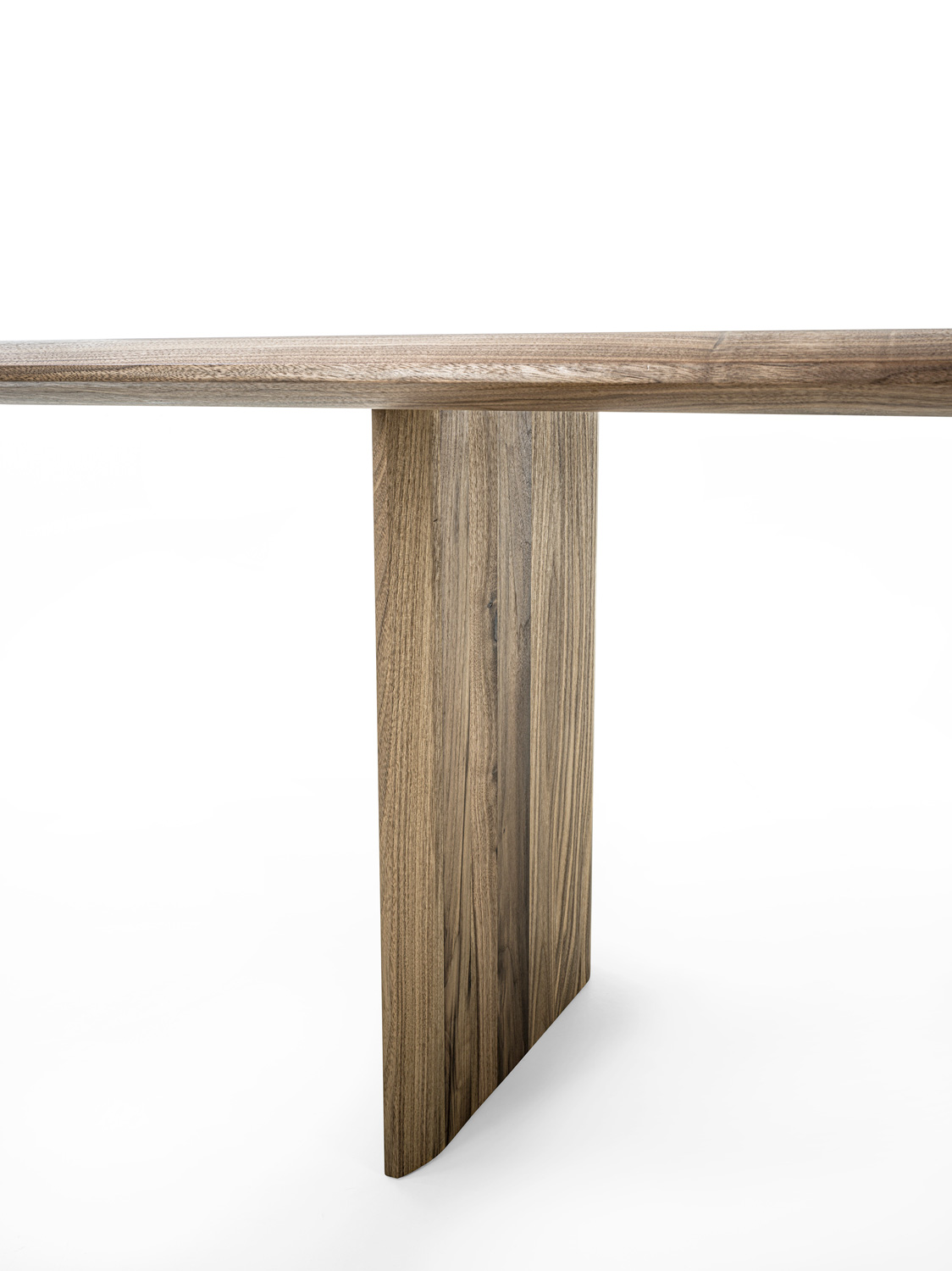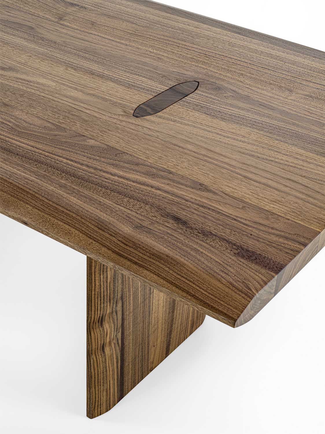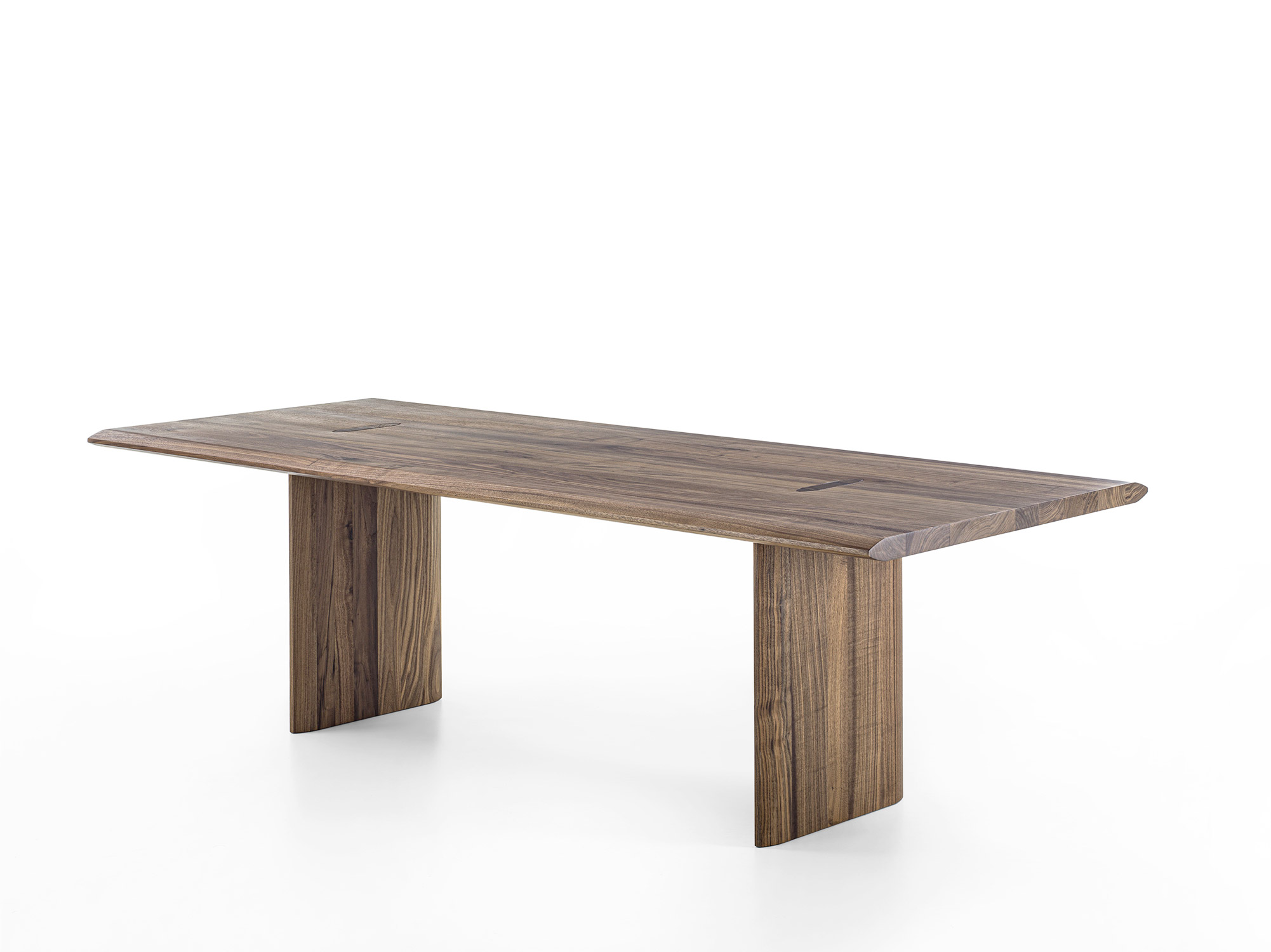 Tisch mit geleimten Massivholzbohlen und durchgehenden auf der Platte mit einer charakteristischen Spundung sichtbaren Beinen. Die Geometrie der Spundung wird im Bereich der Tischplatte und der Beine in einer verlängerten Form wieder aufgenommen, um eine ästhetische und strukturelle Kohärenz zu garantieren.