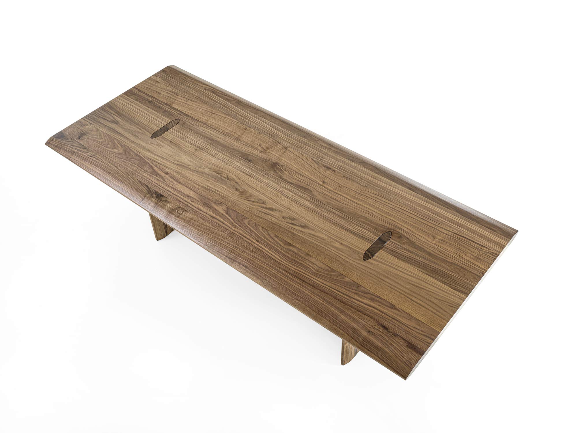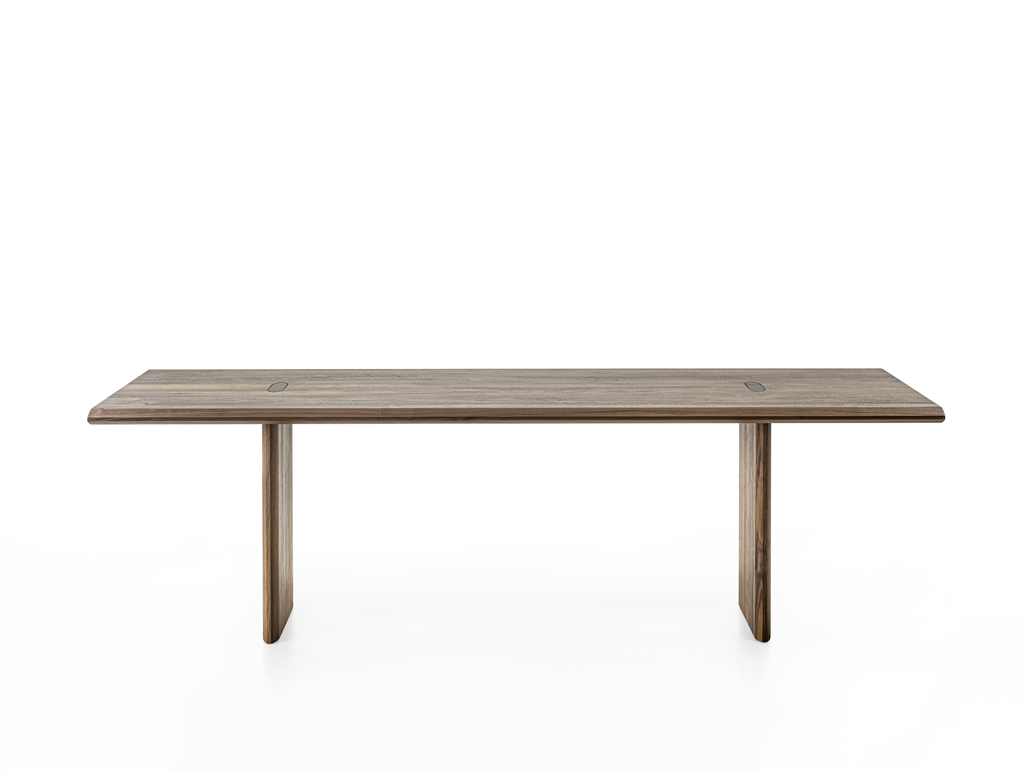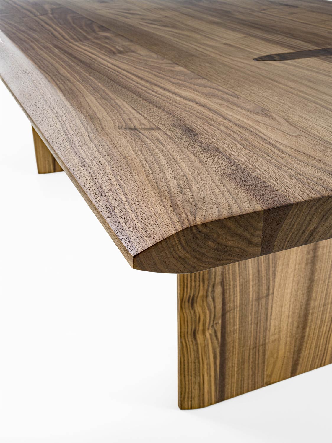 Tisch mit geleimten Massivholzbohlen und durchgehenden auf der Platte mit einer charakteristischen Spundung sichtbaren Beinen. Die Geometrie der Spundung wird im Bereich der Tischplatte und der Beine in einer verlängerten Form wieder aufgenommen, um eine ästhetische und strukturelle Kohärenz zu garantieren.