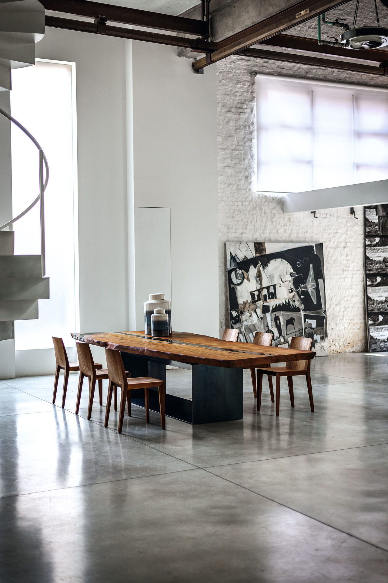 Tischplatte bestehend aus Kauriholz und Untergestell aus Eisen.