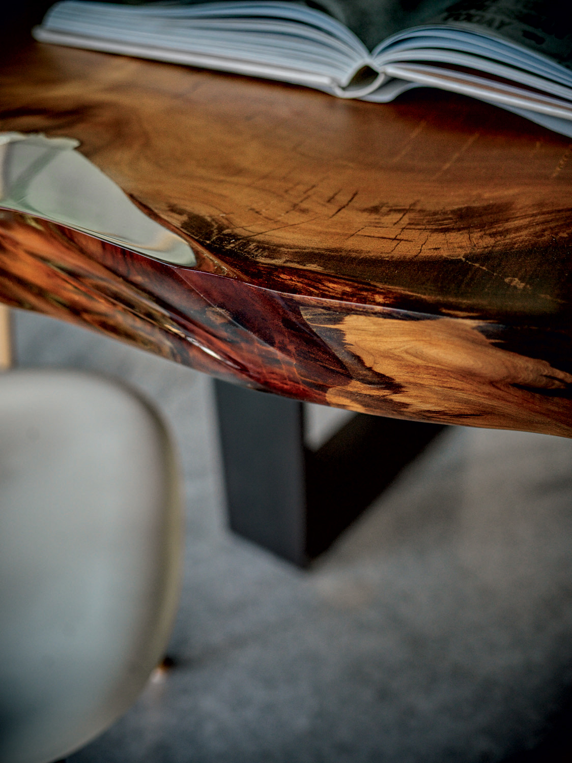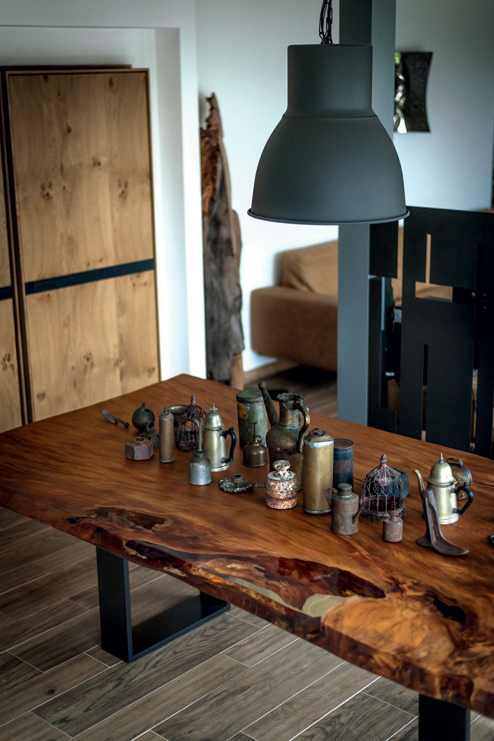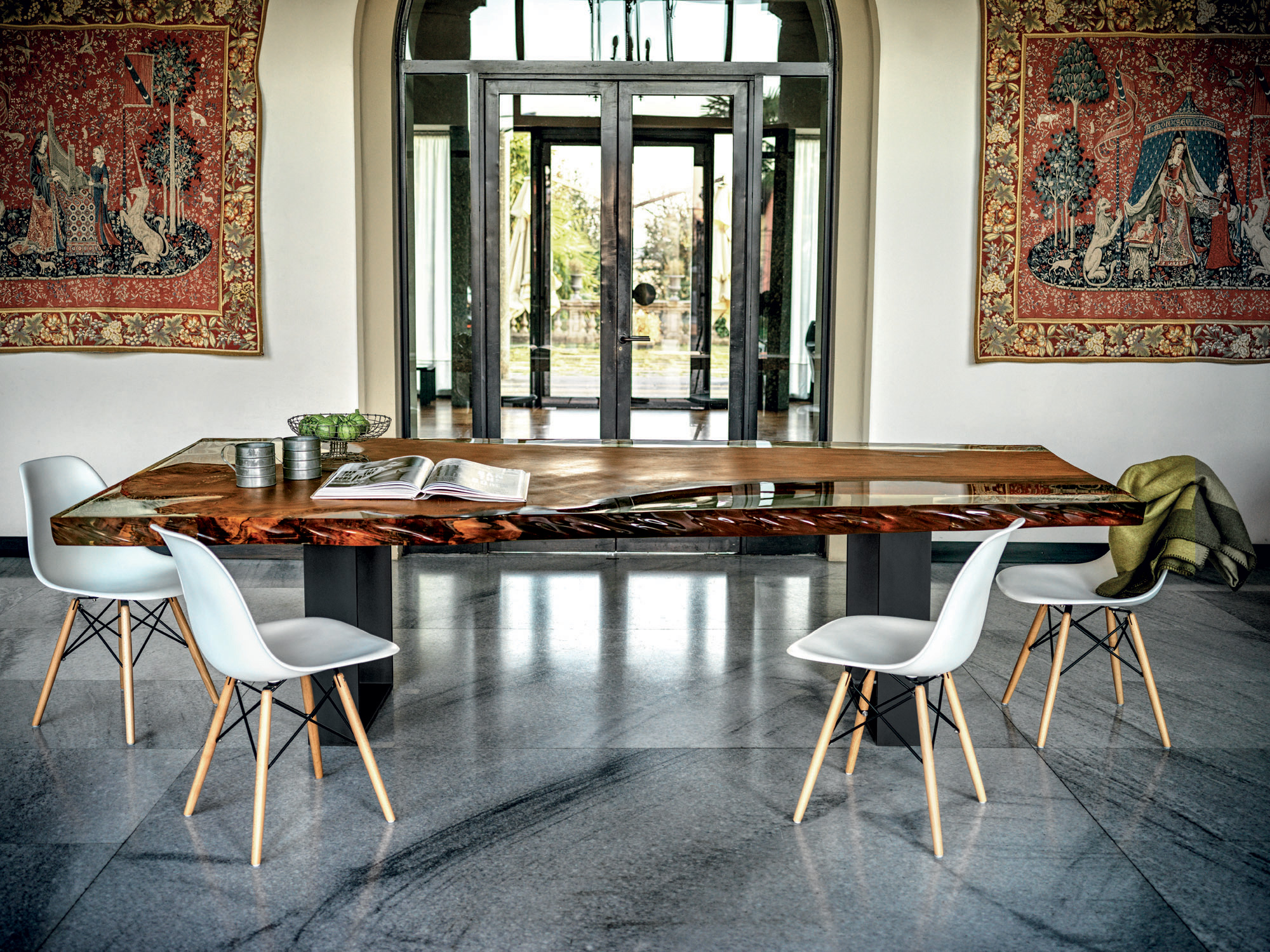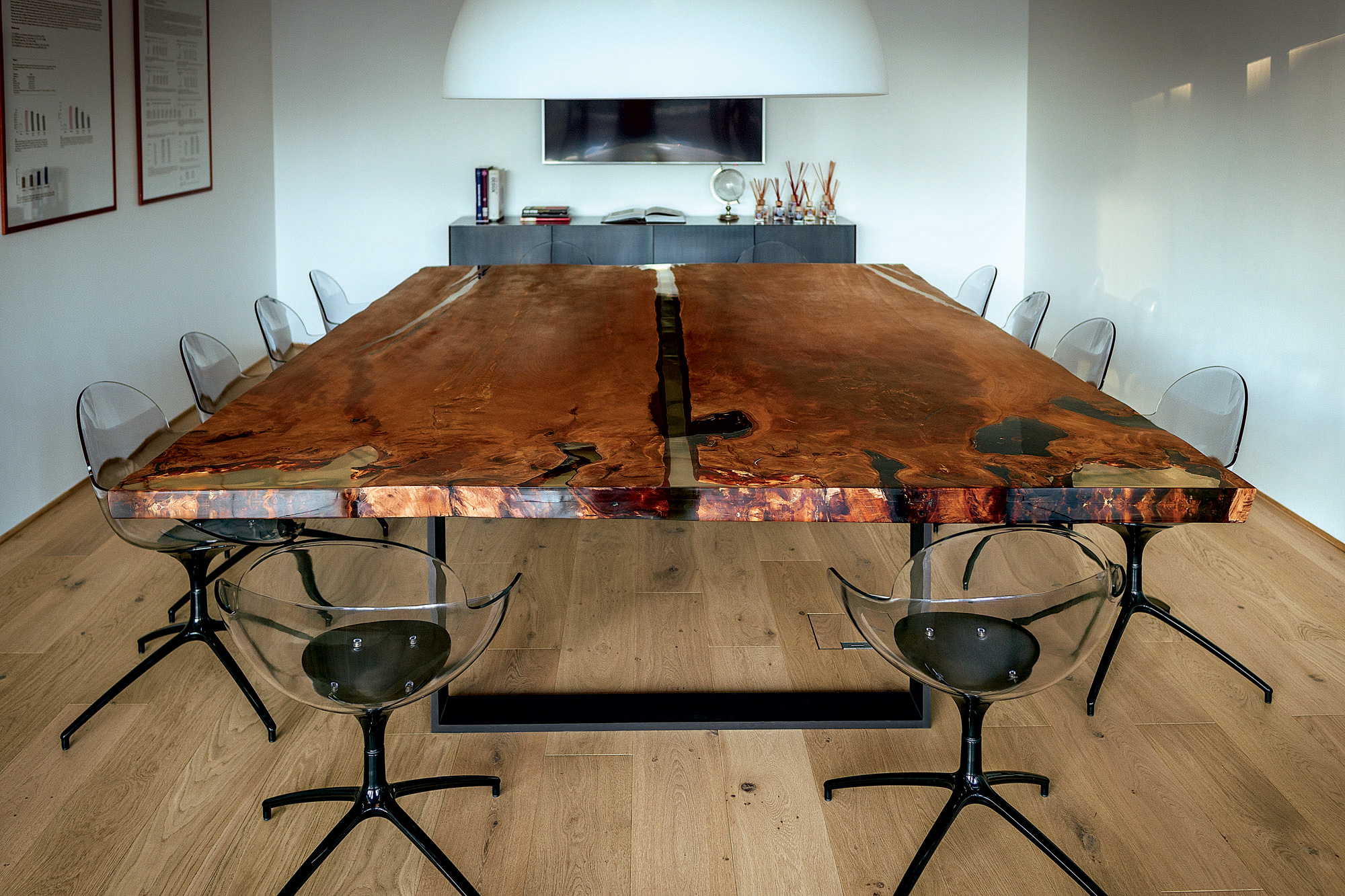 Tisch bestehend aus einer Platte aus Kauriholz und einem Eisengestell.