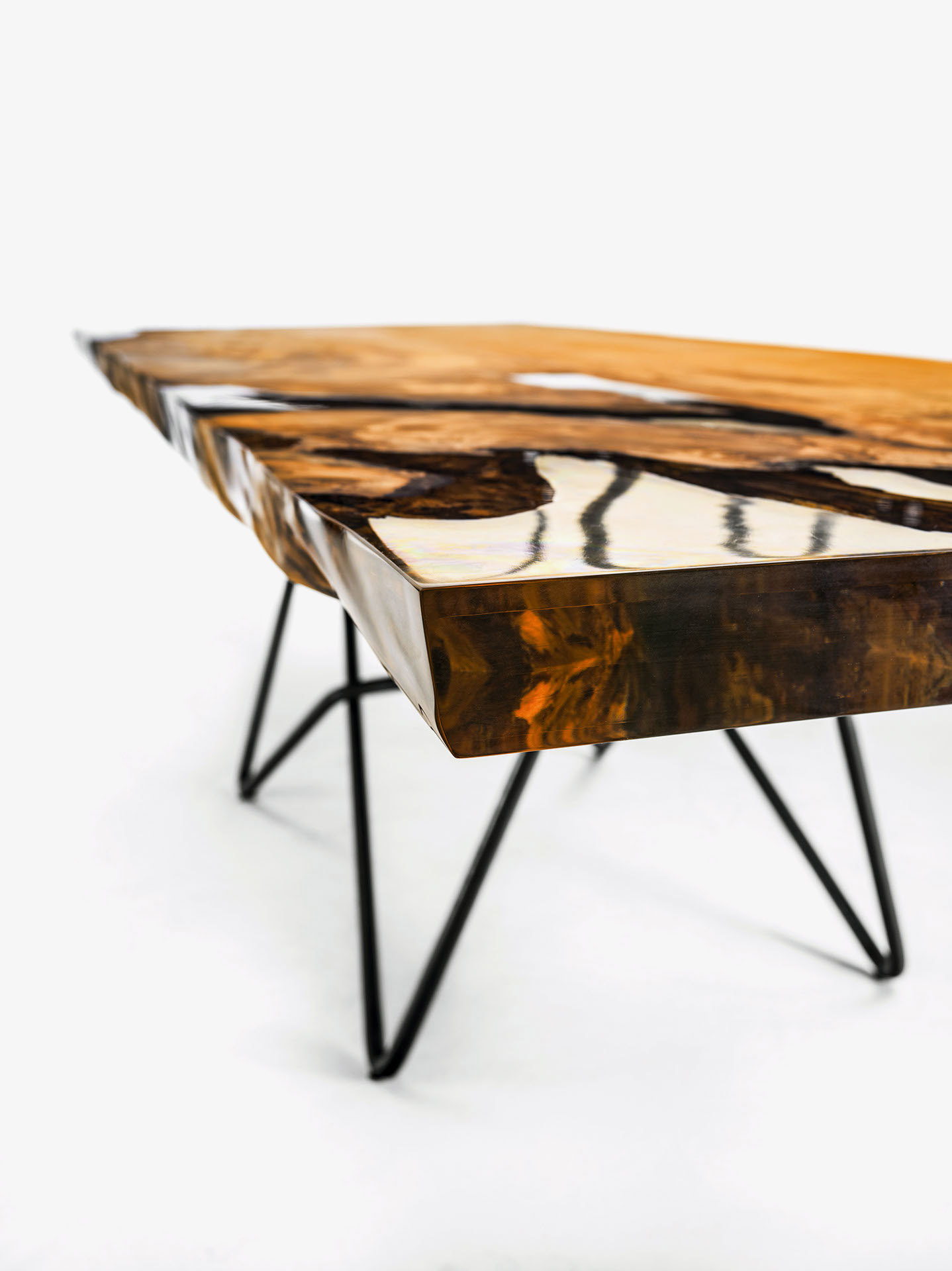 Tisch bestehend aus einer Platte aus Kaurholz und Gestell aus Eisenrohren.