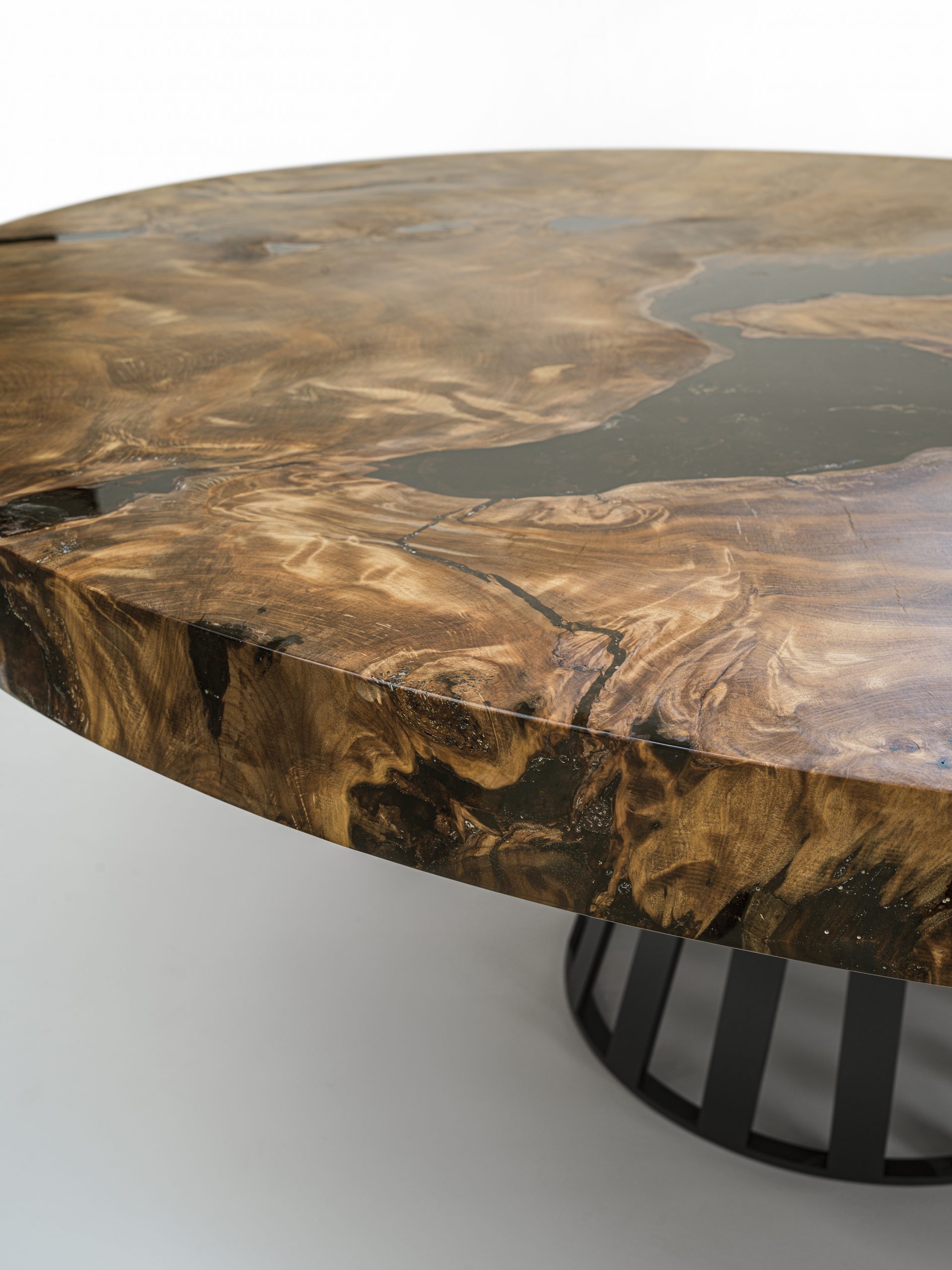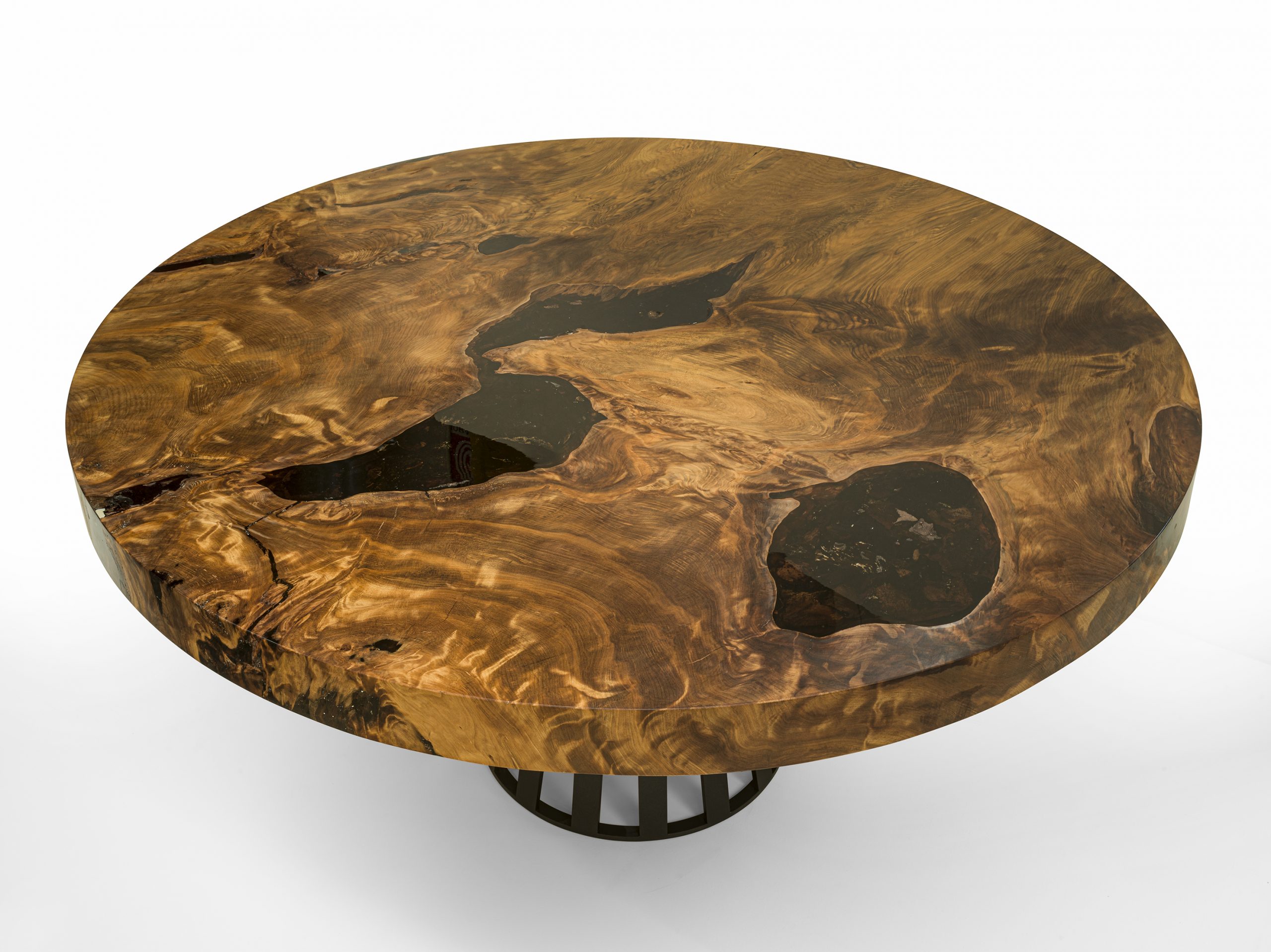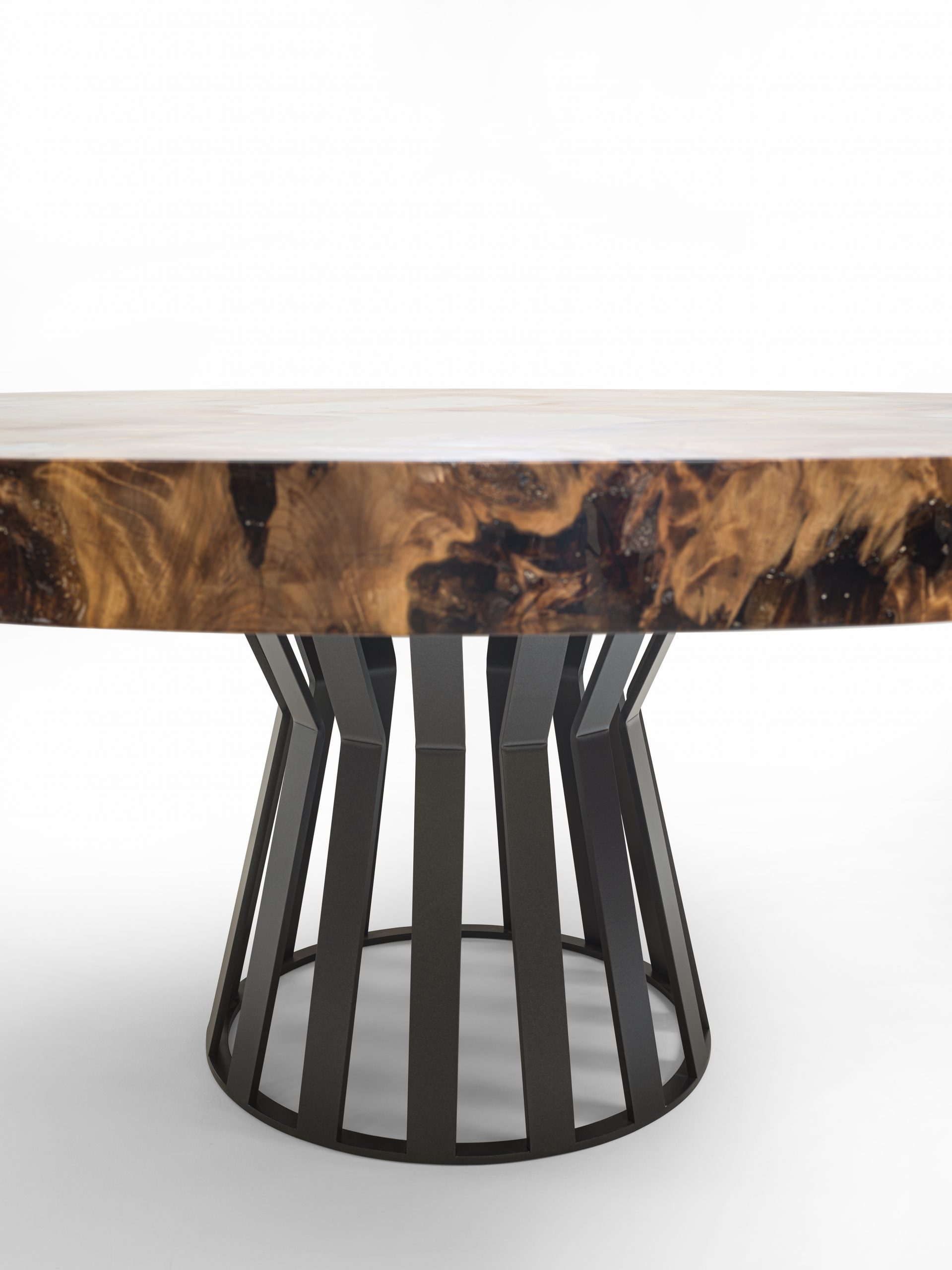 Tisch mit runder Platte aus massivem Kauriholz, kombiniert mit einem Untergestell aus Eisenleisten.
