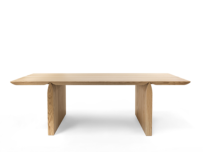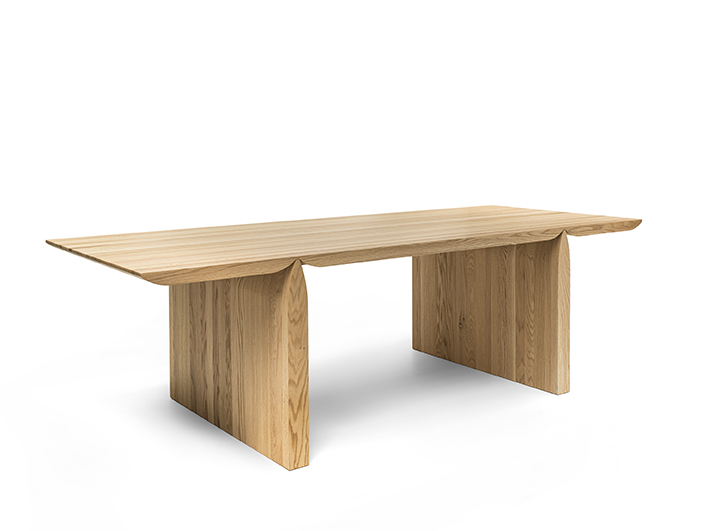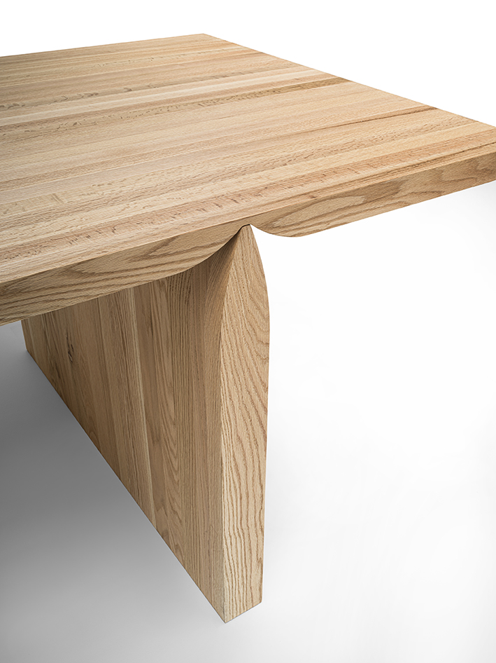 Tisch mit Platte bestehend aus verleimten Massivholzleisten und mit zwei geraden Kanten. Das Design inspiriert sich an der Natur, und zwar an einer Libelle.