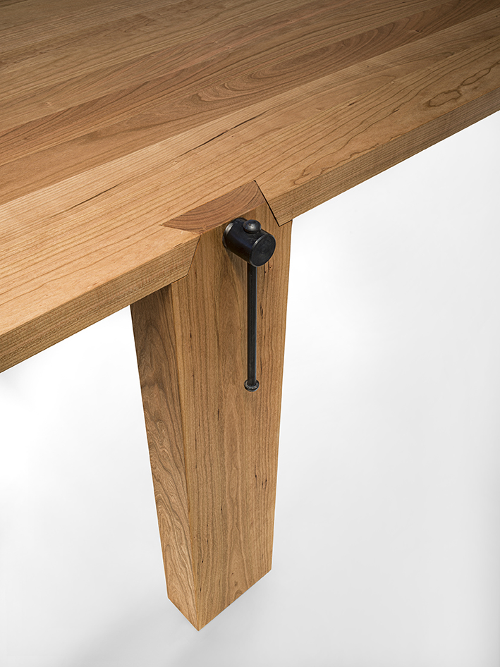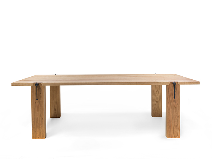Tisch mit Platte bestehend aus verleimten Massivholzleisten, der sich an der traditionellen Tischlerei inspiriert und an eine Schreinerbank erinnert.
