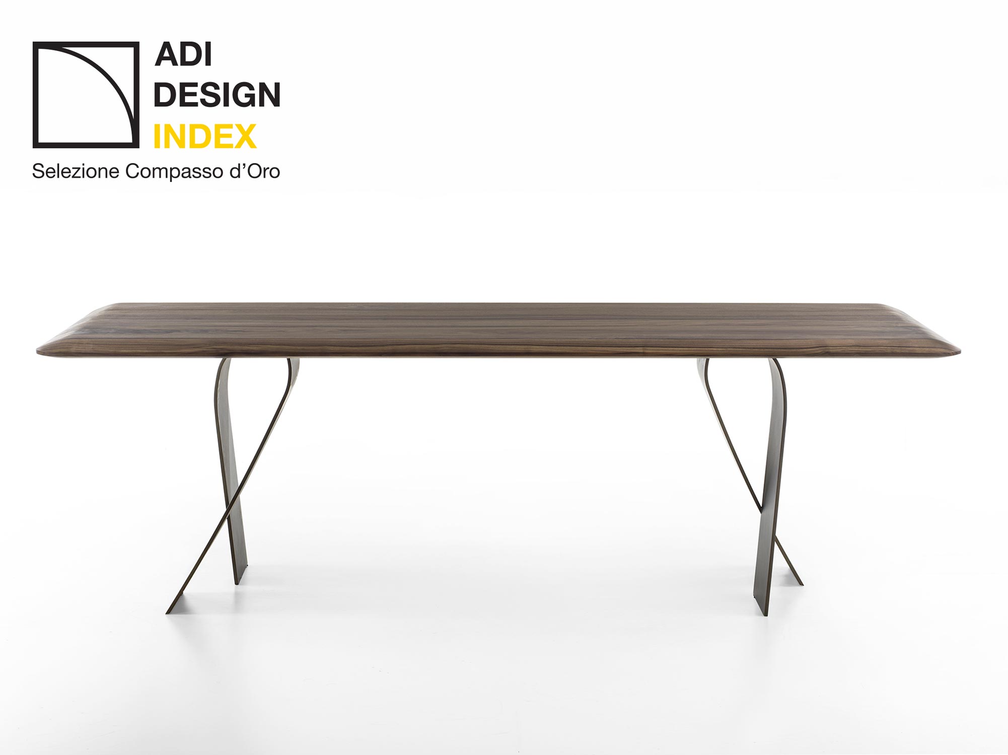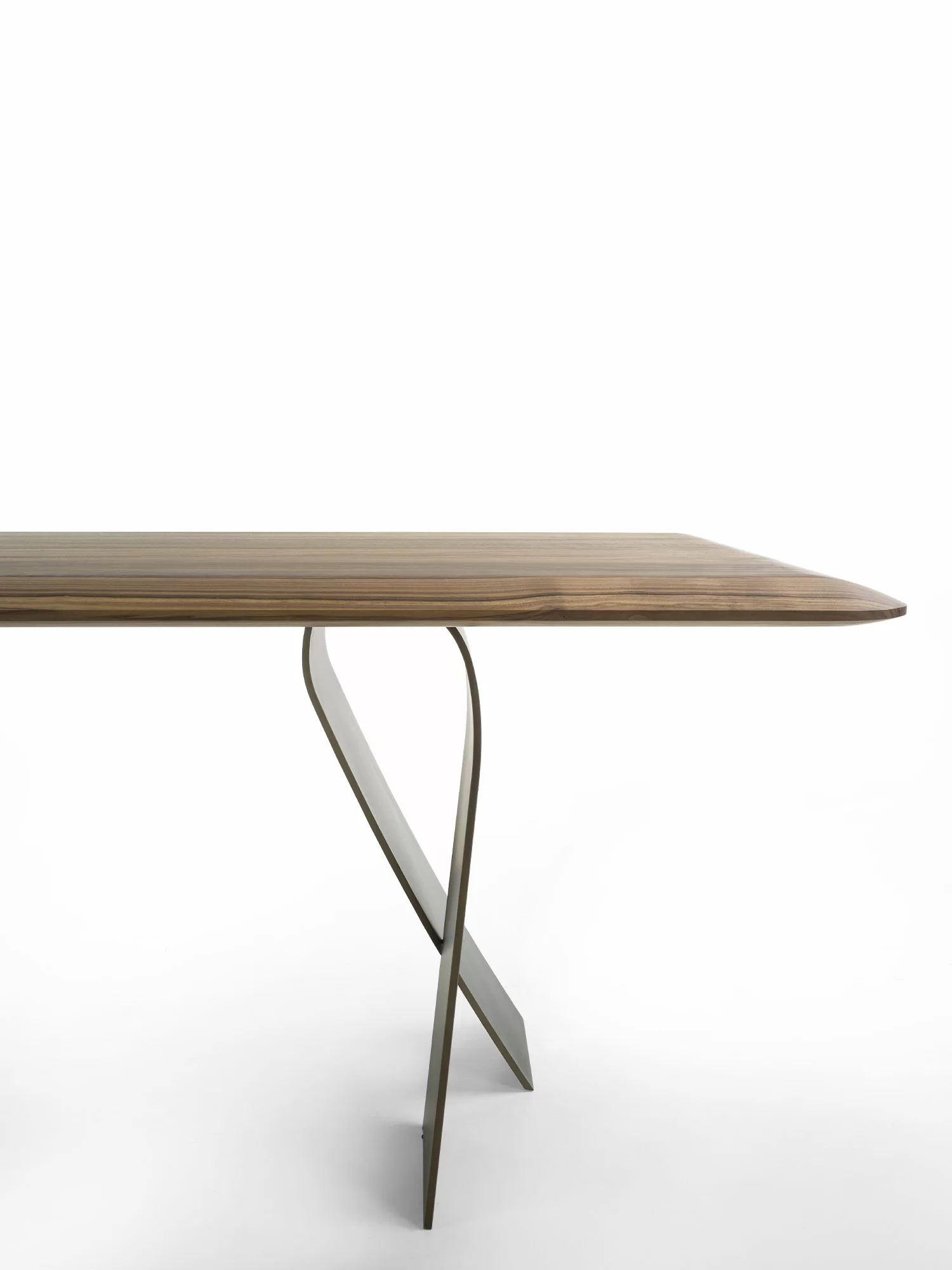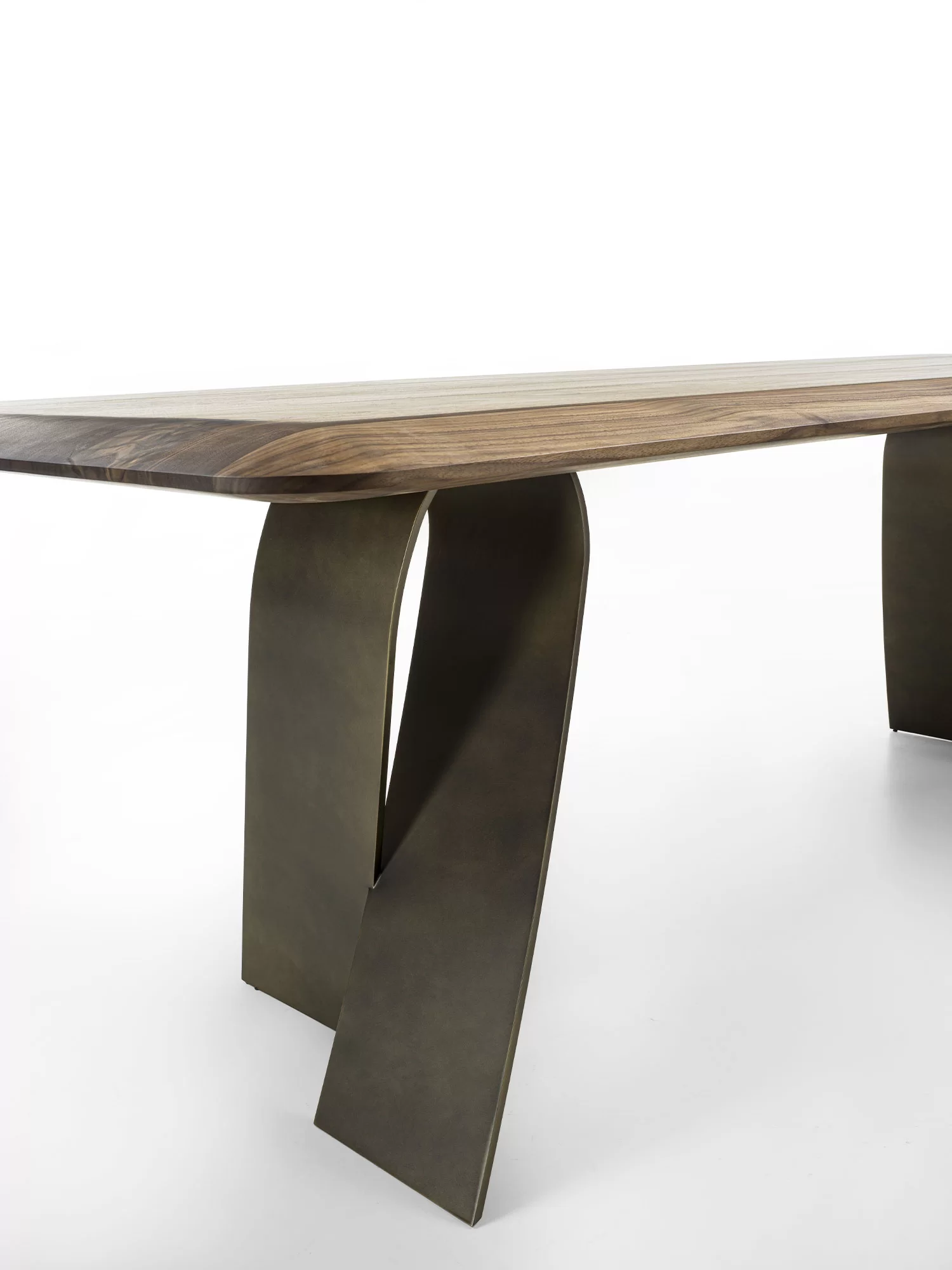 Tisch mit Massivholzplatte aus verleimten Leisten mit abgerundeten Kanten, die die Stärke verringern und Leichtigkeit verleihen, kombiniert mit Eisenbeinen, die sich wickeln und an die Flexibilität eines Bandes erinnern.