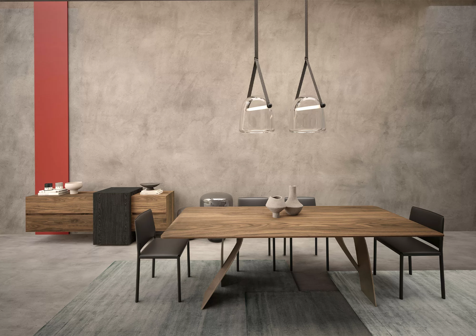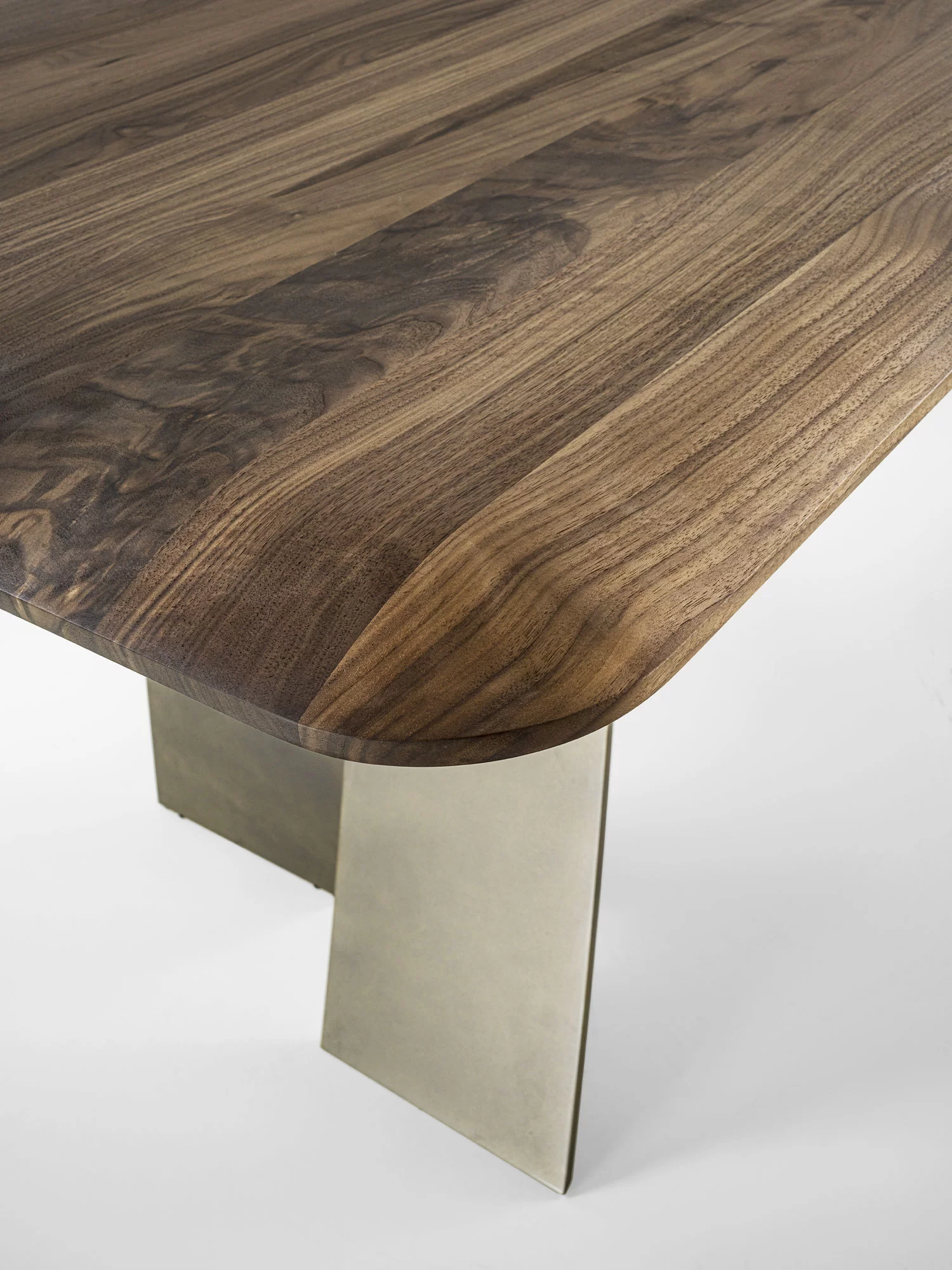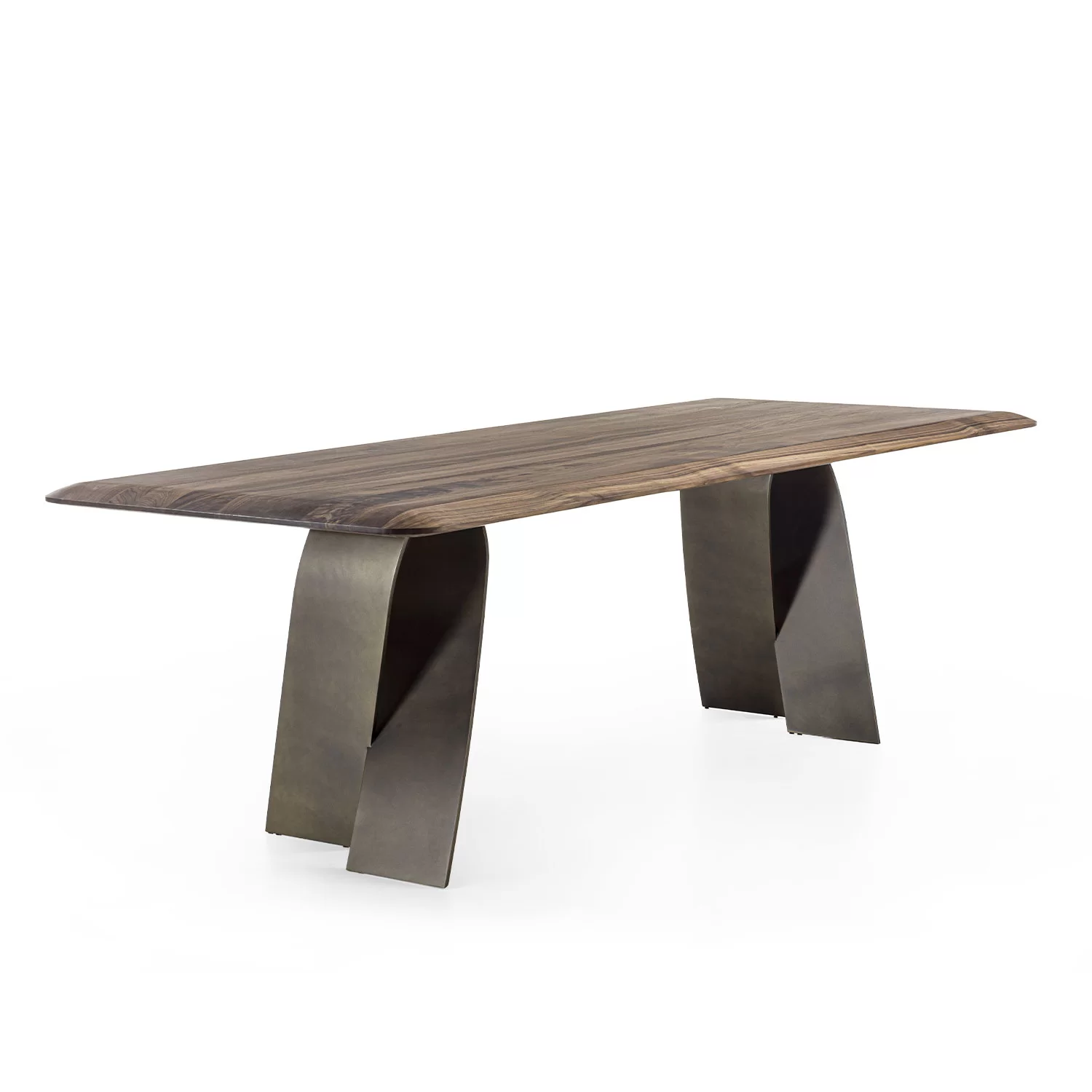 Tisch mit Massivholzplatte aus verleimten Leisten mit abgerundeten Kanten, die die Stärke verringern und Leichtigkeit verleihen, kombiniert mit Eisenbeinen, die sich wickeln und an die Flexibilität eines Bandes erinnern.