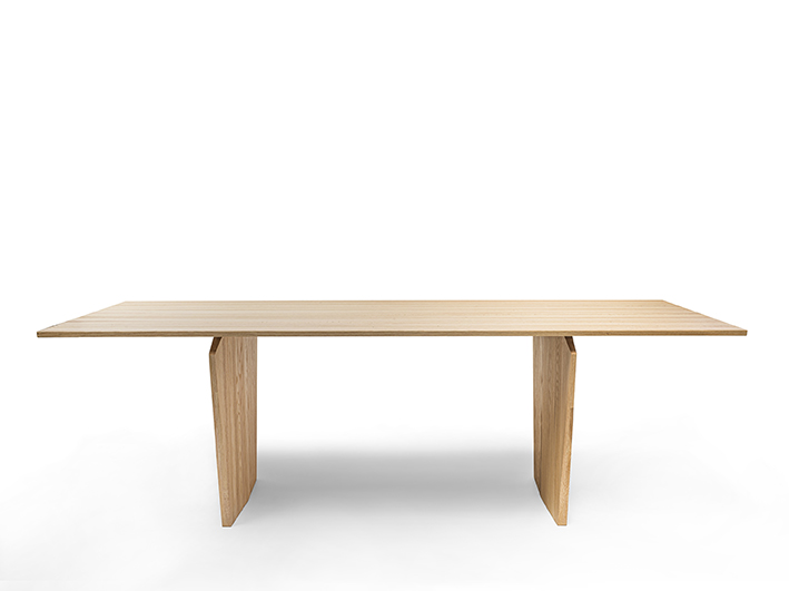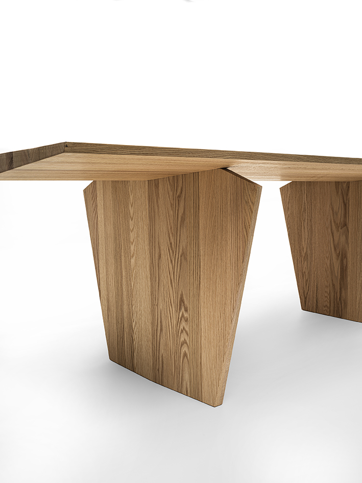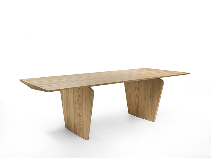 Tisch mit Platte bestehend aus verleimten Massivholzleisten und mit dünnen Kanten. Das Design erinnert an die Verarbeitung der Schnitzerei, als ob Holzblöcke geschnitzt und bis zur endgültigen Form bearbeitet würden.