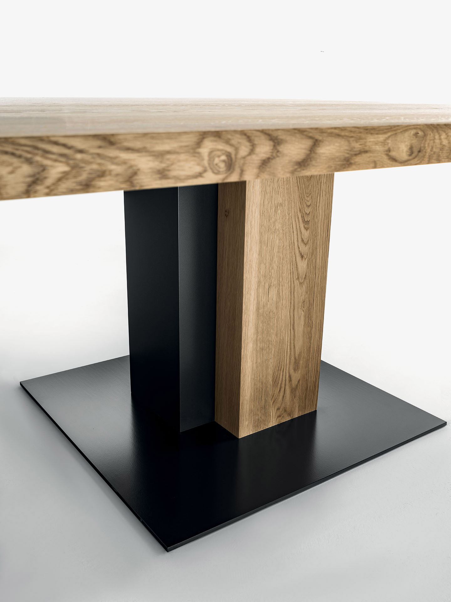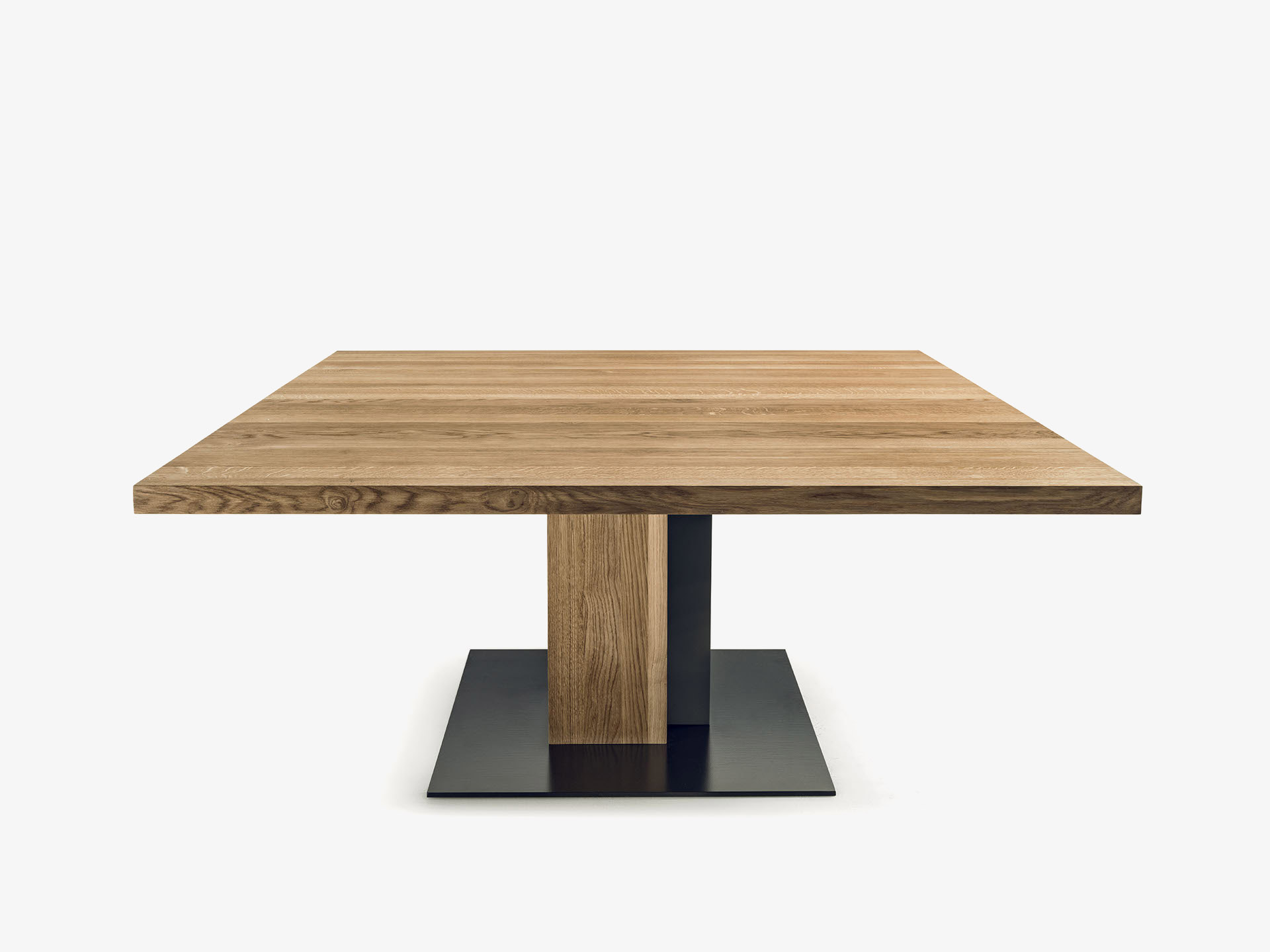 Quadratischer Tisch aus Massivholz, mit Bein bestehend aus zwei integrierten Quadern, wie ein Gegenstand und sein Schatten. Verbindung zwischen Massivholz, aus verleimten Leisten, und einem Teil aus Eisen. Bodenplatte aus Eisen.