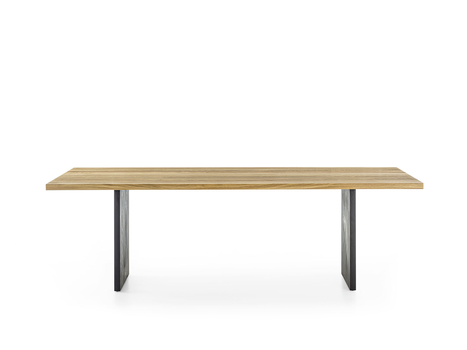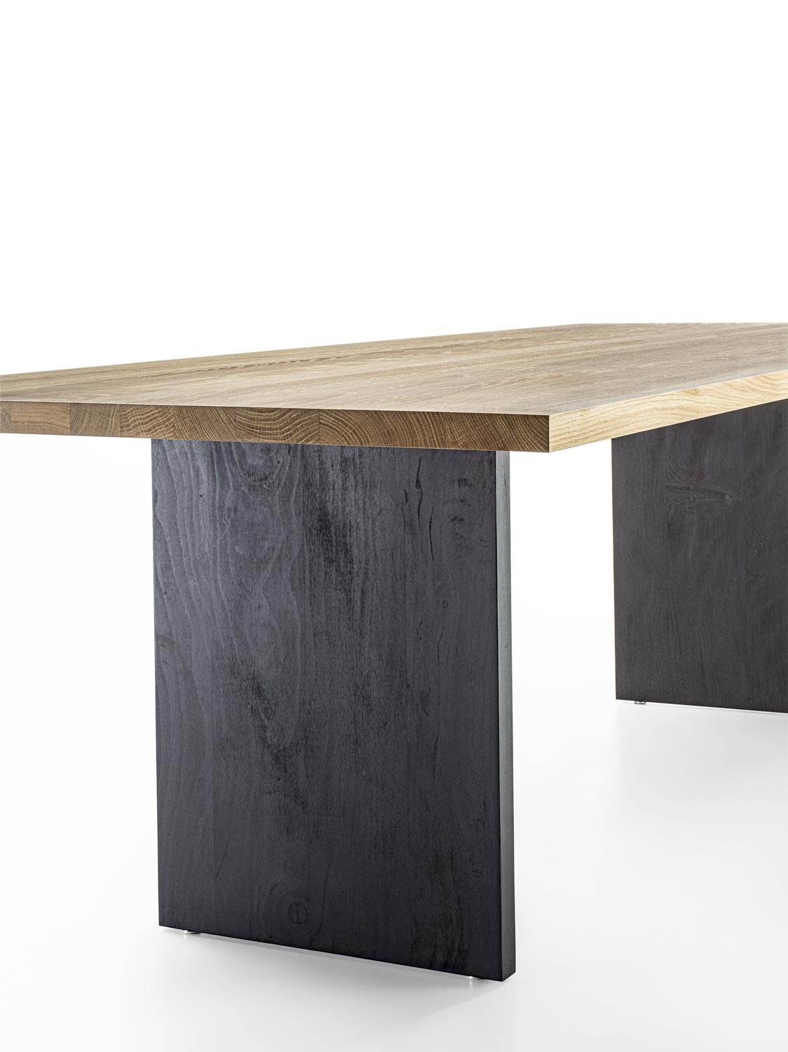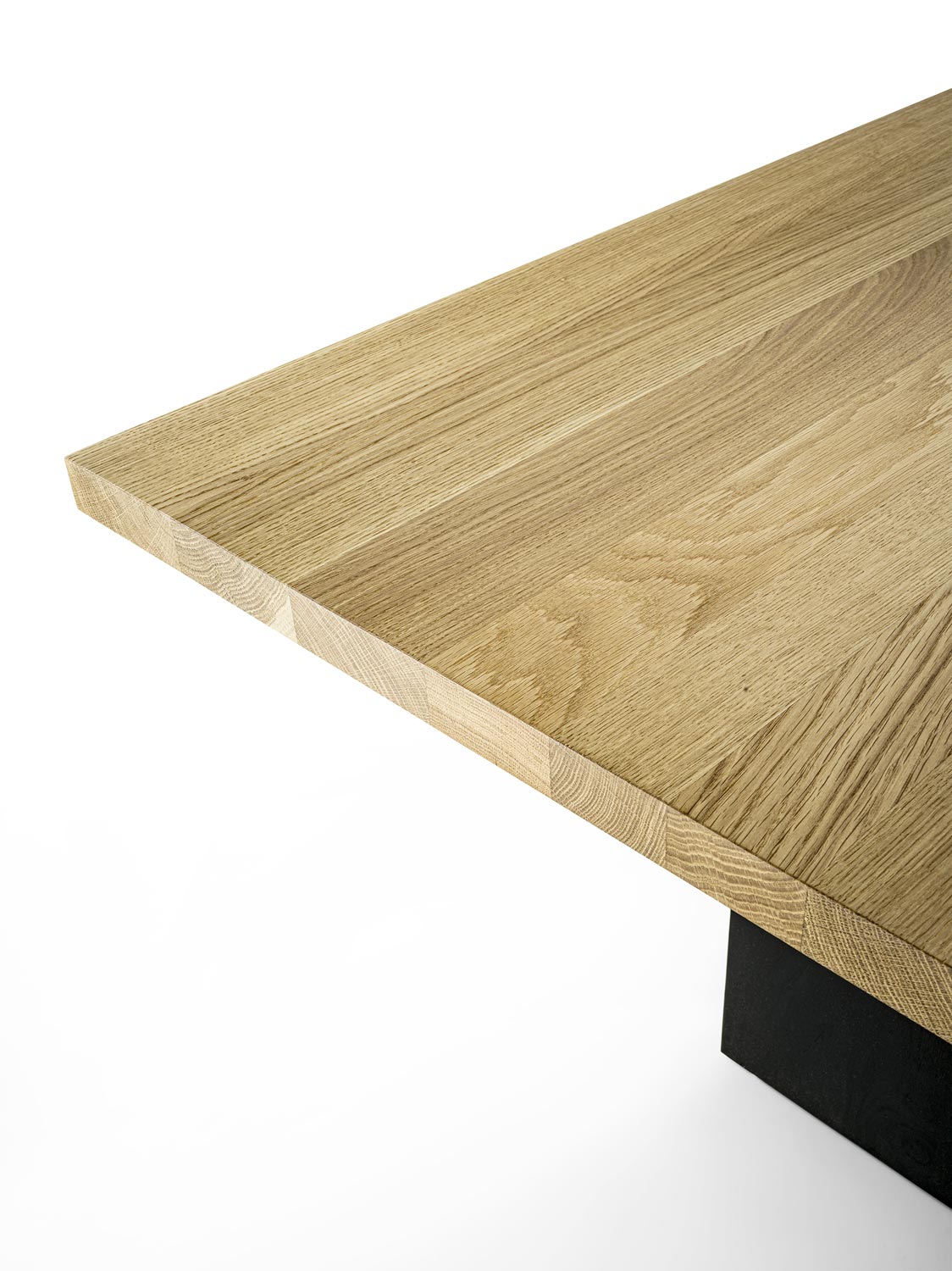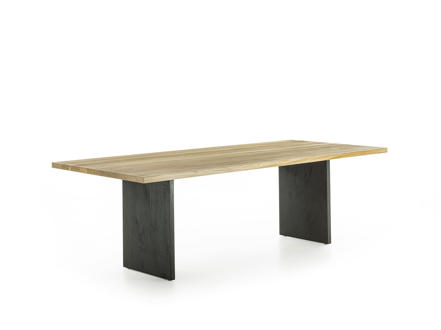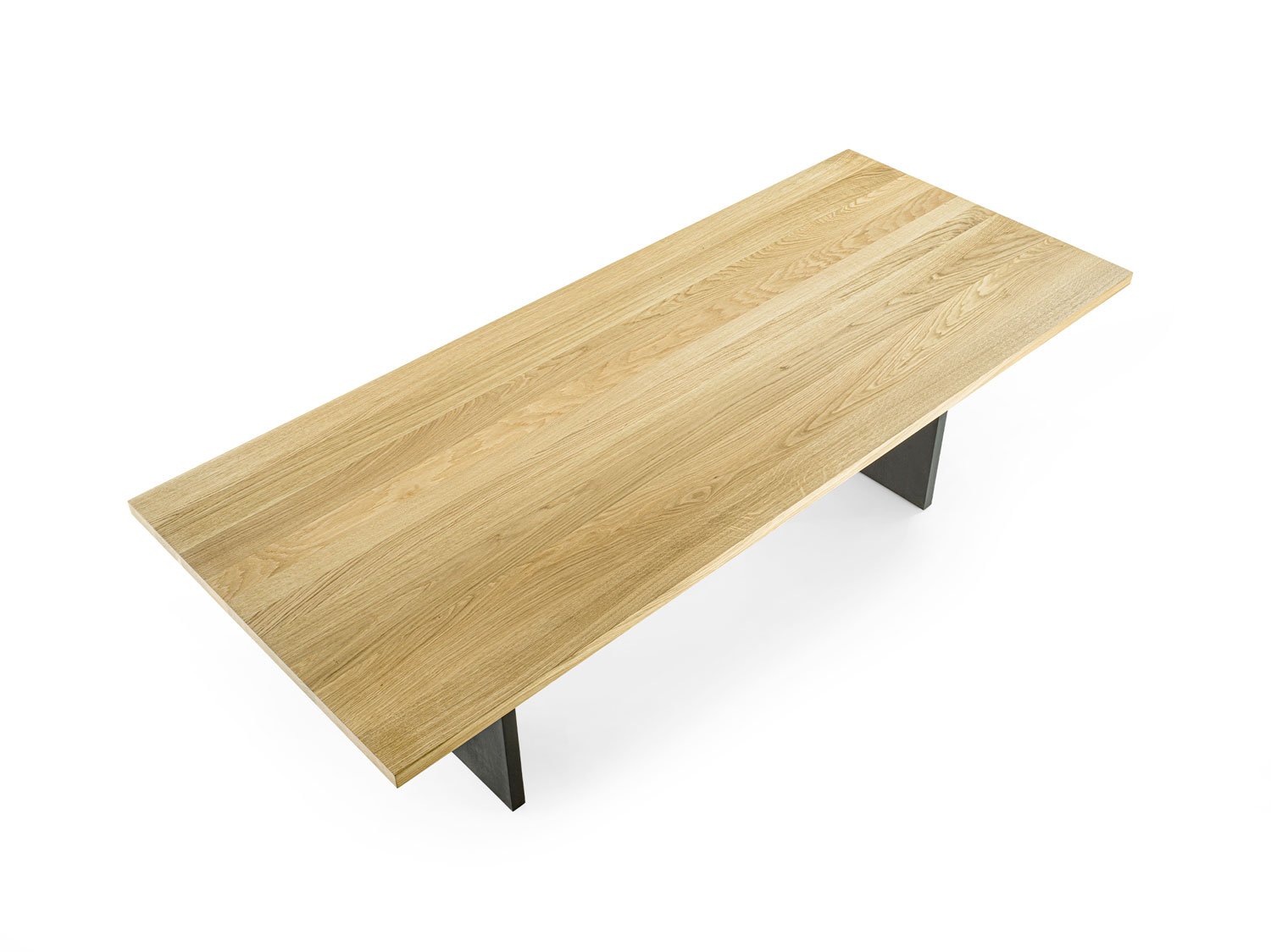 Tisch mit einer Massivholzplatte aus verleimten Leisten mit geraden Kanten. Das Gestell besteht aus Massivholzwangen.