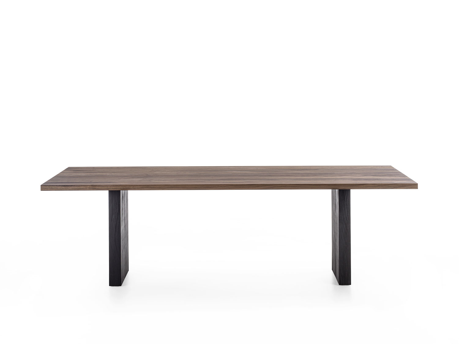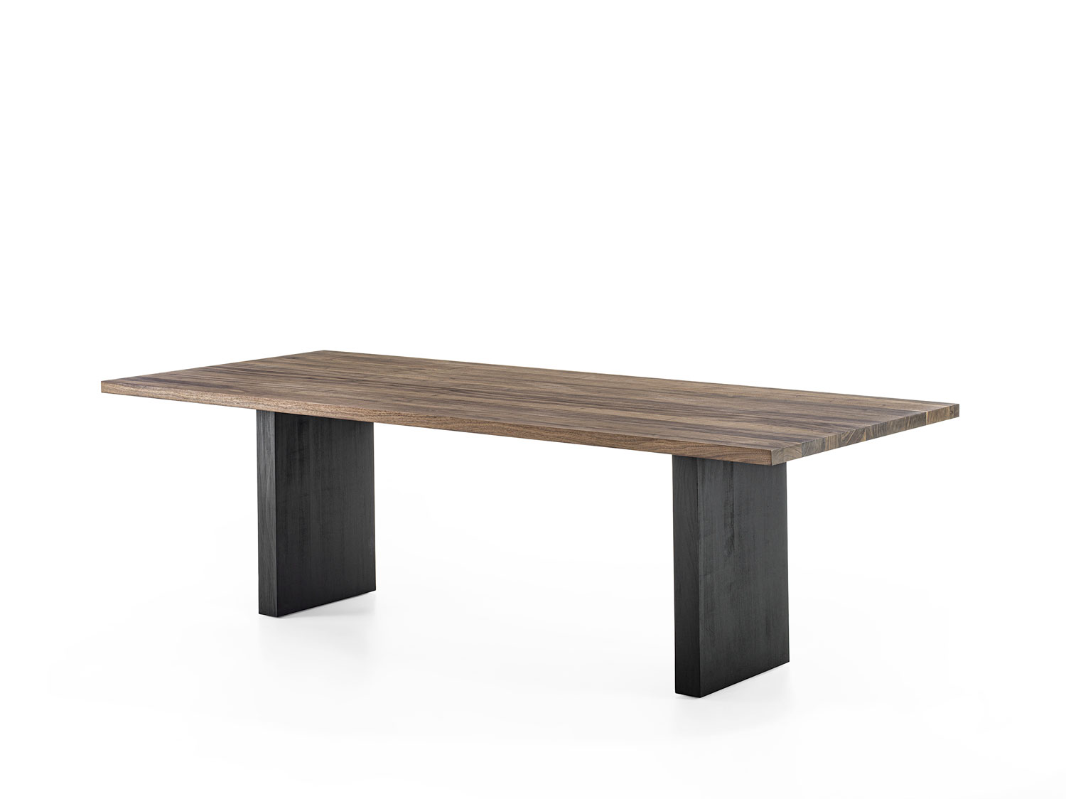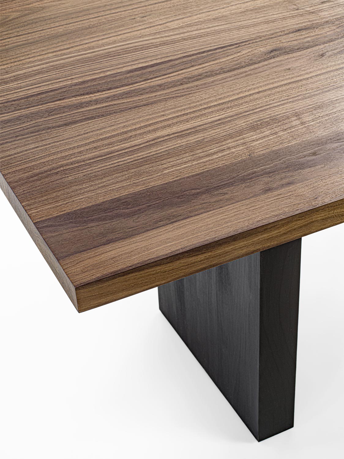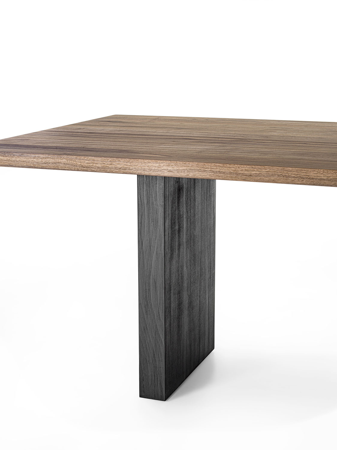 Tisch mit einer Massivholzplatte aus verleimten Leisten mit geraden Kanten. Das Gestell besteht aus 8 cm dicken Massivholzbeinen – daher der Name „DOUBLE“, da die Beine doppelt so dick sind wie die 4 cm starke Tischplatte.