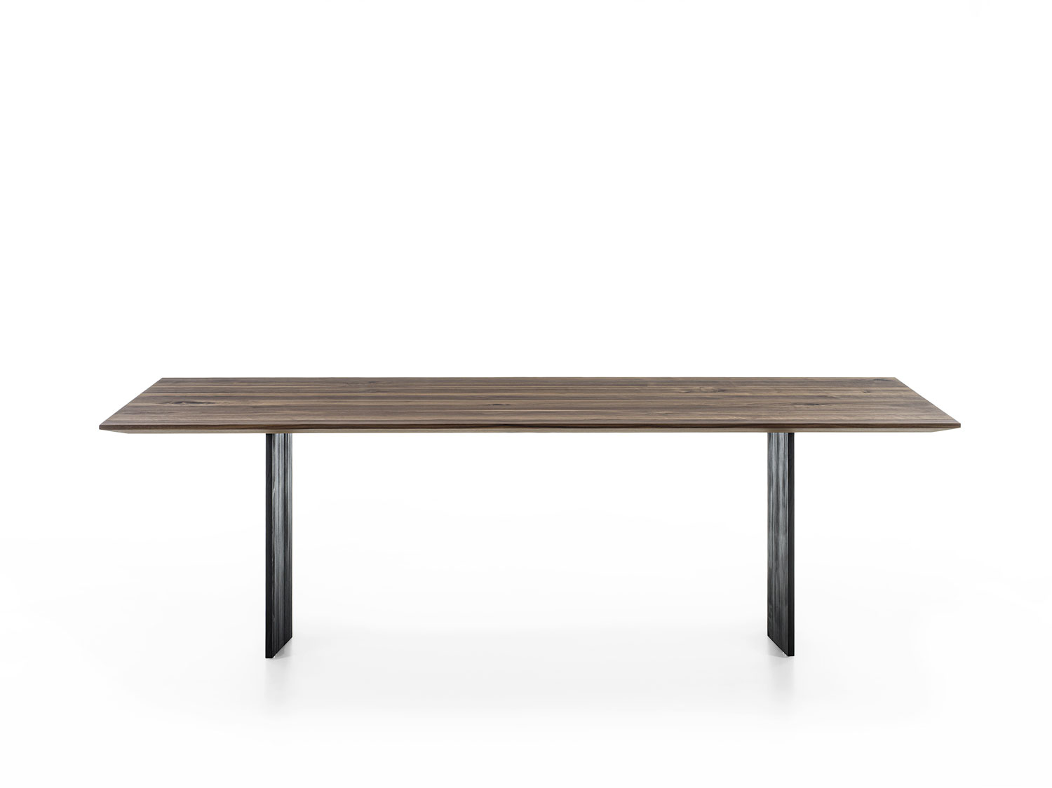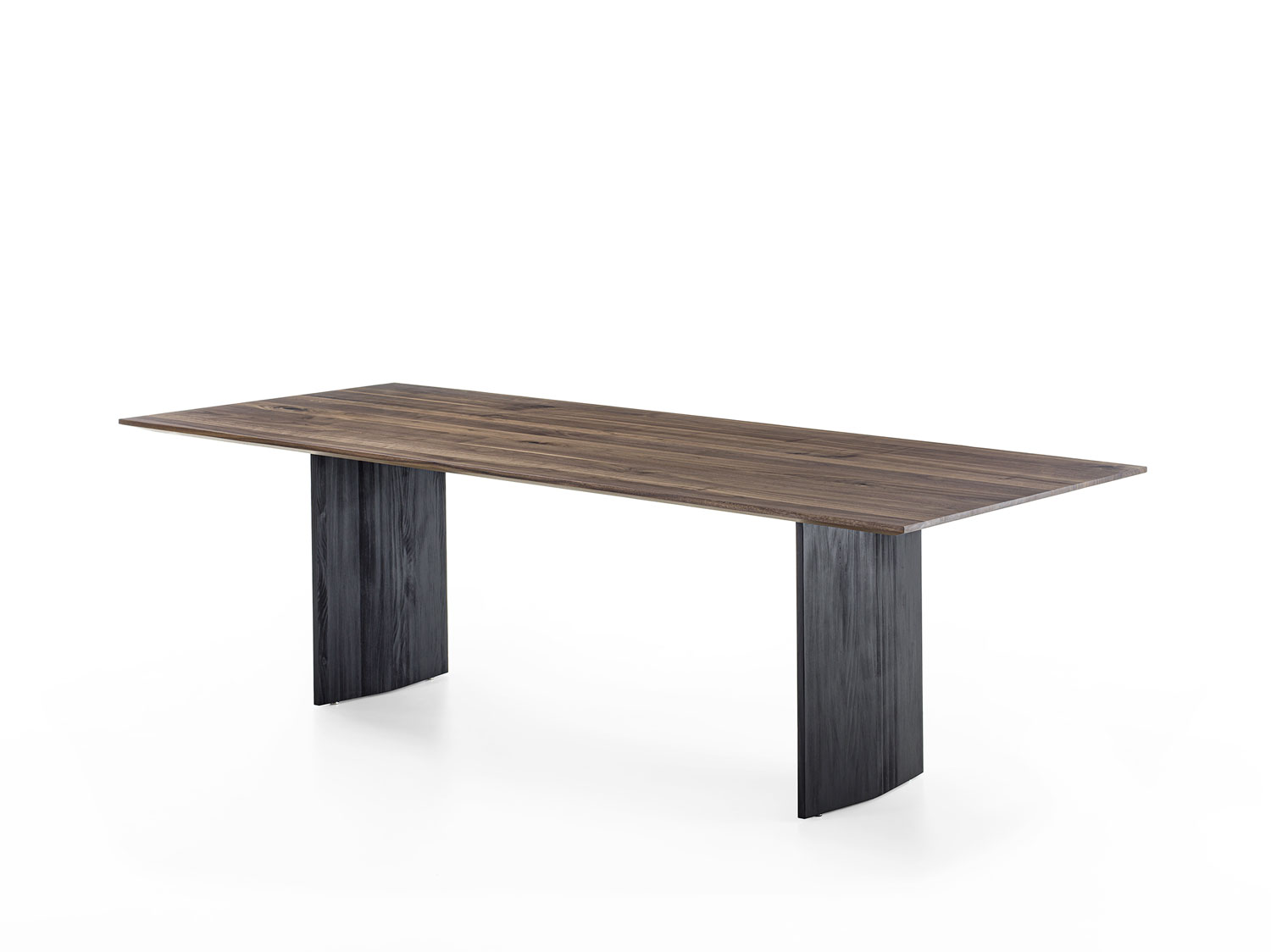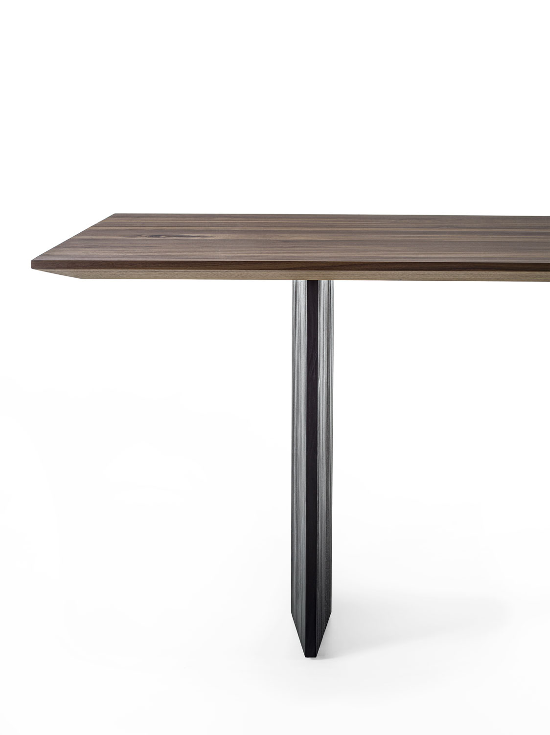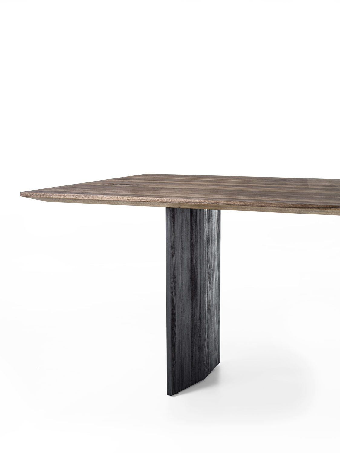 Tisch mit einer Massivholzplatte aus verleimten Leisten mit schrägen und dünnen Kanten kombiniert mit rautenförmigen Massivholzwangen.