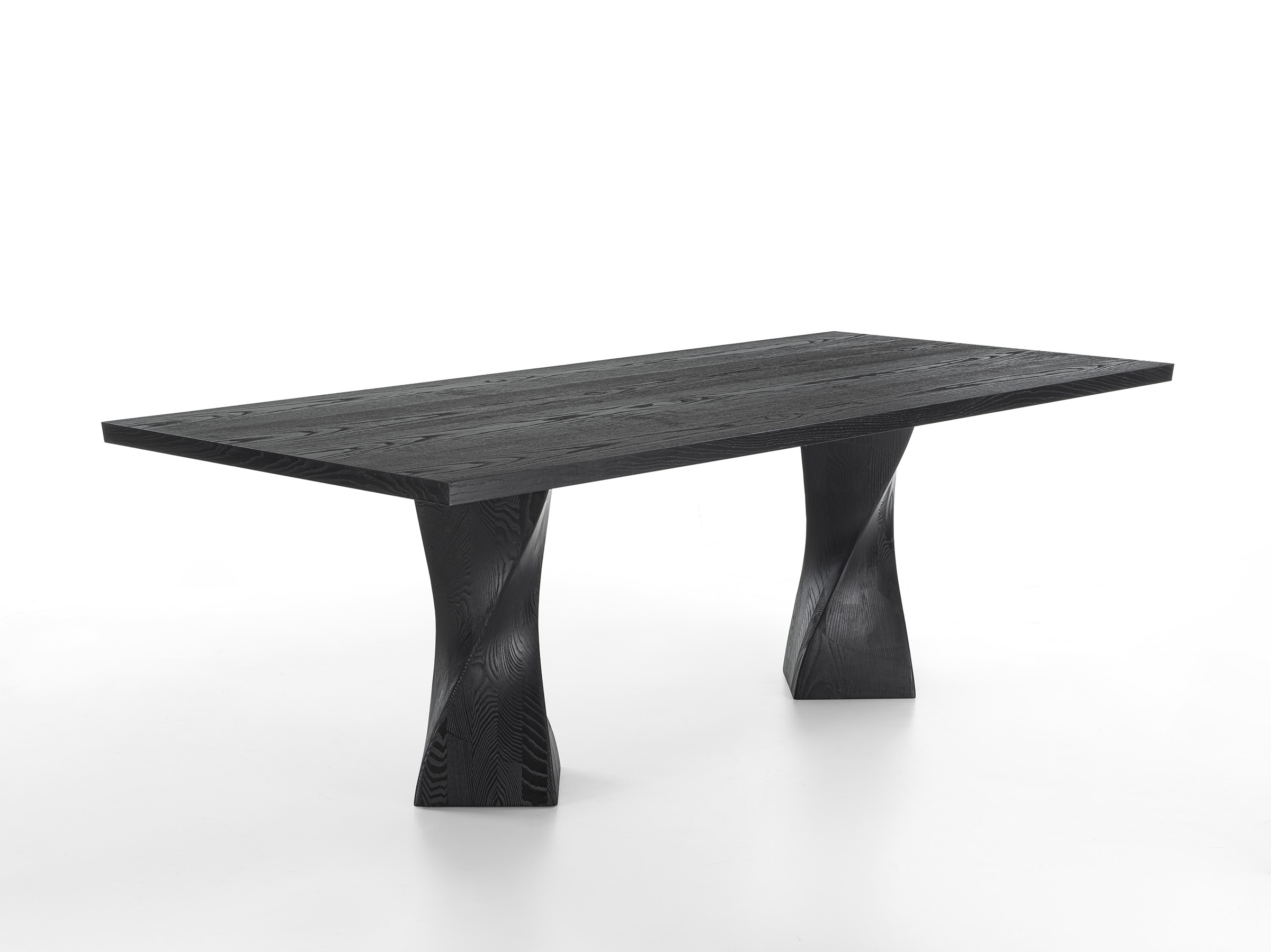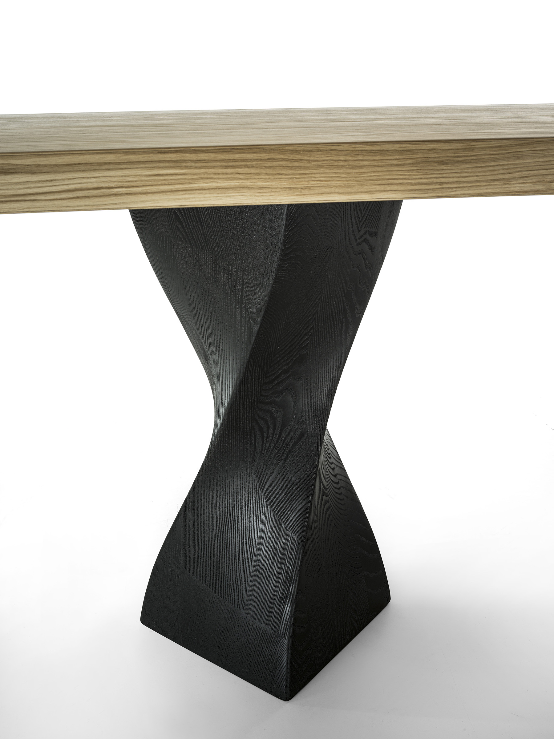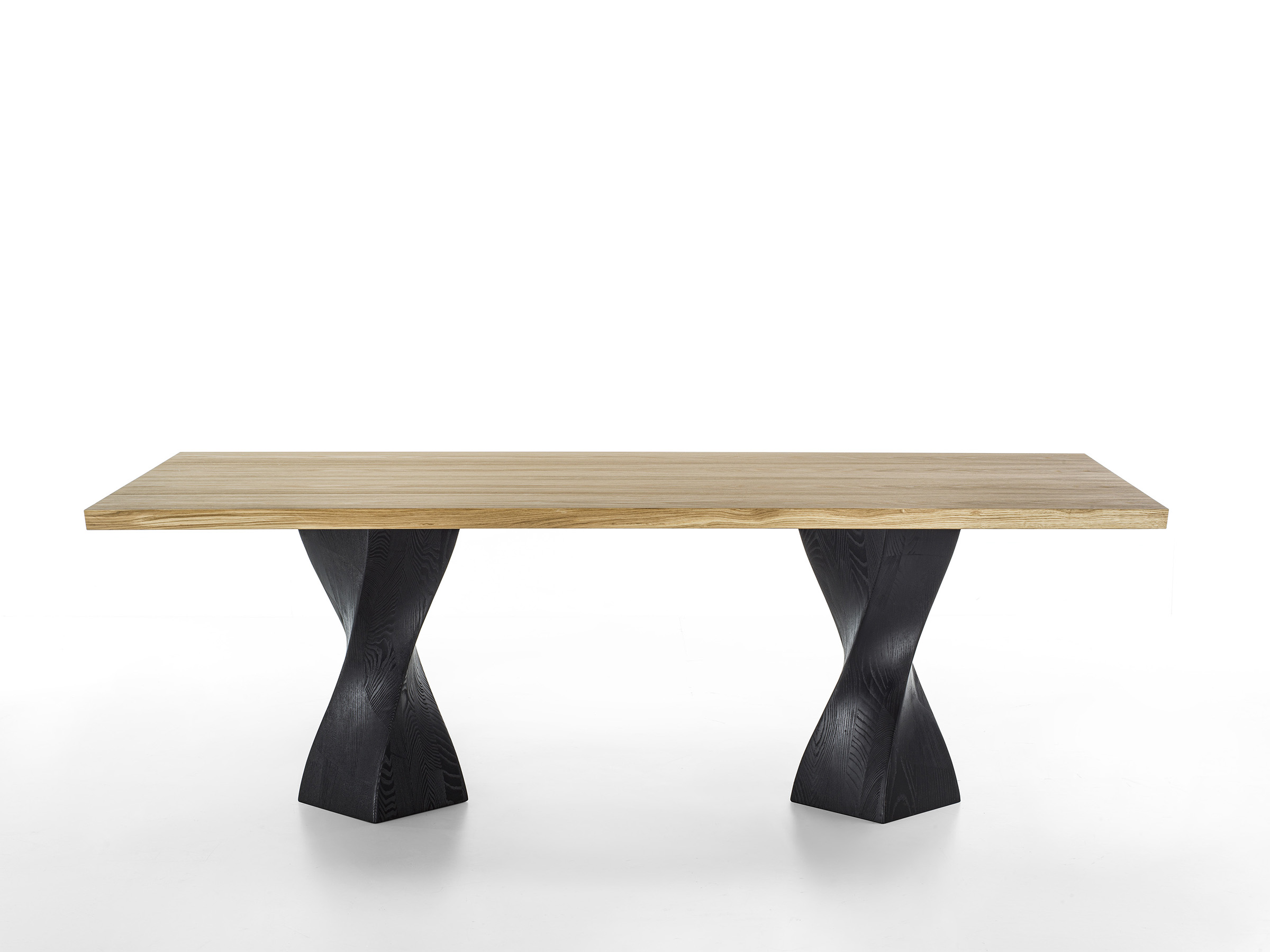 Tisch mit Platte aus furnierter Tischlerplatte. Er zeichnet sich durch zwei pigmentierte Beine aus Massivholz aus. Die Verarbeitung verleiht ihm Bewegung und Dynamik.
