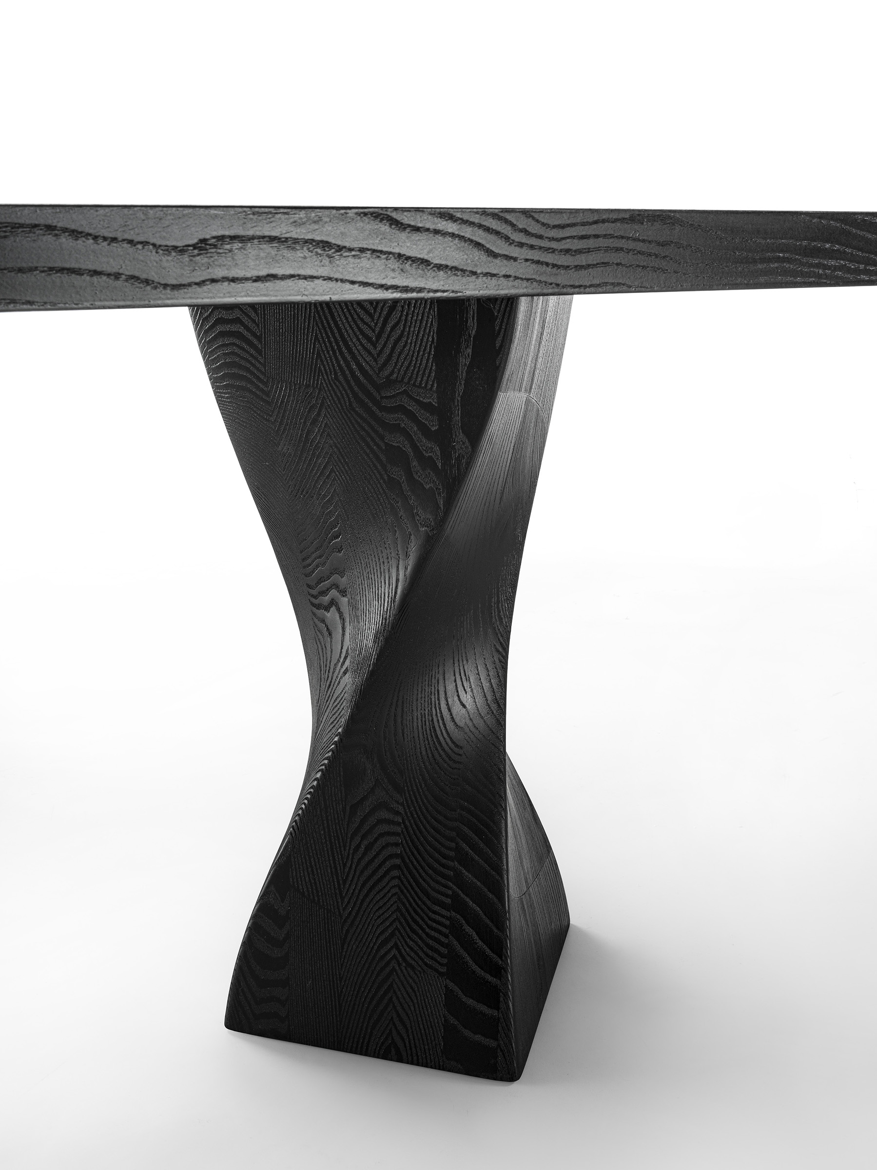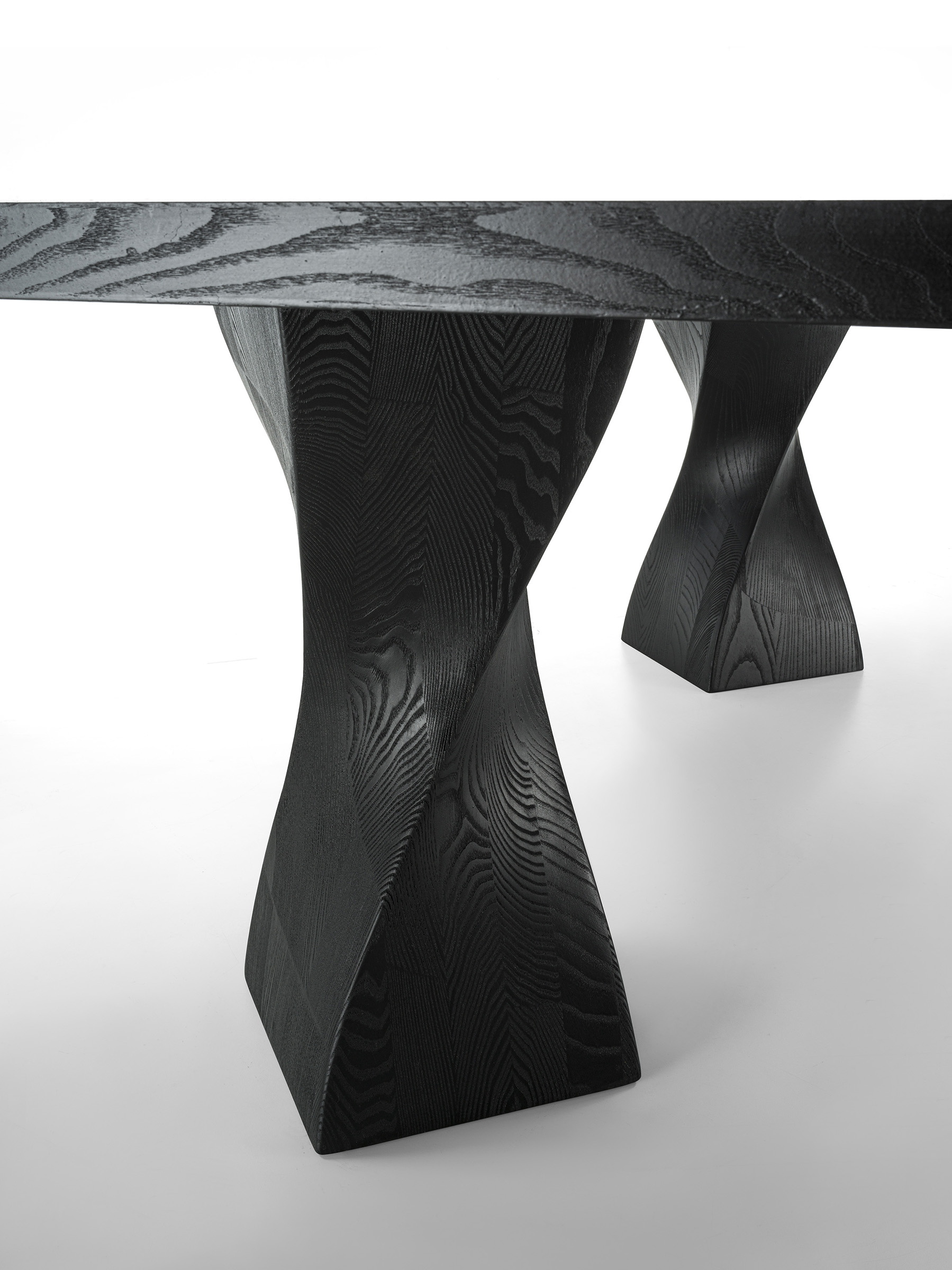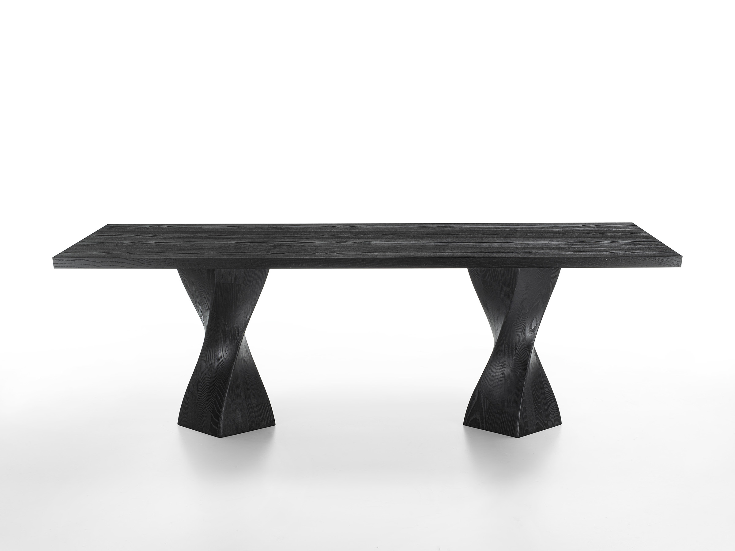 Tisch mit Platte aus furnierter Tischlerplatte. Er zeichnet sich durch zwei pigmentierte Beine aus Massivholz aus. Die Verarbeitung verleiht ihm Bewegung und Dynamik.