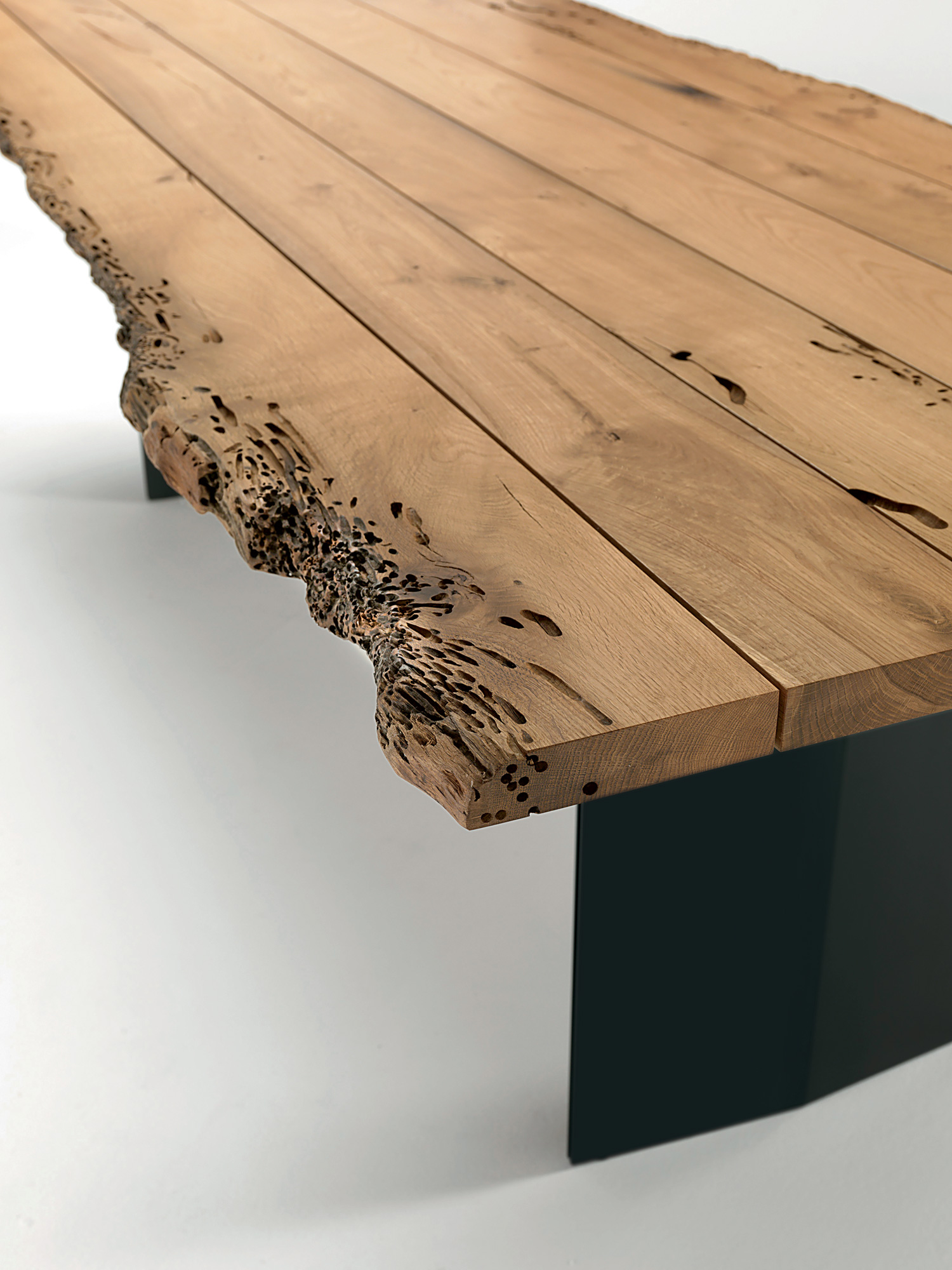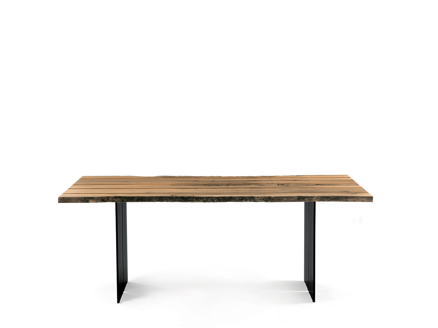 Tisch mit Platte aus Brettern in Briccola, nicht verleimt, mit Naturkanten. Gestell aus Eisen in charakteristischer Rautenform.