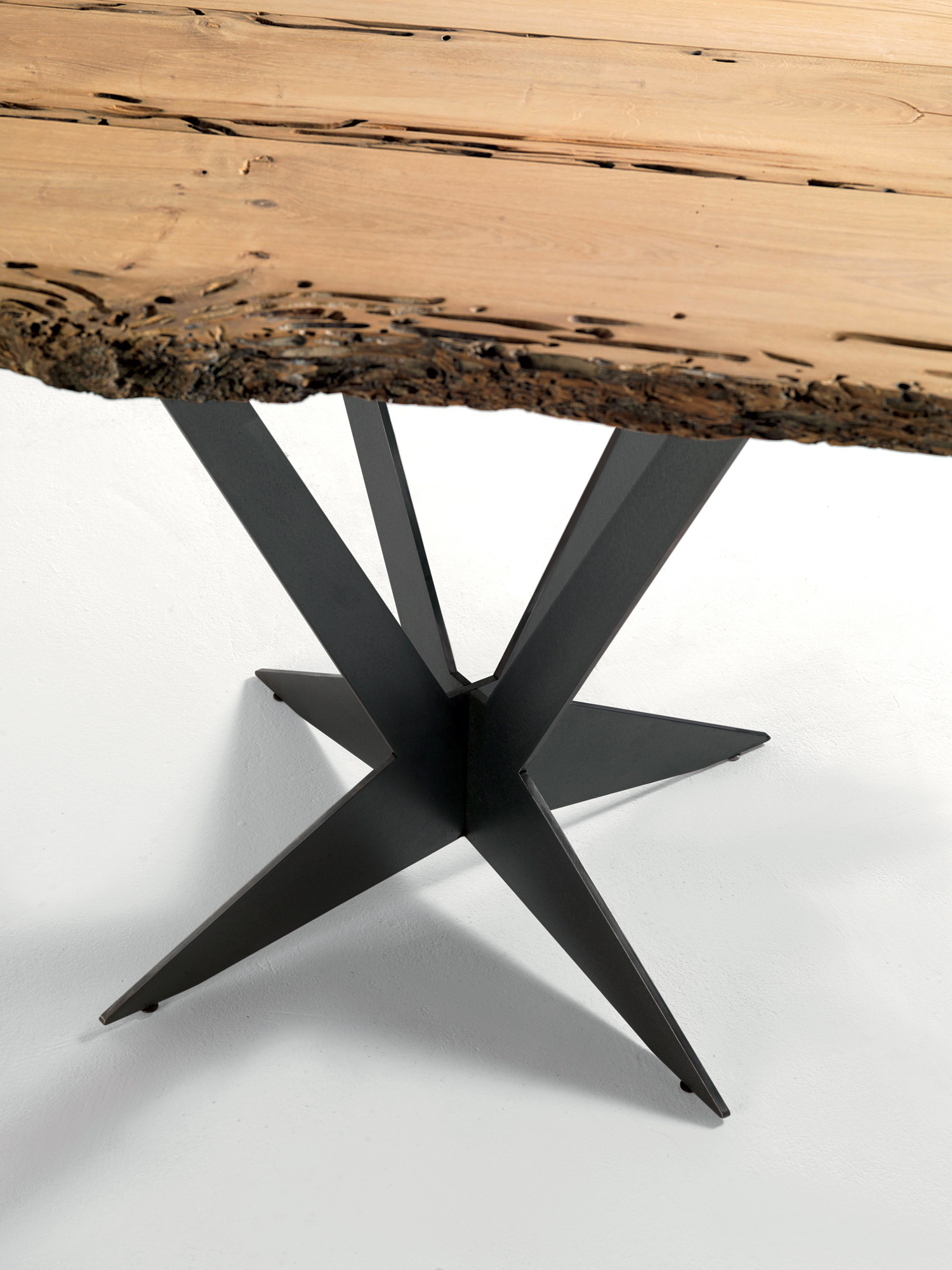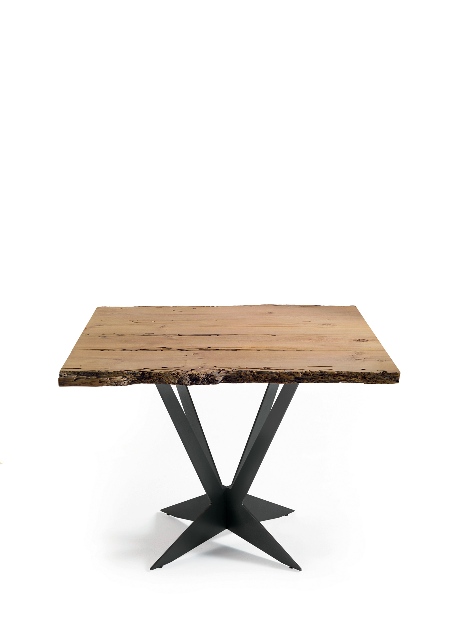 Kleiner quadratischer Tisch aus Briccola mit Platte Brettern nicht verleimt, und zwei Naturkanten. Mittelfuß aus Natureisen in Sternform.