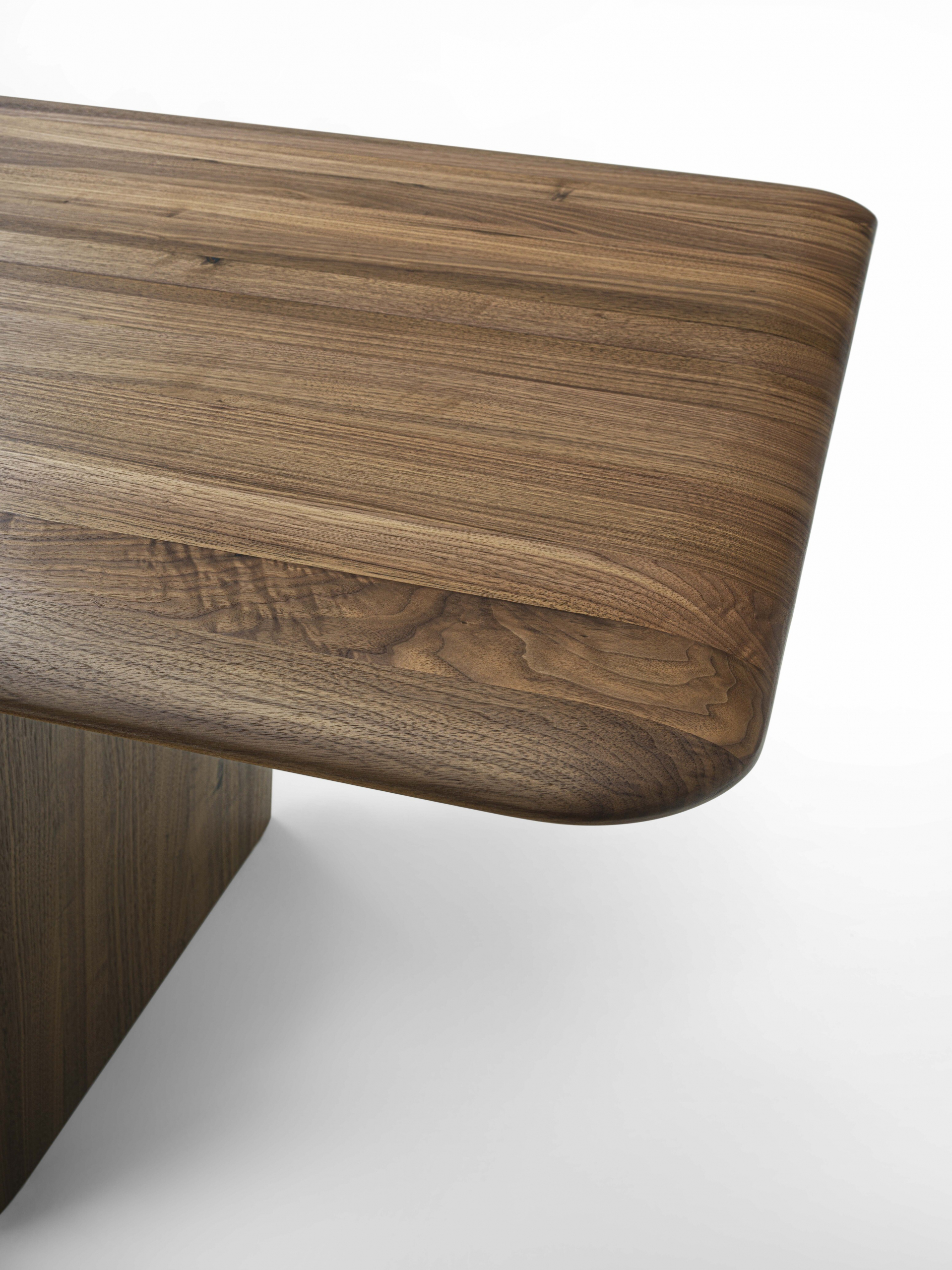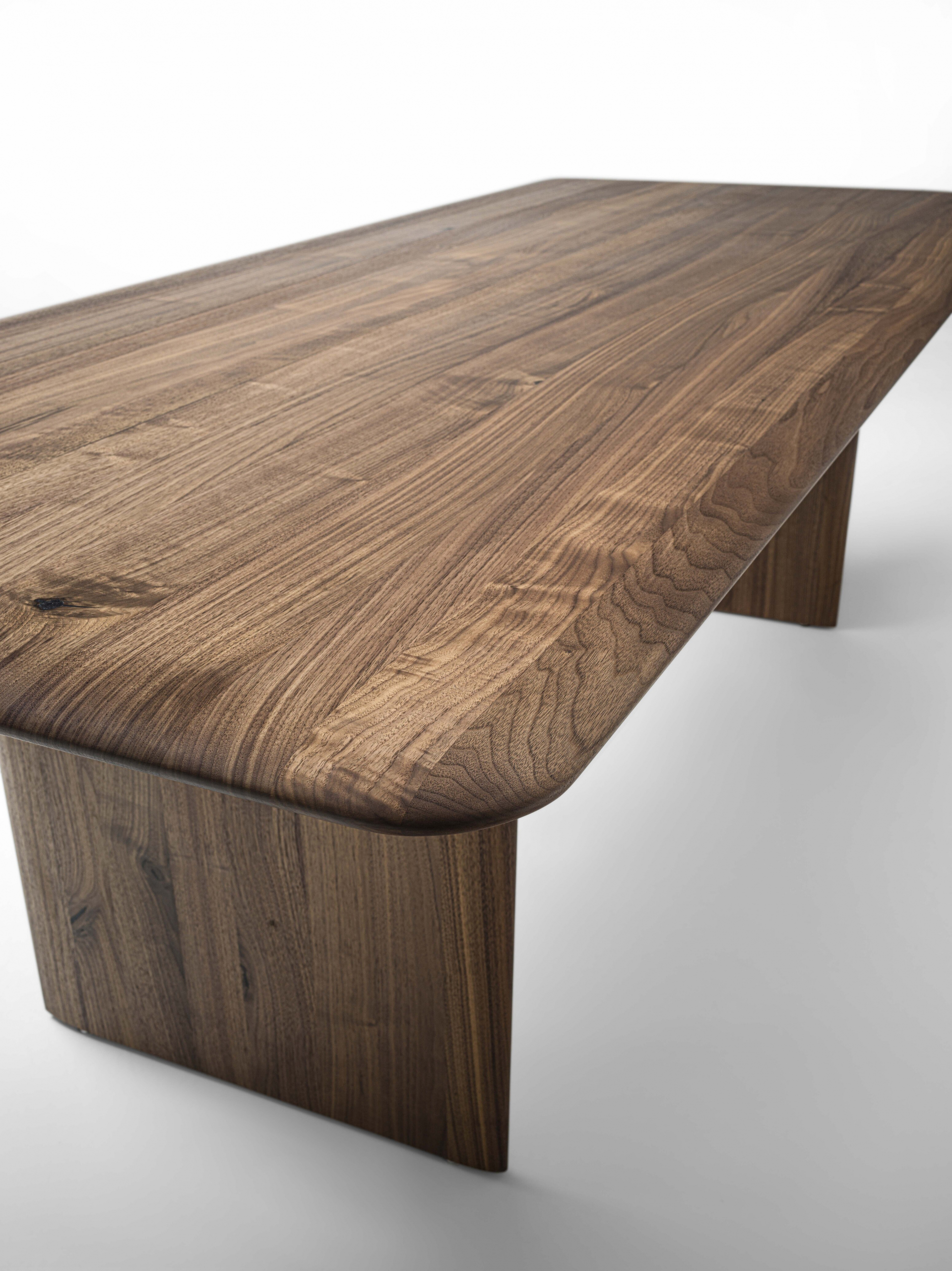 Tisch vollständig aus Massivholz, bestehend aus verleimten Brettern. Die Tischplatte besticht durch die abgerundeten Ecken, folglich auch die der Tischkante und überzeugt durch sein leichtes Design mit charakterstarker Solidität.