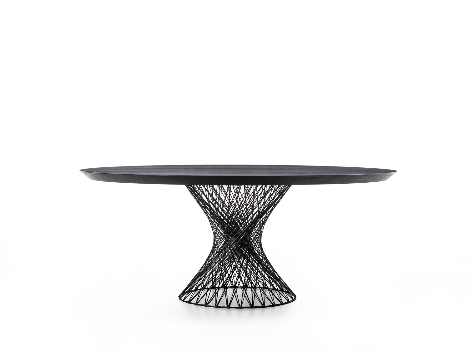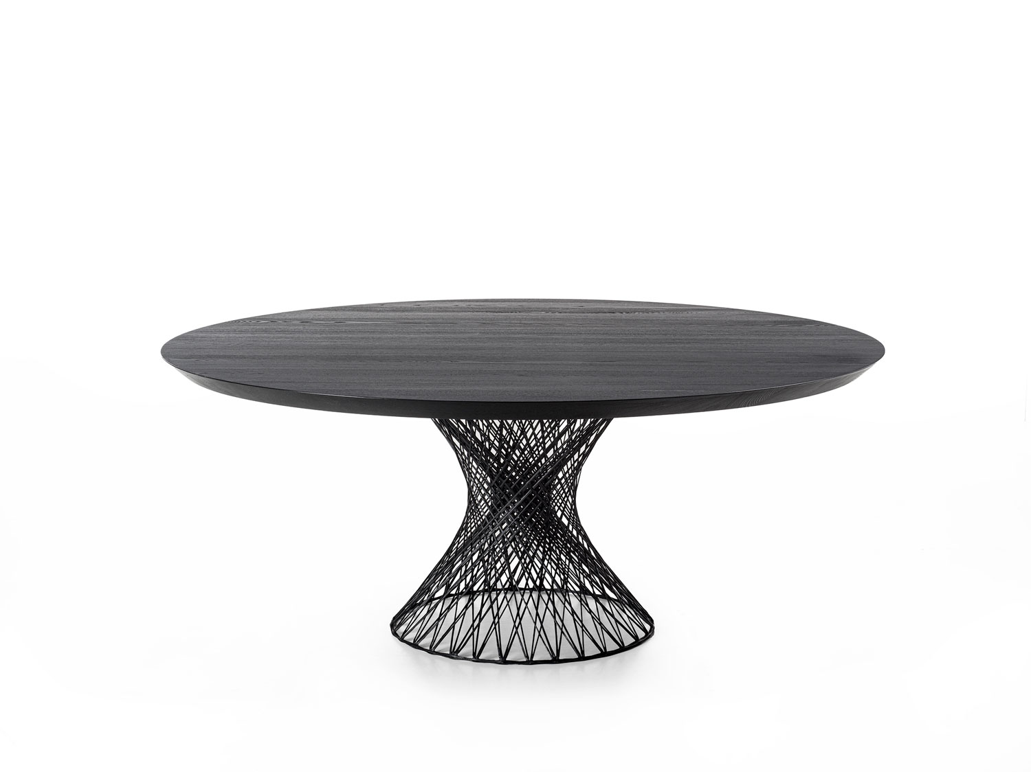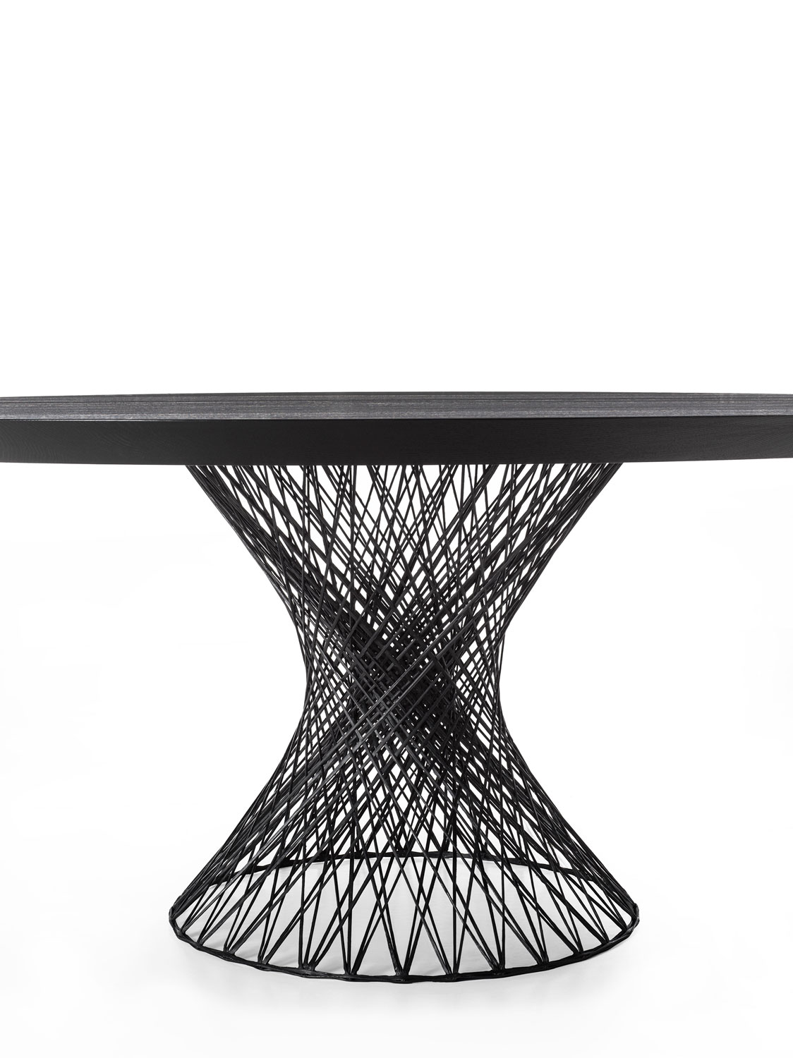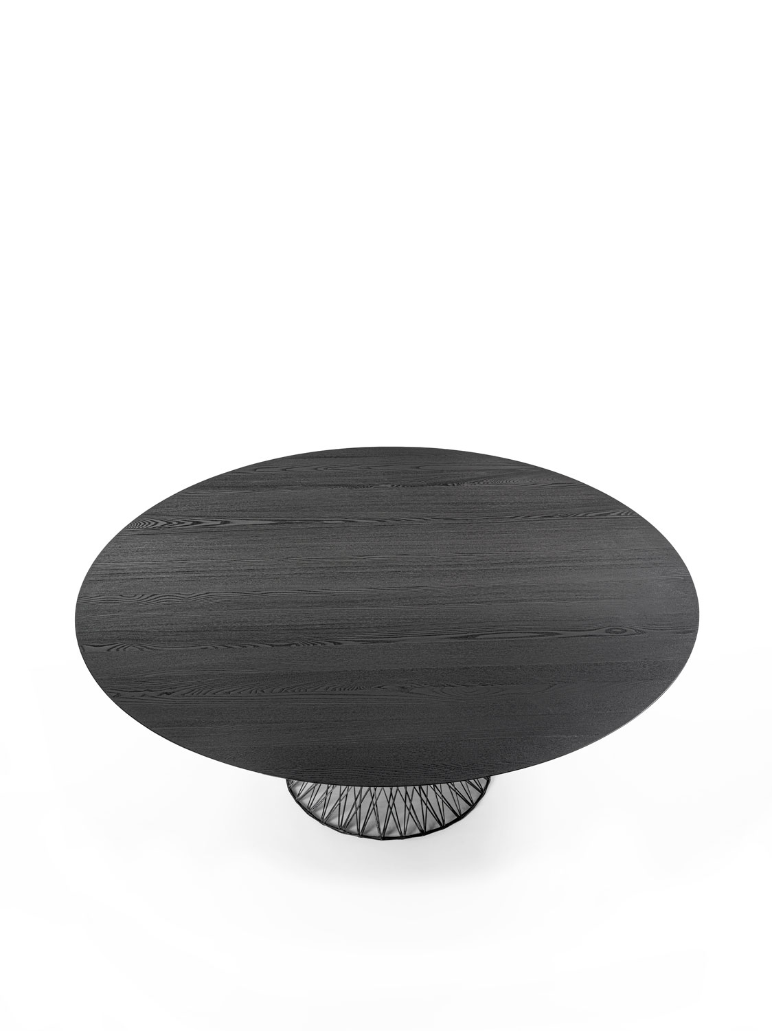Tisch mit runder Tischplatte aus geleimten Massivholzbohlen, die von einem Sockel aus geflochtenen Kohlenstahlfasern getragen wird. Trotz der Leichtigkeit des Materials garantiert die Struktur des Sockels eine hohe Belastbarkeit und trägt das Gewicht der massiven Tischplatte problemlos.