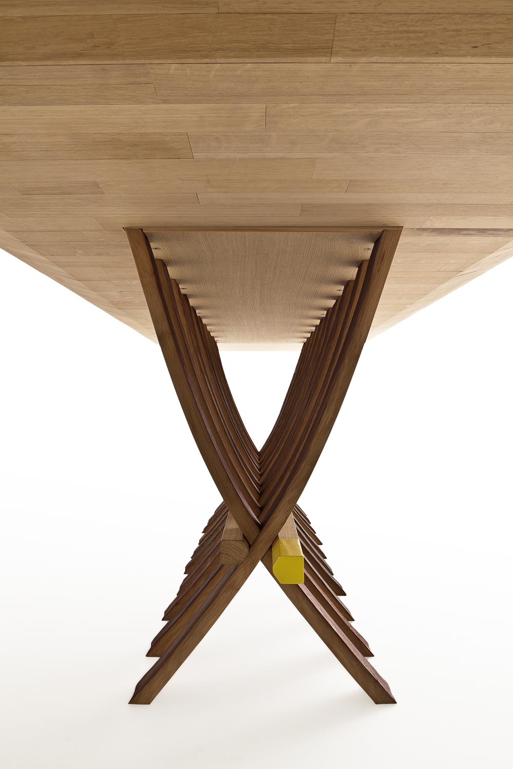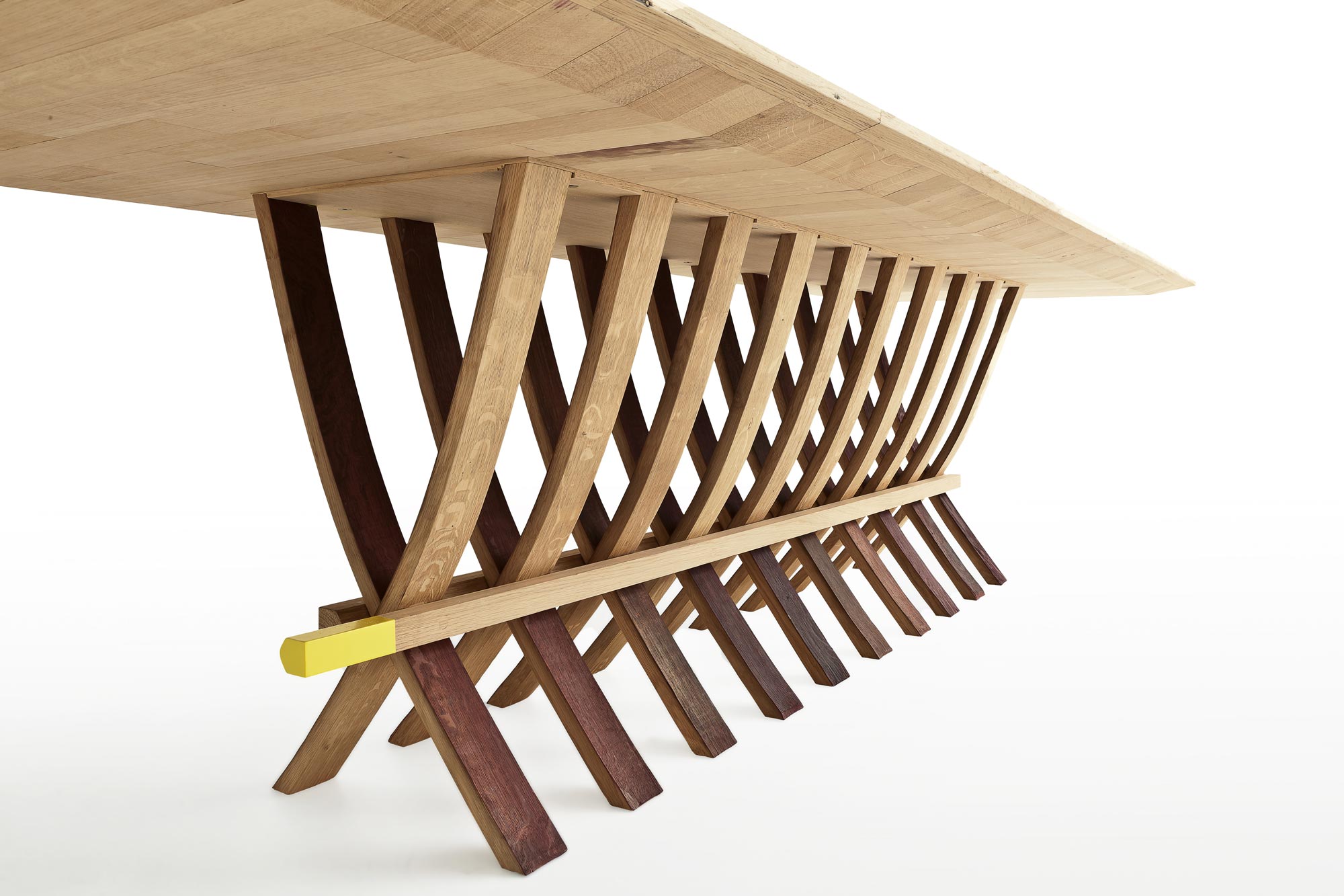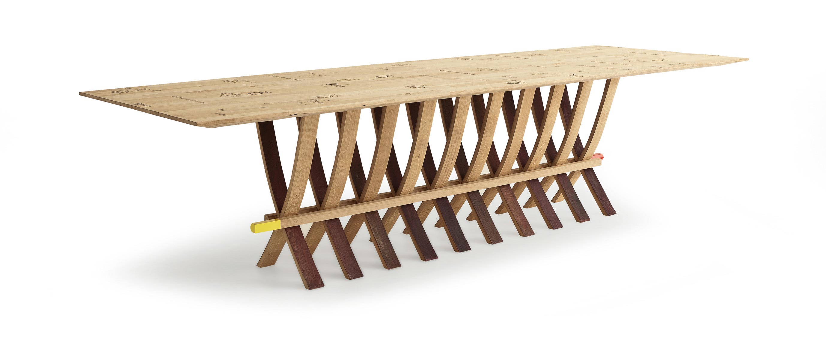 Tisch mit verleimter Eichenplatte mit verjüngten Kanten. Die Barrique-Latten prägen die Form des Sockels, der an majestätische antike Schiffe erinnert.