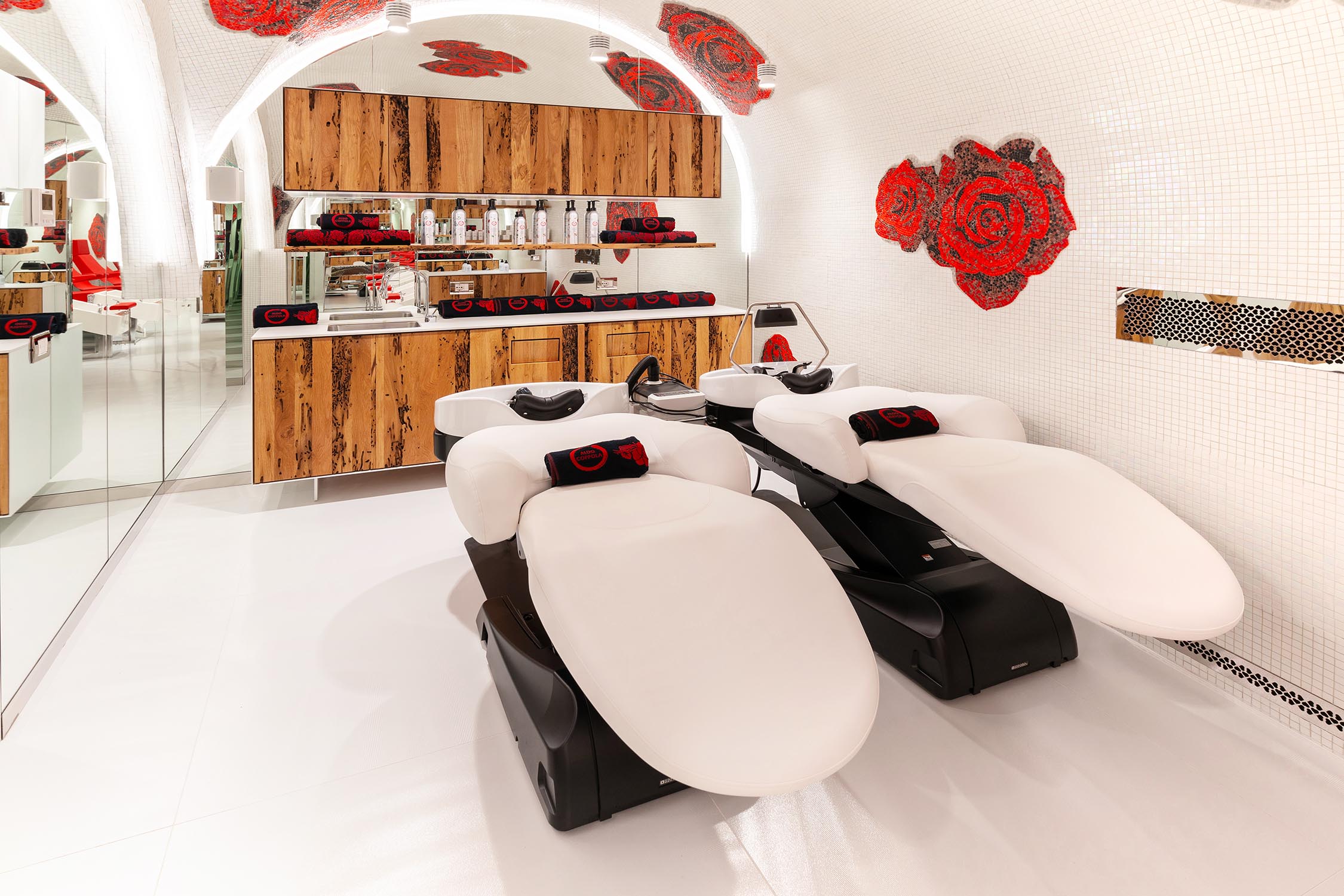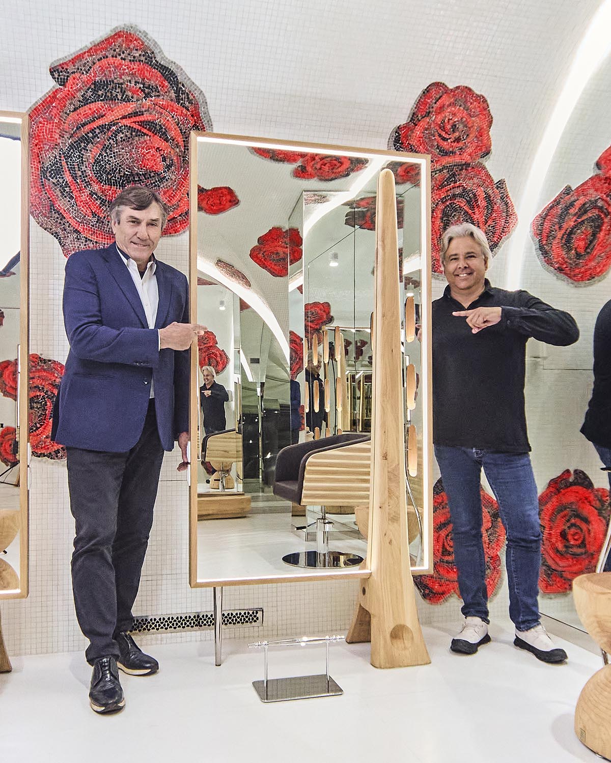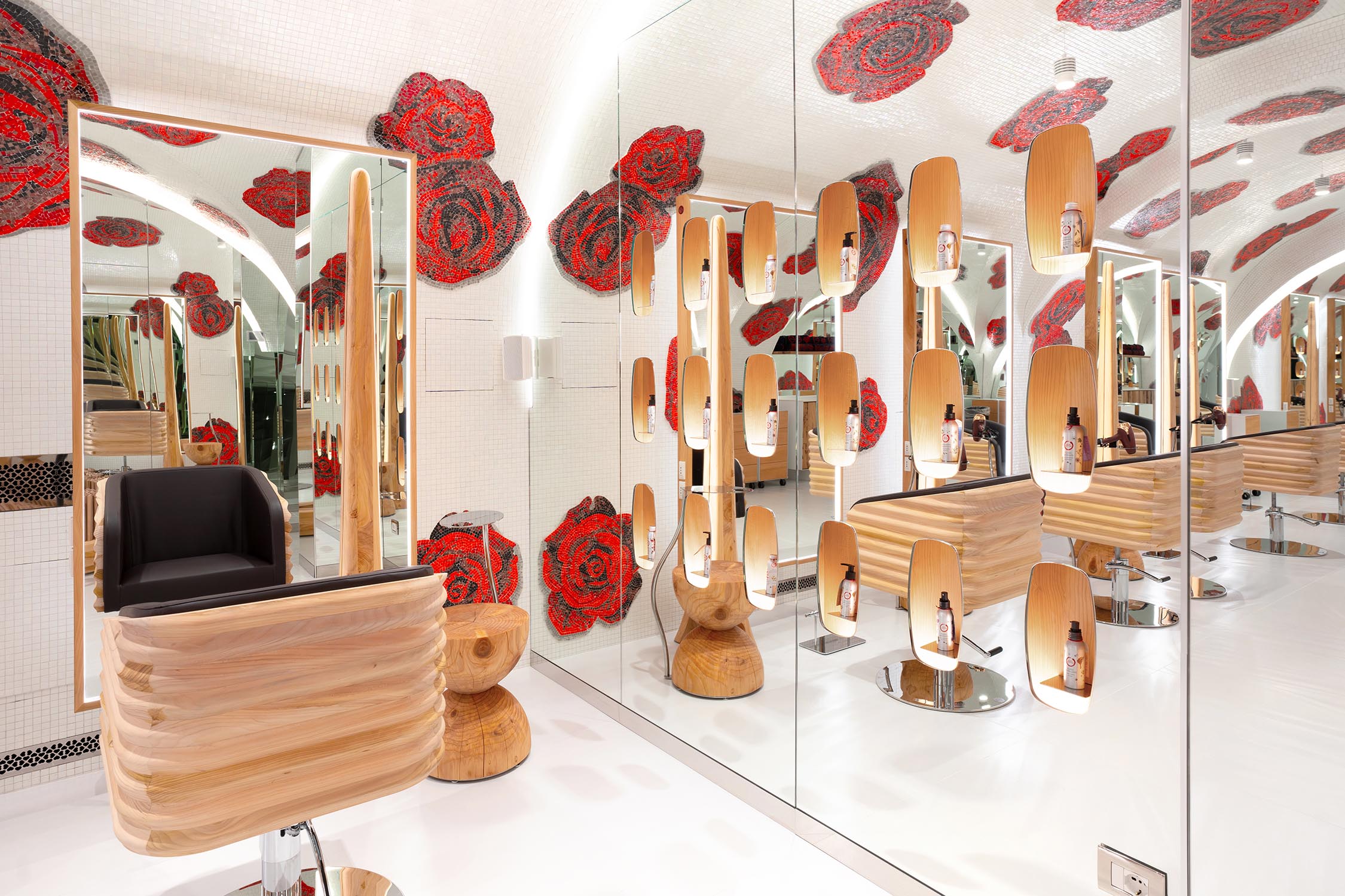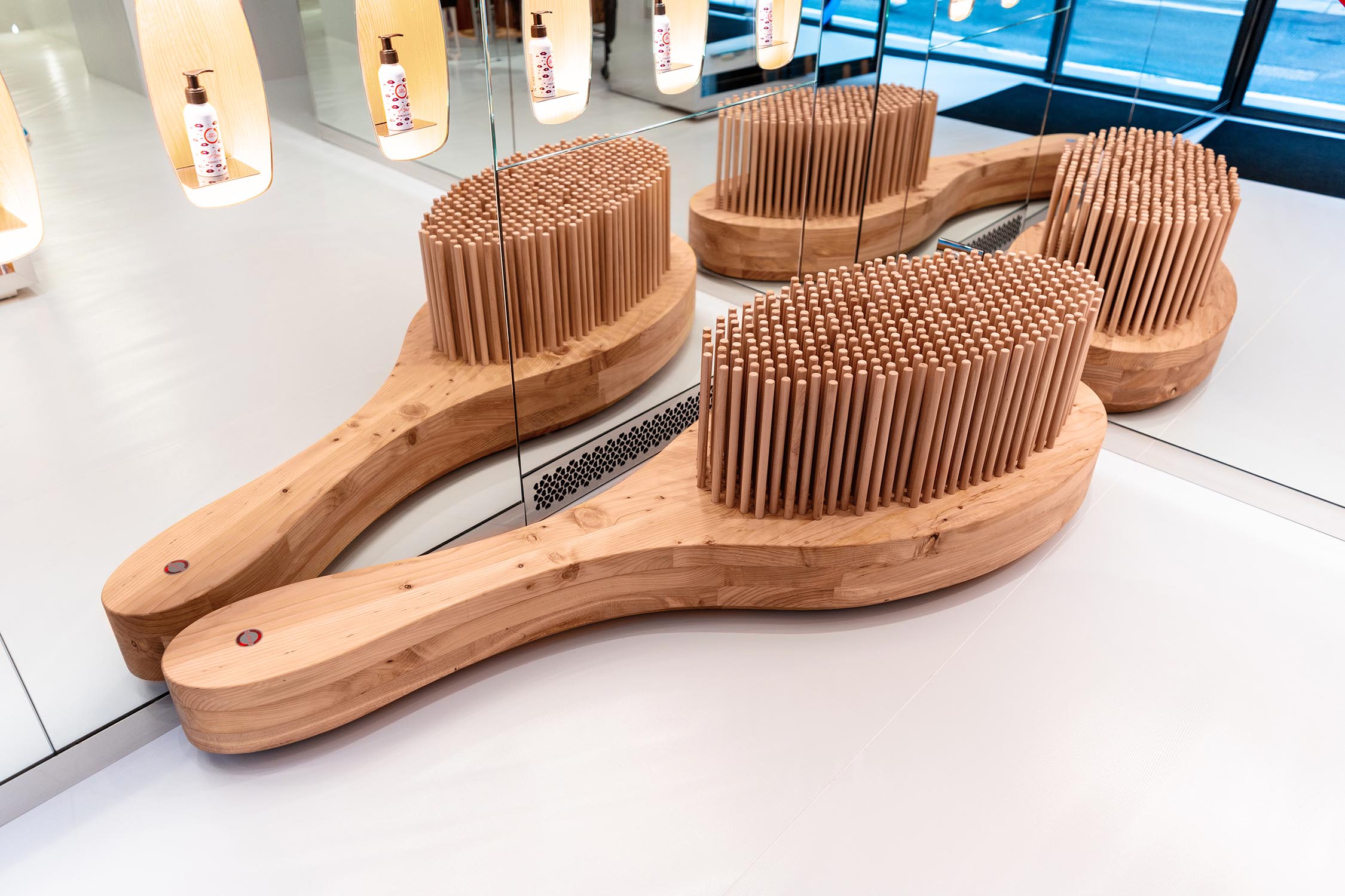 Letztere wurde für die Herstellung der Arbeitsplätze mit den Spiegelstationen BEKKUCCIO, Wartebereich-Sofas in Bürstenform AUDREY (inspiriert von der ikonischen Aldo Coppola-Bürste), die neuen Sessel KOMODA, die Design und Komfort vereinen, sowie für den Garderobenschrank LA PETTINEUSE, einen großen Kleiderständer in Kammform, eingesetzt.