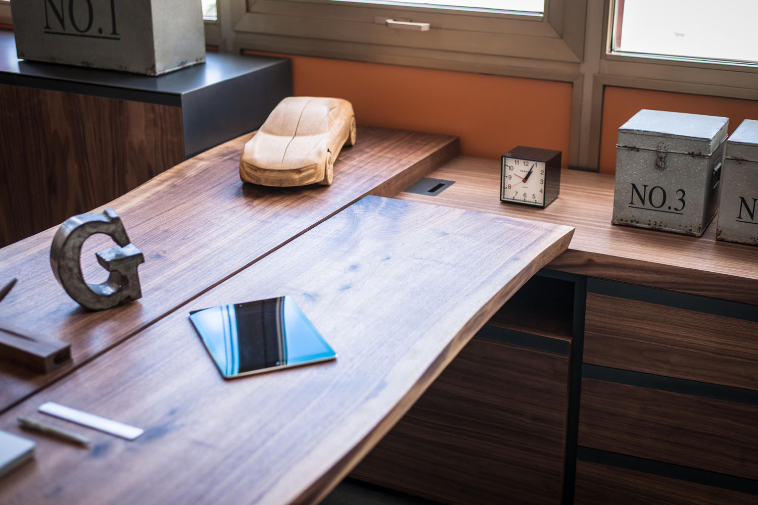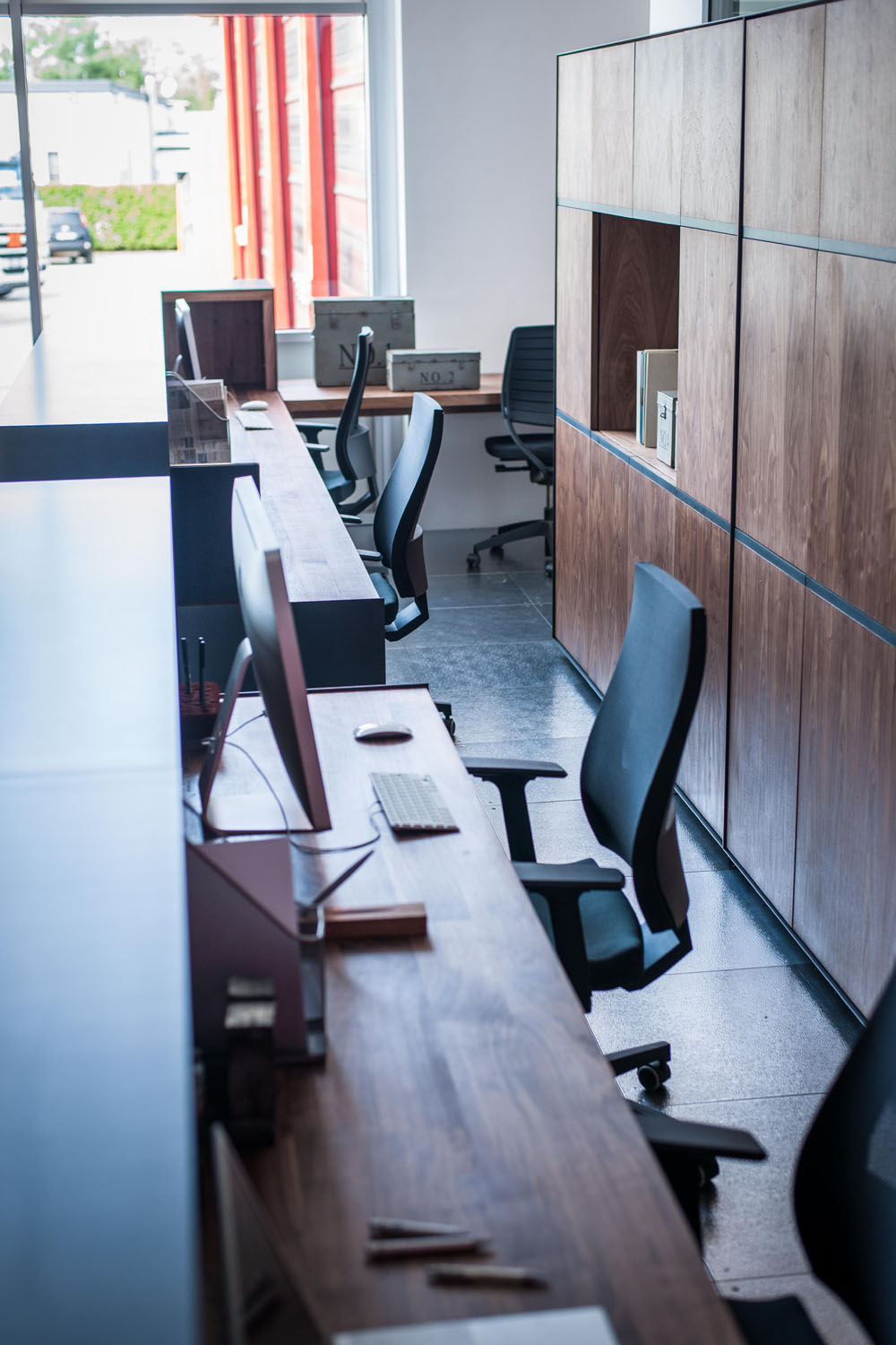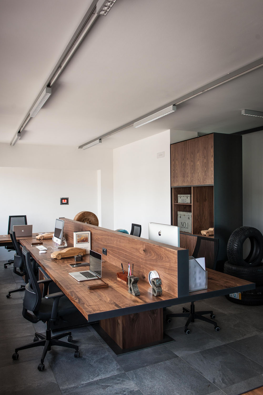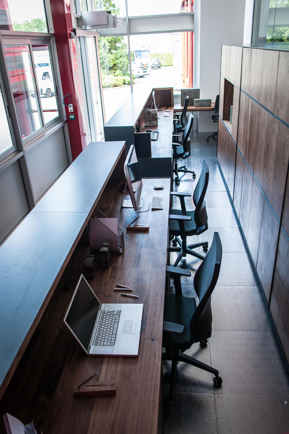 Arbeitsplätze und maßgefertigte Kleiderschränke als perfekte und harmonische Einrichtungslösung für die Büros der historischen Gorla Werkstatt in Cantù. Büros mit einem raffinierten und anspruchvollen Aussehen und einladend dank der Massivholzessenzen, die mit Ölen und natürlichen Wachsen mit Elementen der Möbeltradition Riva1920 veredelt sind.