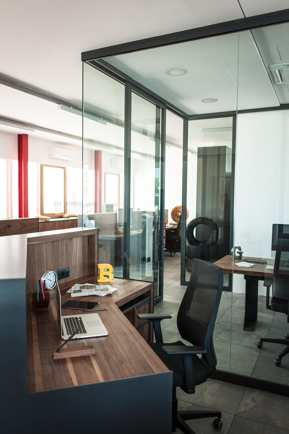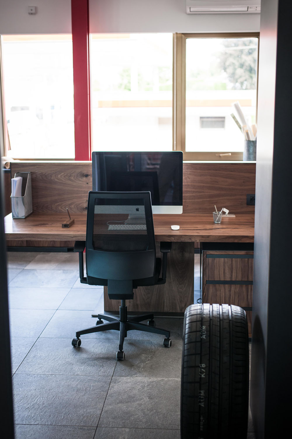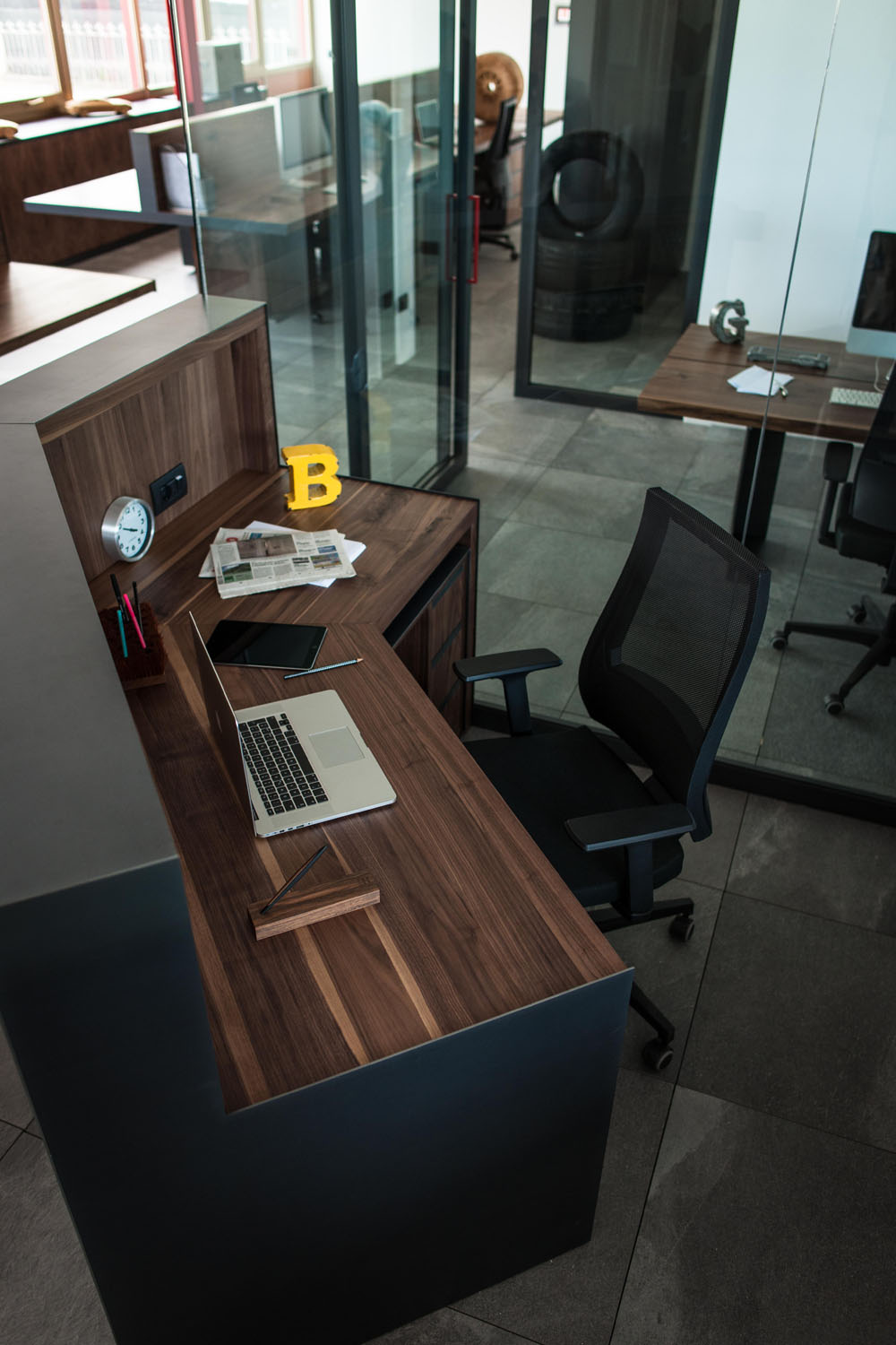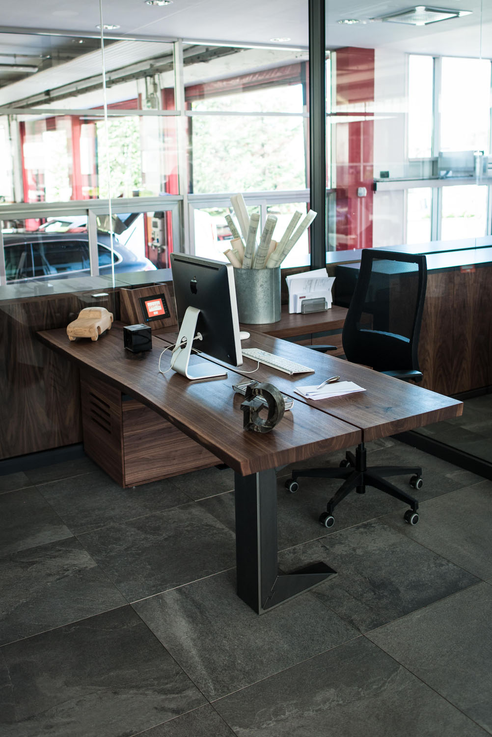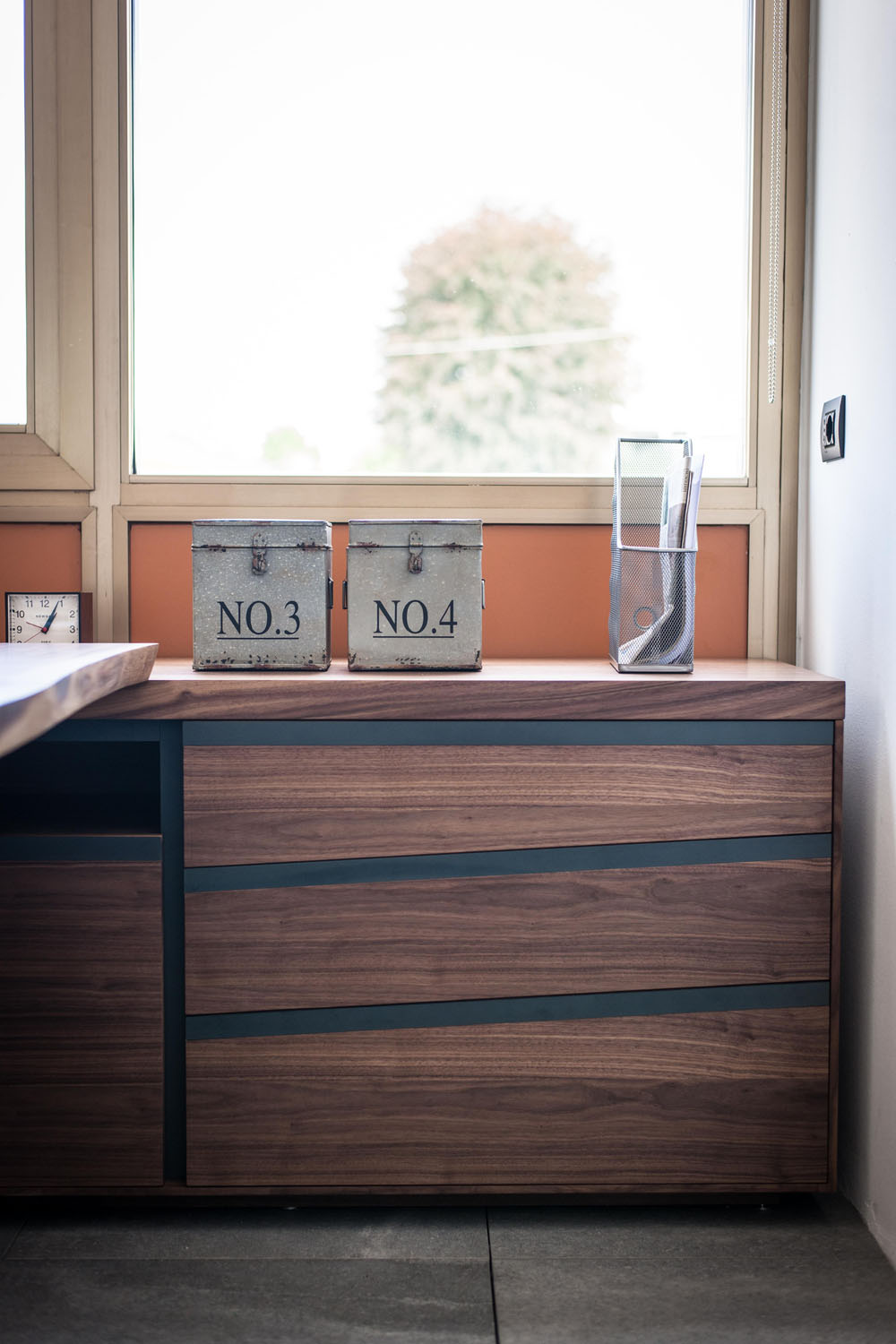 Arbeitsplätze und maßgefertigte Kleiderschränke als perfekte und harmonische Einrichtungslösung für die Büros der historischen Gorla Werkstatt in Cantù. Büros mit einem raffinierten und anspruchvollen Aussehen und einladend dank der Massivholzessenzen, die mit Ölen und natürlichen Wachsen mit Elementen der Möbeltradition Riva1920 veredelt sind.