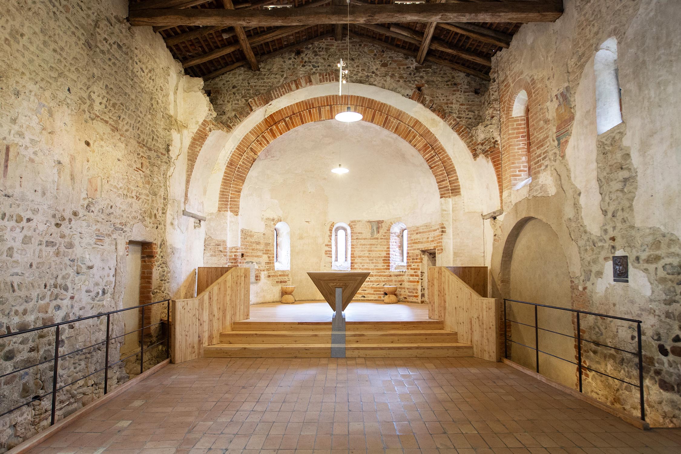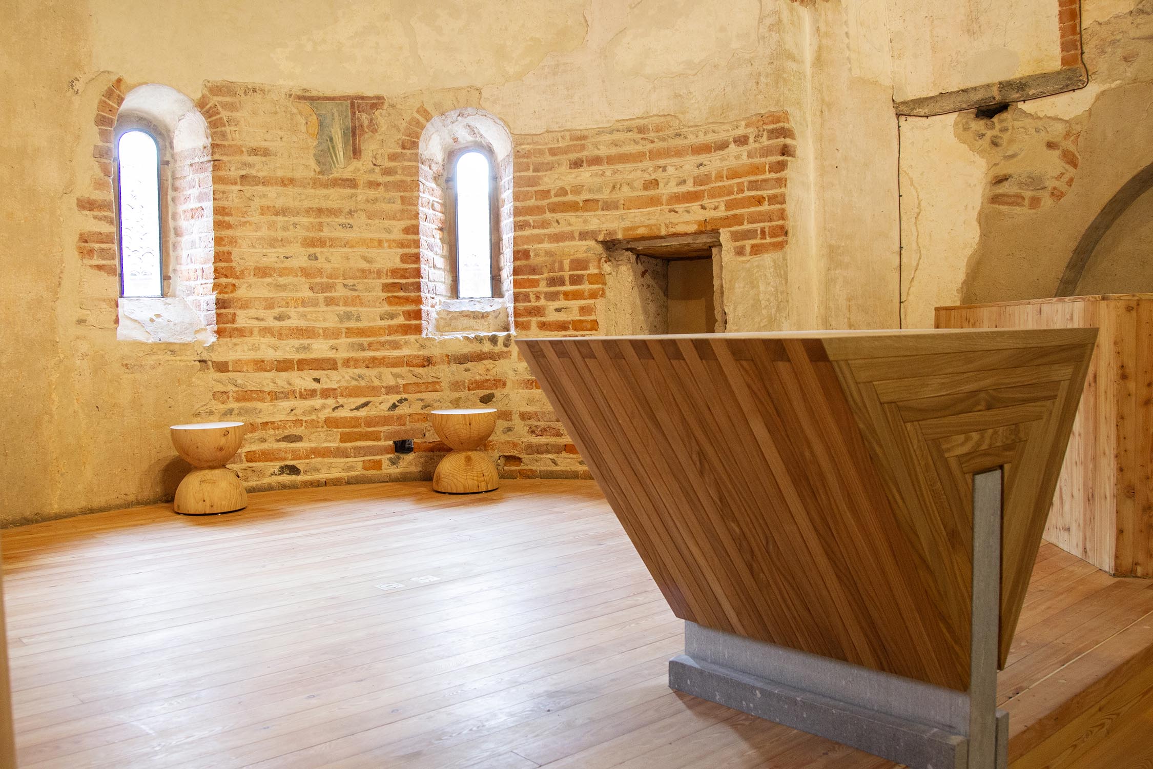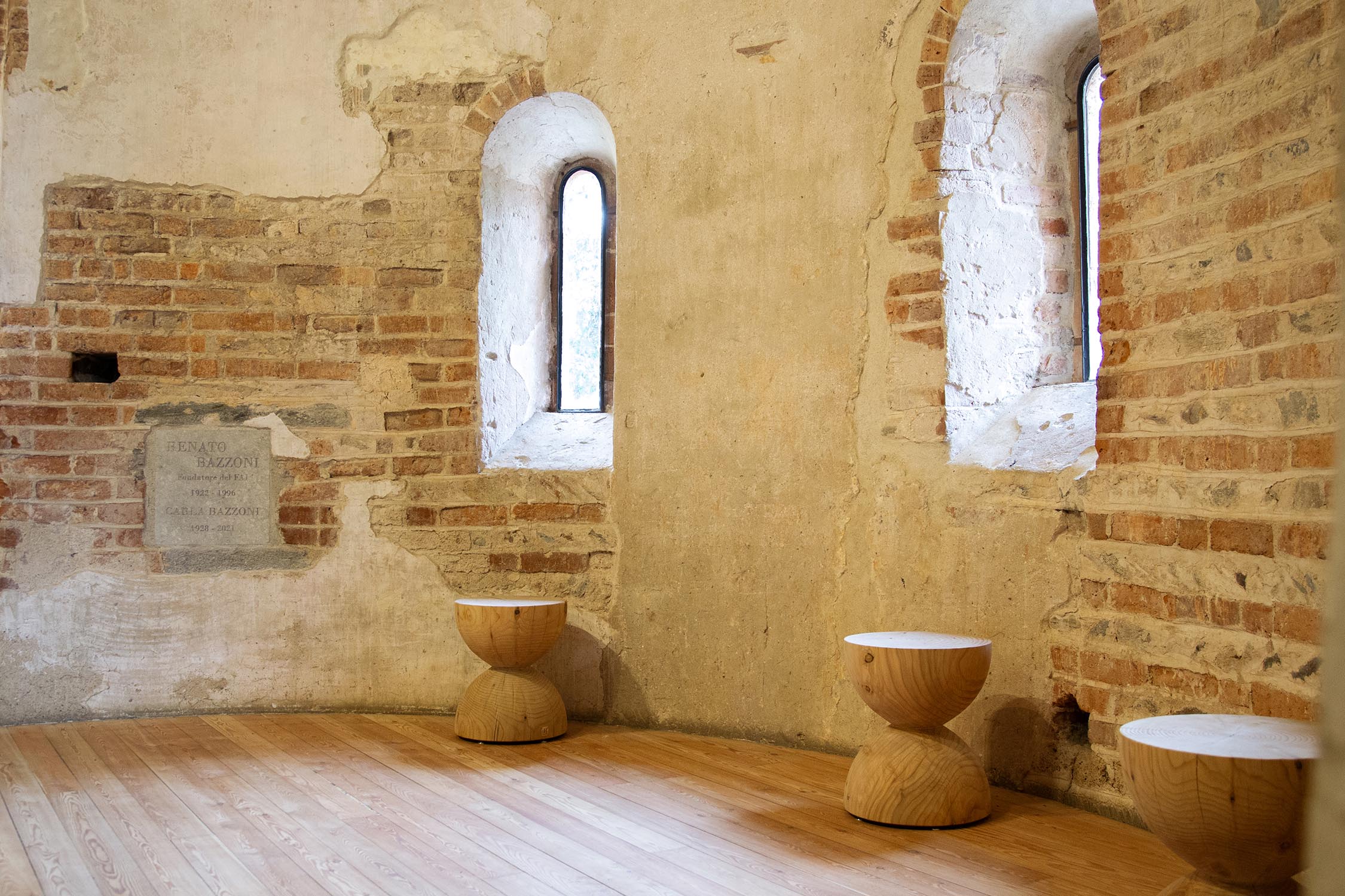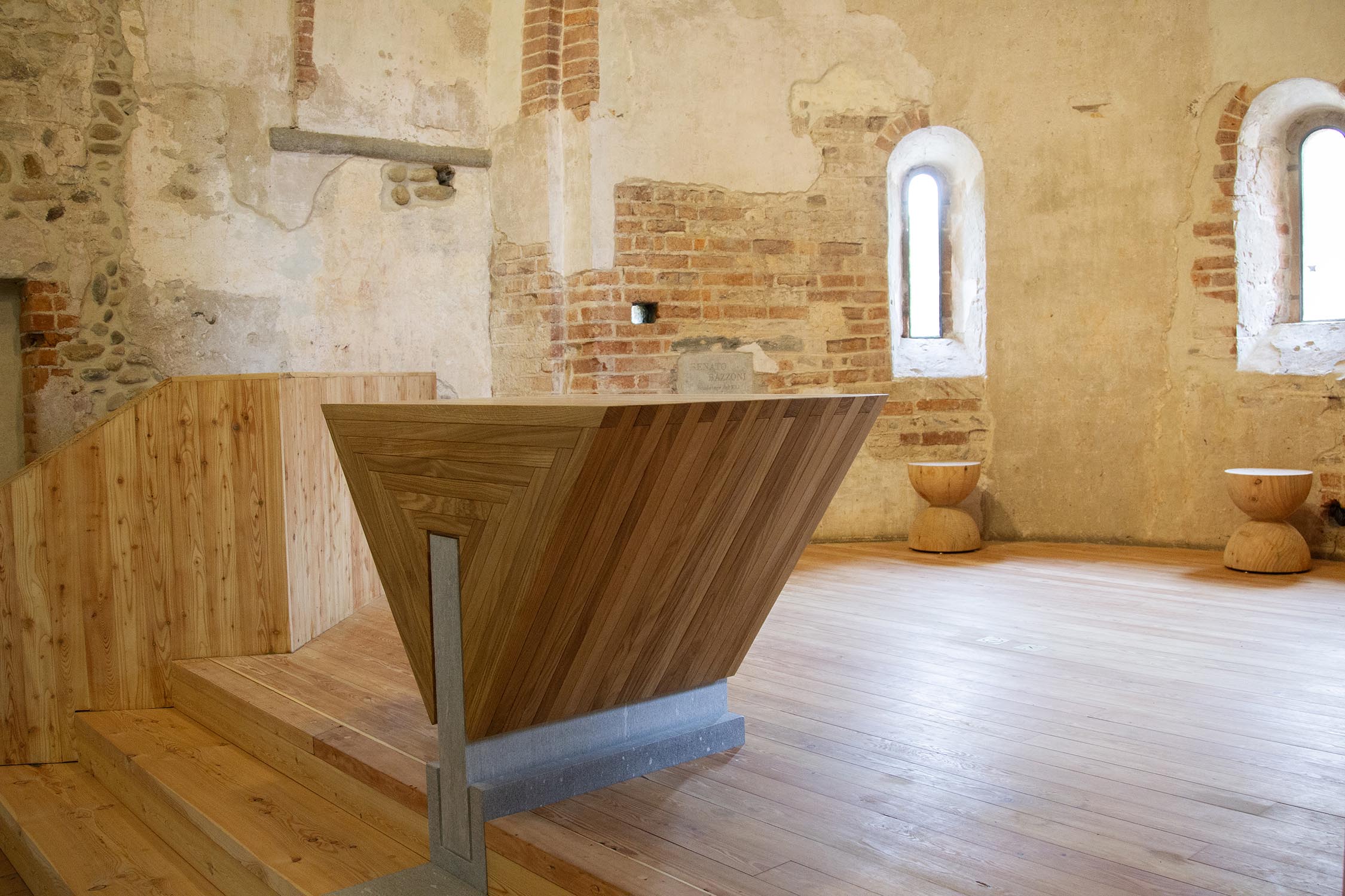 Riva1920 wurde direkt vom Architekten Botta zur Mitarbeit an dem Projekt eingeladen, mit dem eine langjährige professionelle Beziehung besteht, die bei vorherigen Projekten entwickelt wurde. Das Unternehmen lieferte seinen technischen und produktiven Beitrag durch die Herstellung eines Altars, eines Lesepults und vier Hocker der Clessidra-Kollektion.