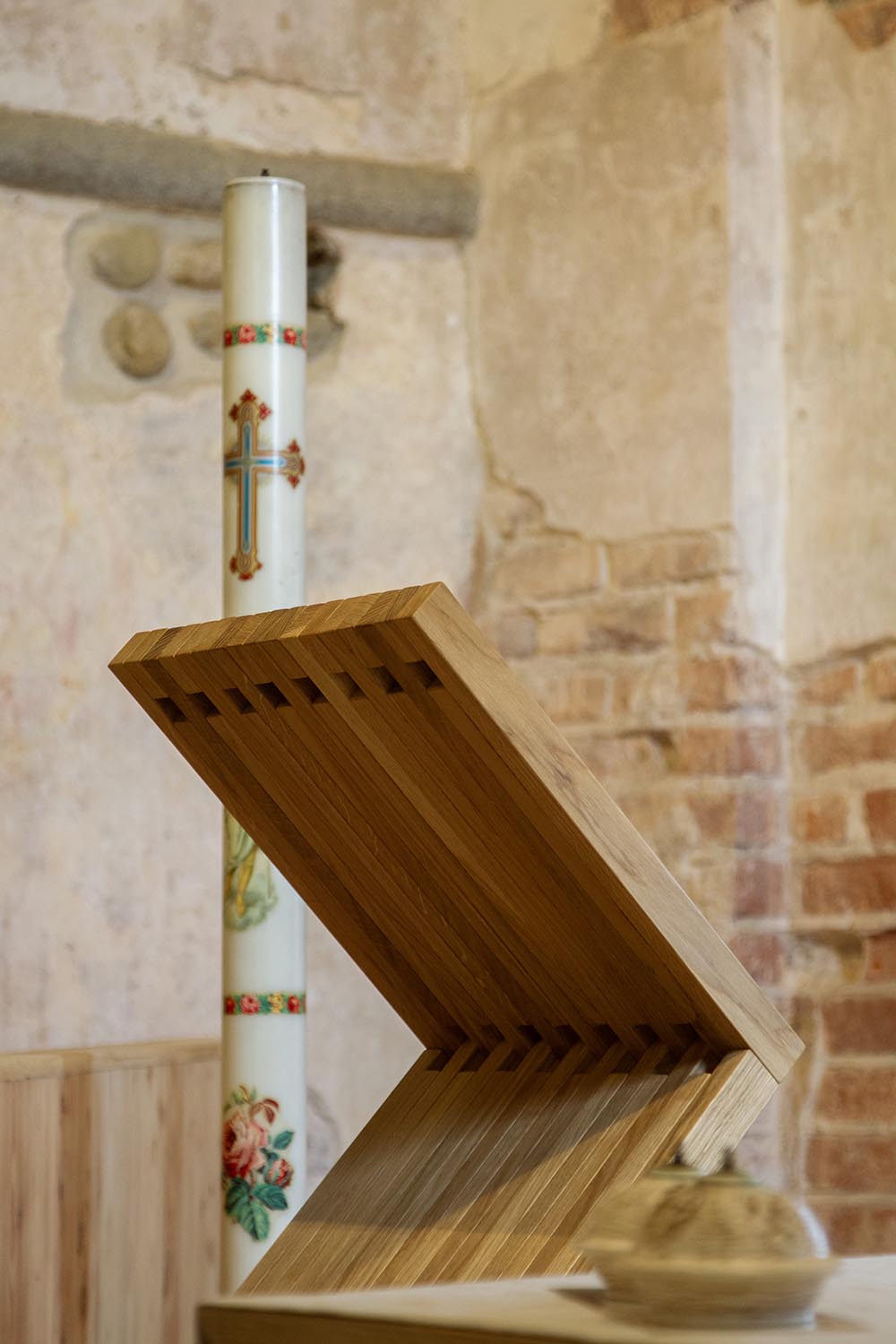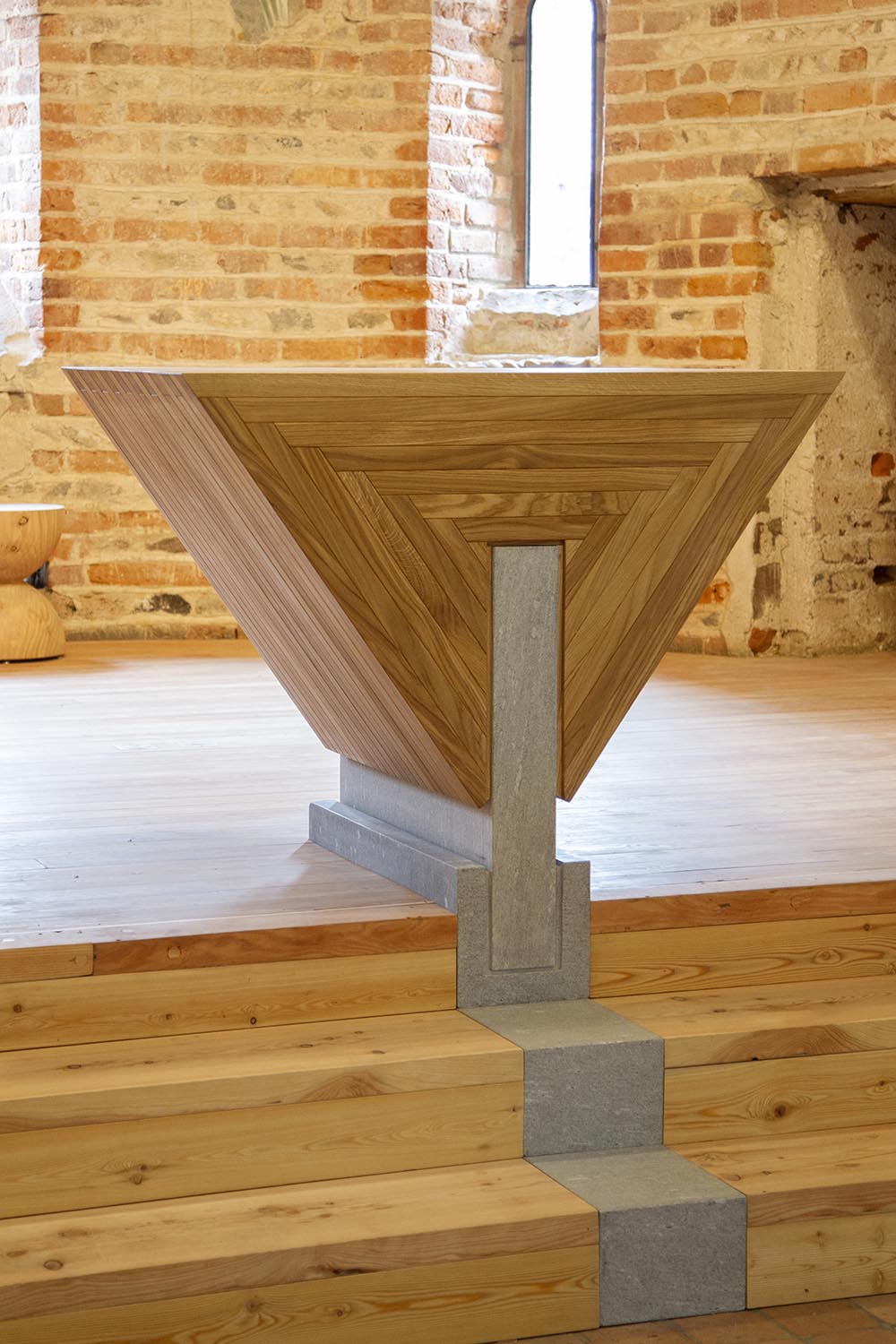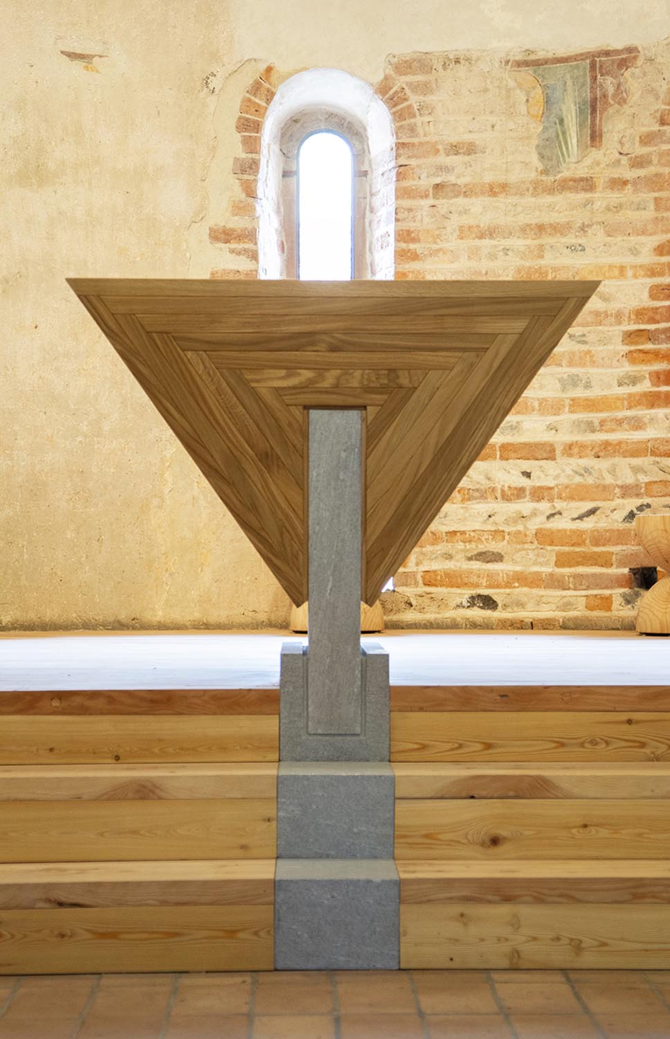 Der Altar, geprägt von einer trapezförmigen Geometrie, besteht aus vertikalen Leisten aus massivem Eichenholz, die auf einer tragenden Mittelplatte gelagert sind. Die Struktur ist in einem Sockel aus geschliffener weißer Beola-Marmorplatte integriert, bündig zum Boden eingelassen. Auch das Lesepult aus massivem Eichenholz, ebenfalls von Botta entworfen, greift die formale Sprache des Altars auf und sorgt für ästhetische und funktionale Kohärenz im liturgischen Ensemble.