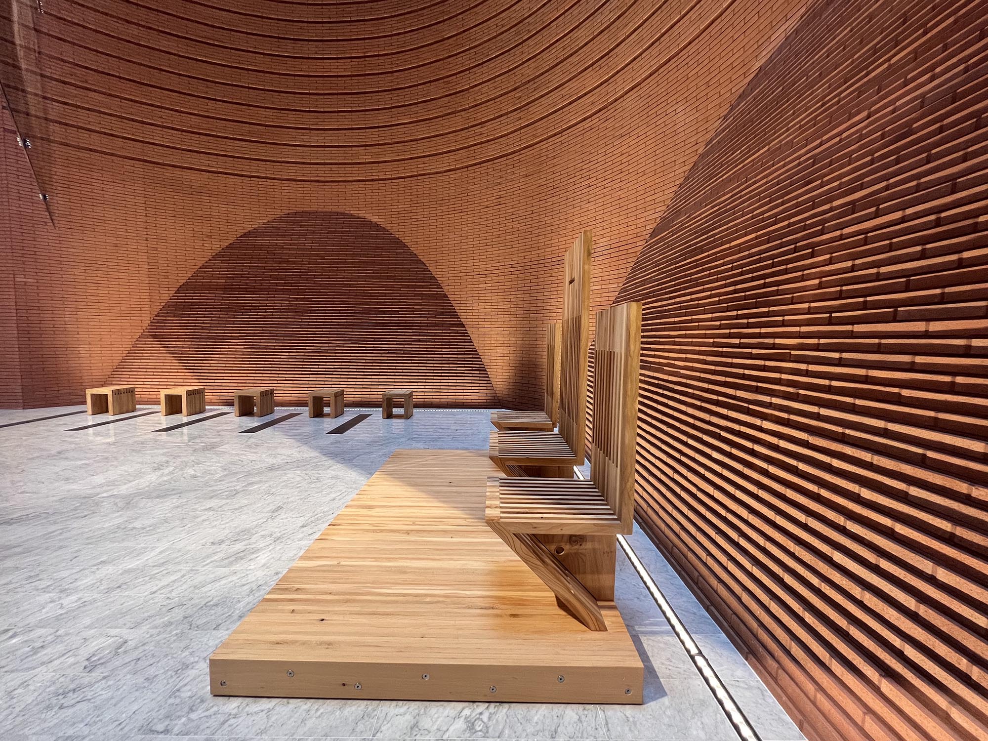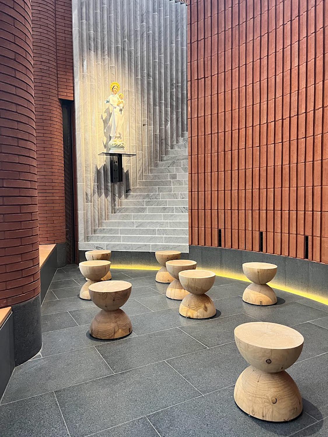 Im Inneren der Kirche befinden sich zudem die Hocker CLESSIDRA von Riva1920, Design Mario Botta, in perfekter formaler und materieller Übereinstimmung mit dem architektonischen Gesamtkonzept.