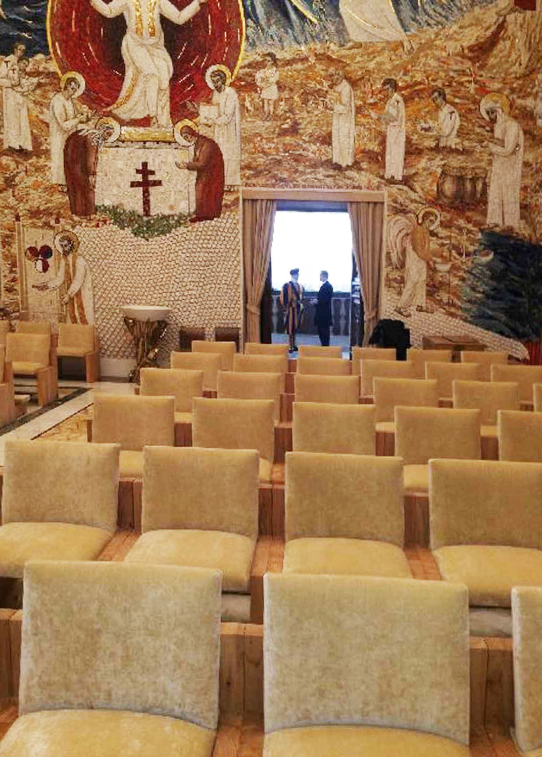 Riva1920 realisiert 100 Sessel mit Kniebank aus duftendem Zedernholz für den Vatikan. Der Papst hat eine Audienz an die private Firmen, die an dieses Projekt teilgenommen haben, gewähren. Dieses Projekt wurde möglich dank der Synergie von Federlegno und einige Firmen dieses Bereiches.