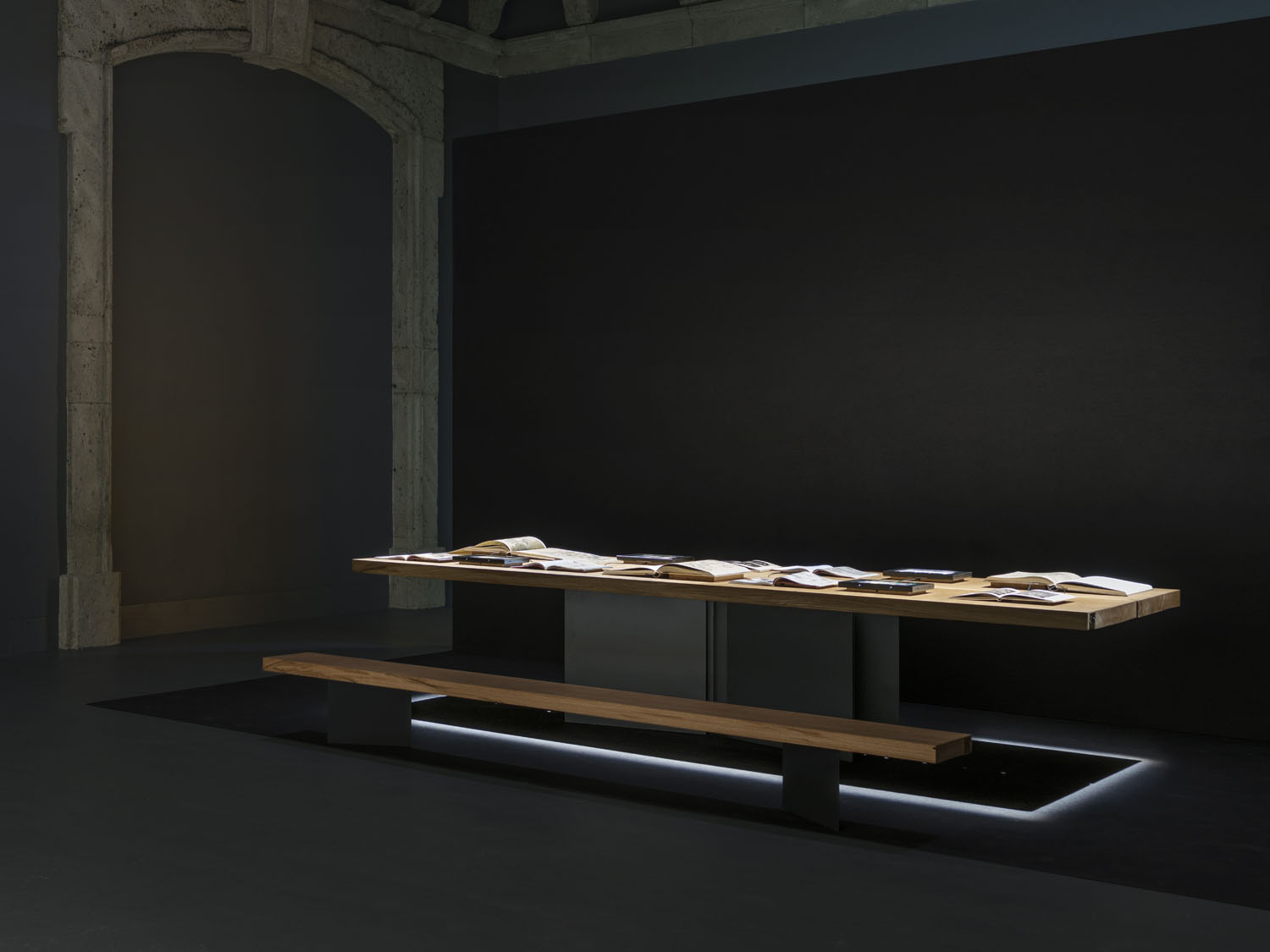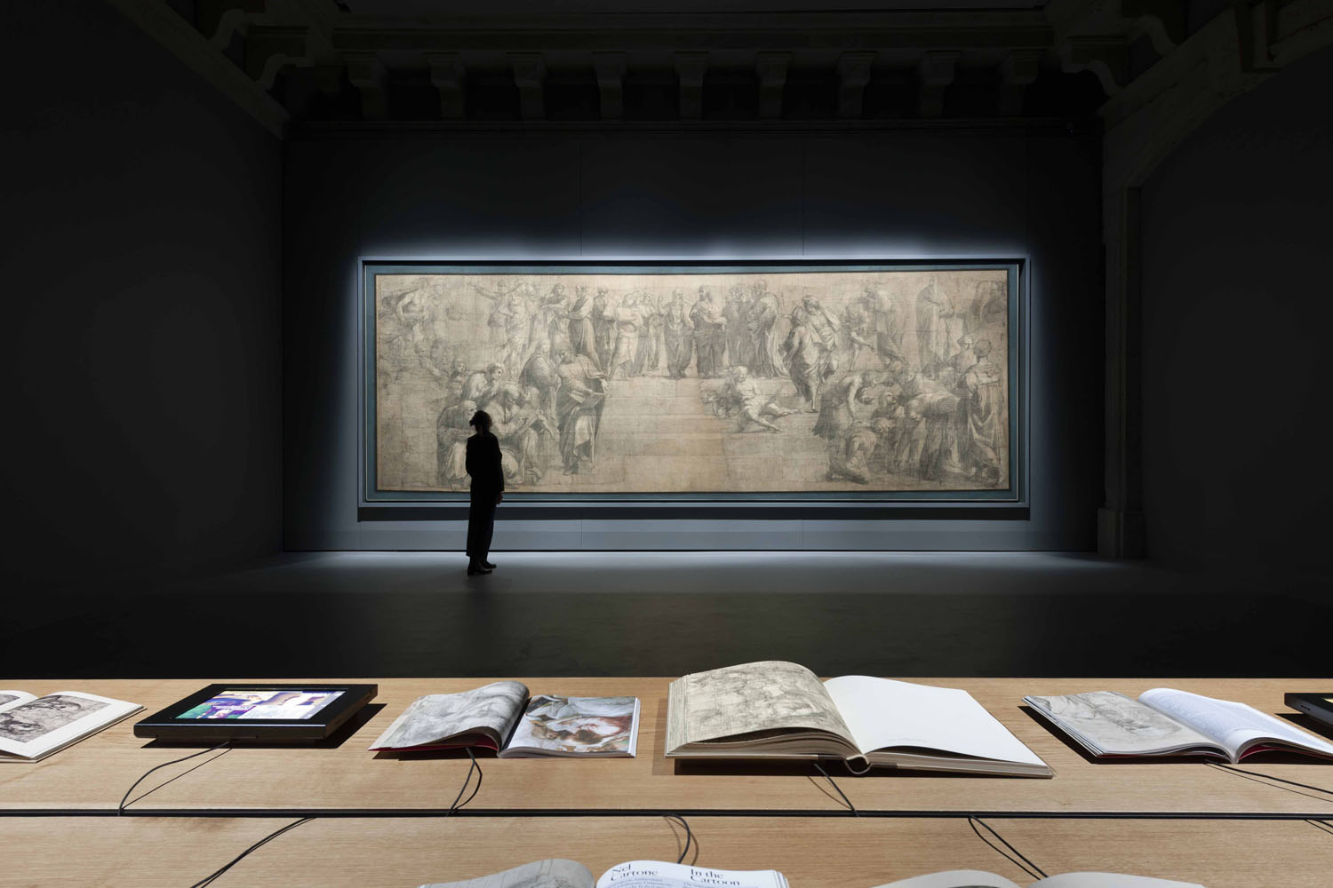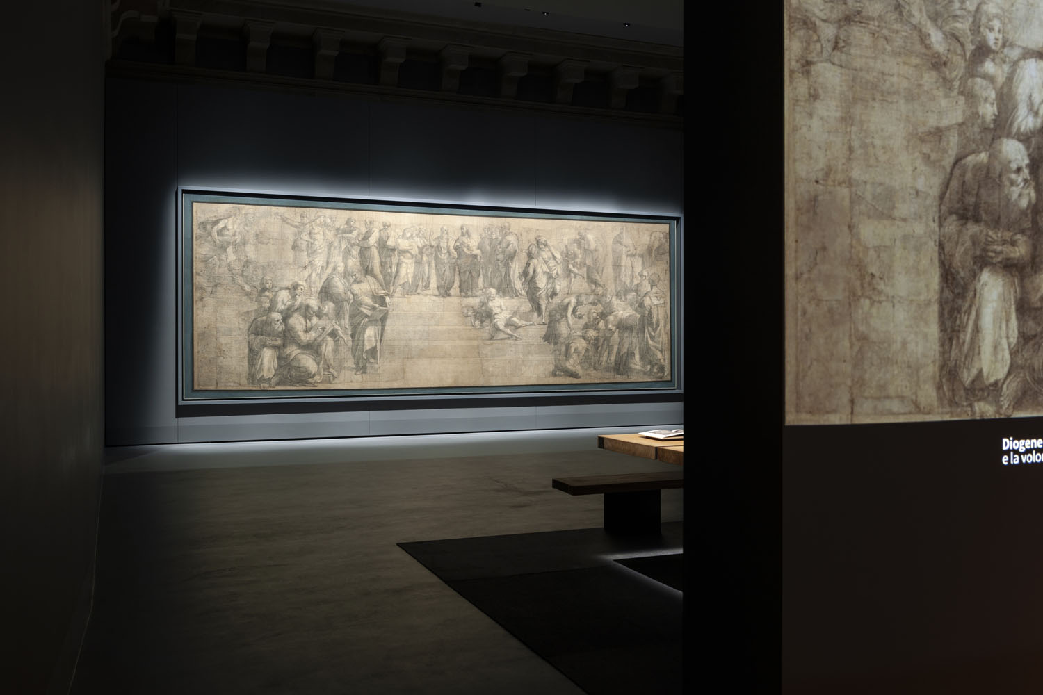 Stefano Boeri Architetti hat das Projekt für die neue Gestaltung der Halle unterzeichnet, die nach vier Jahren Restaurierung die vorbereitende Zeichnung für das Fresko der Schule von Athen in der Stanza delle Segnature der Vatikanischen Museen, die vollständig von Raffael gezeichnet wurde, wieder aufnimmt. „Alle unsere Gestaltungswahlen, beginnend mit den Annäherungssequenzen an das große Karton, sind darauf ausgerichtet, das Publikum auf die Vision eines Werkes vorzubereiten, das – intakt – in sich selbst eine wunderbare Verbindung von Bedeutungen hält, indem es gleichzeitig ein fertiges Werk ist und doch als Vorbereitung auf ein endgültiges Werk bestimmt ist“, sagt Stefano Boeri. „Aus diesem Grund haben wir einen großen Tisch aus massiver Eiche (hergestellt von Riva1920) für denselben Raum entworfen, der darauf abzielt, Texte und vertiefende Dokumente über die Geschichte des Kartons, darüber, wie es gemacht wurde, über seine Beziehung zum Fresko in der Sala della Segnatura in den Vatikanischen Museen zu sammeln“. „Das Projekt, an dem wir gearbeitet haben und das uns als Protagonisten involvierte – fährt er fort – besteht aus einem mehr als 4 Meter langen Tisch (4,40 mt. X 1,50 mt.), der aus zwei einstückigen, versetzten 7,5 cm dicken Eichenholzplatten zusammengesetzt ist. Sie sind durch ein zentrales Eisenprofil für die Durchführung von Tablet-Kabeln charakterisiert. Der metallene Unterbau besteht aus 4 Eisenstreben („Eisenstaub“ lackiert), die sich in der Mitte kreuzen und einen vierzackigen Stern bilden. Drei Eichenbänke mit einem Eisenunterbau aus zwei geneigten Eisenbeinen vervollständigen diese Einrichtung“.