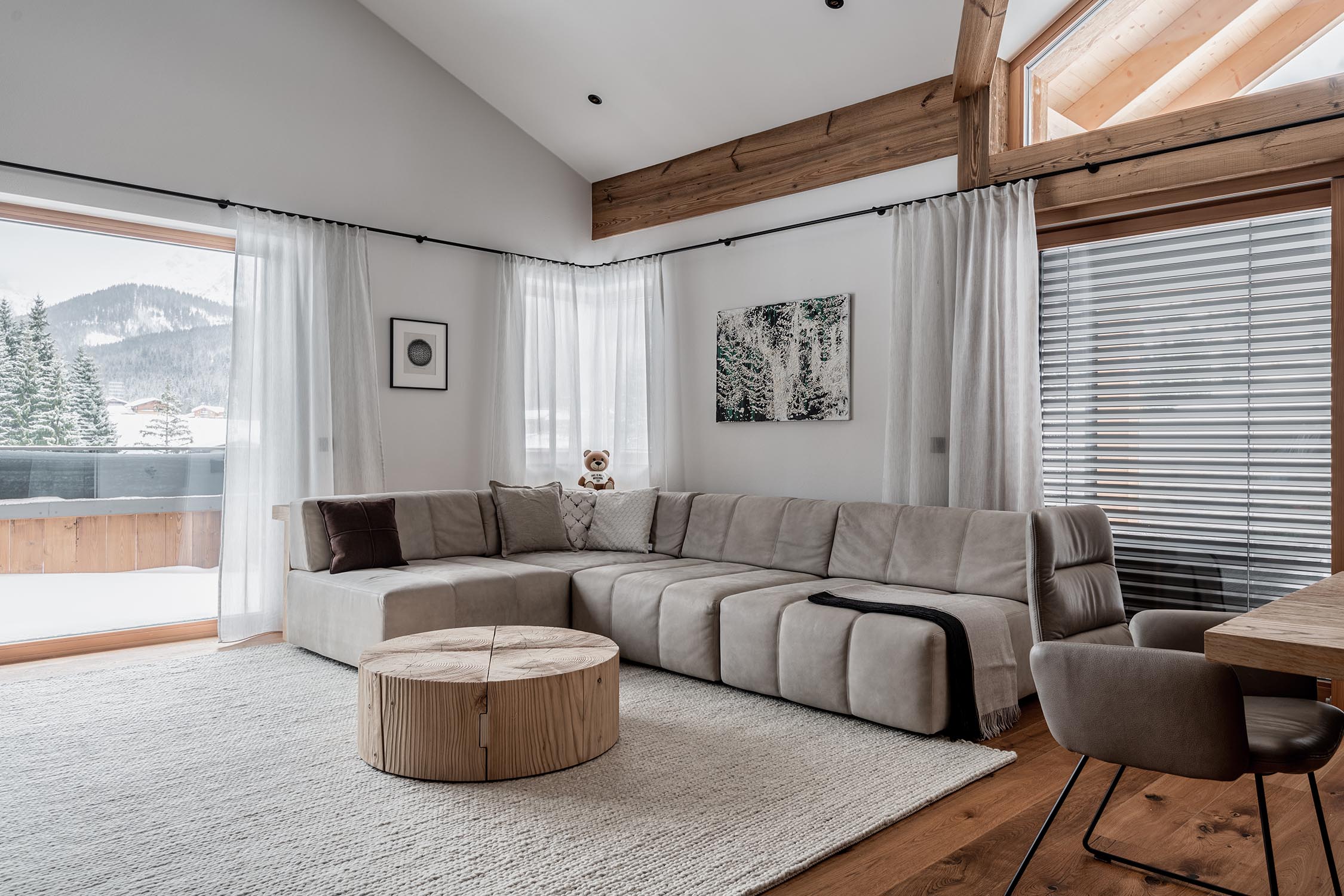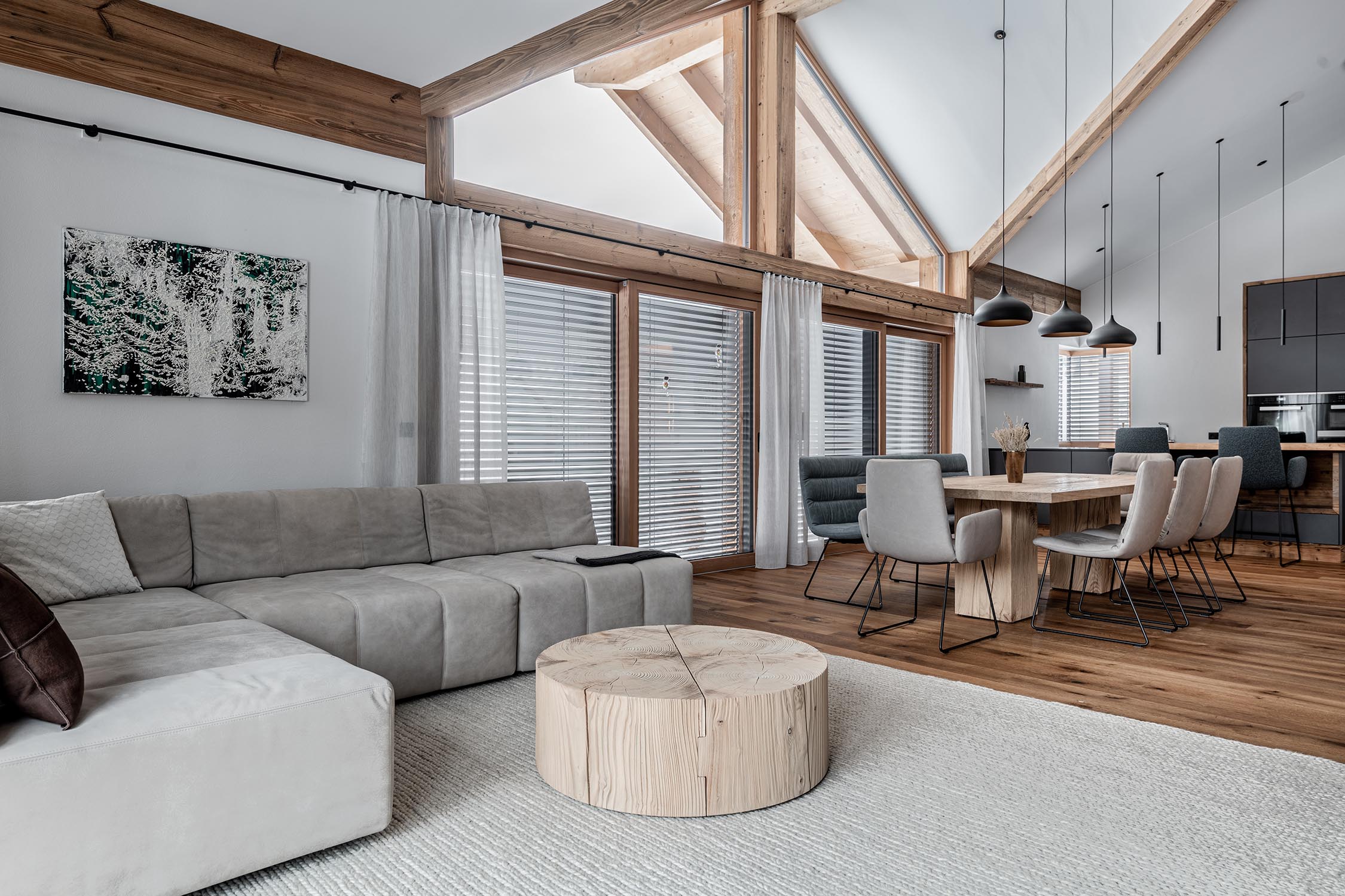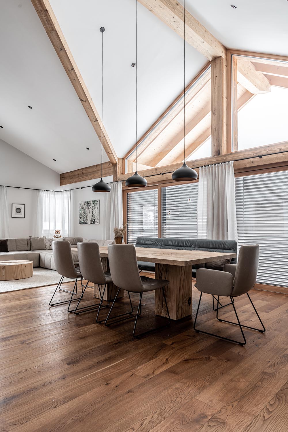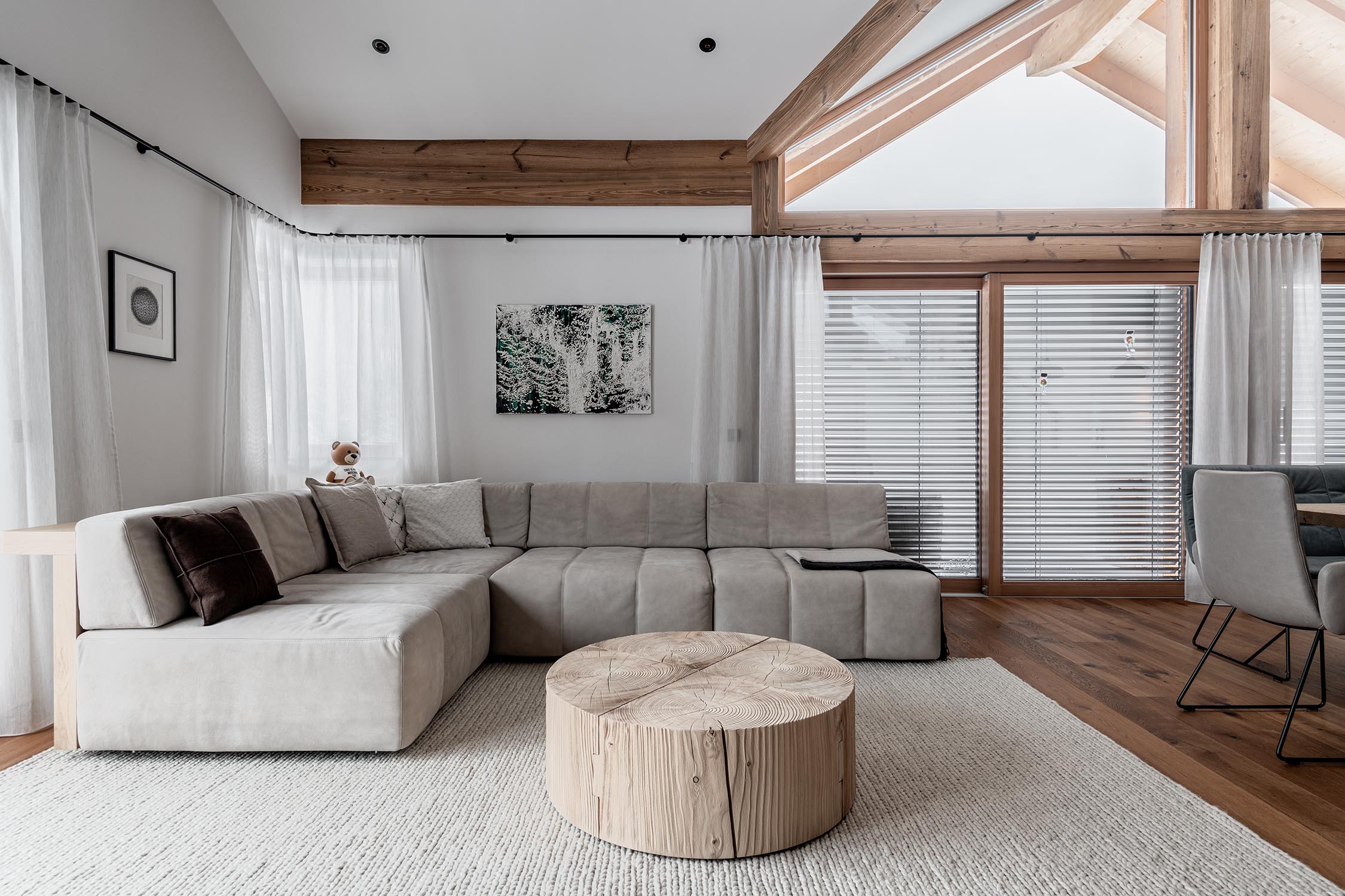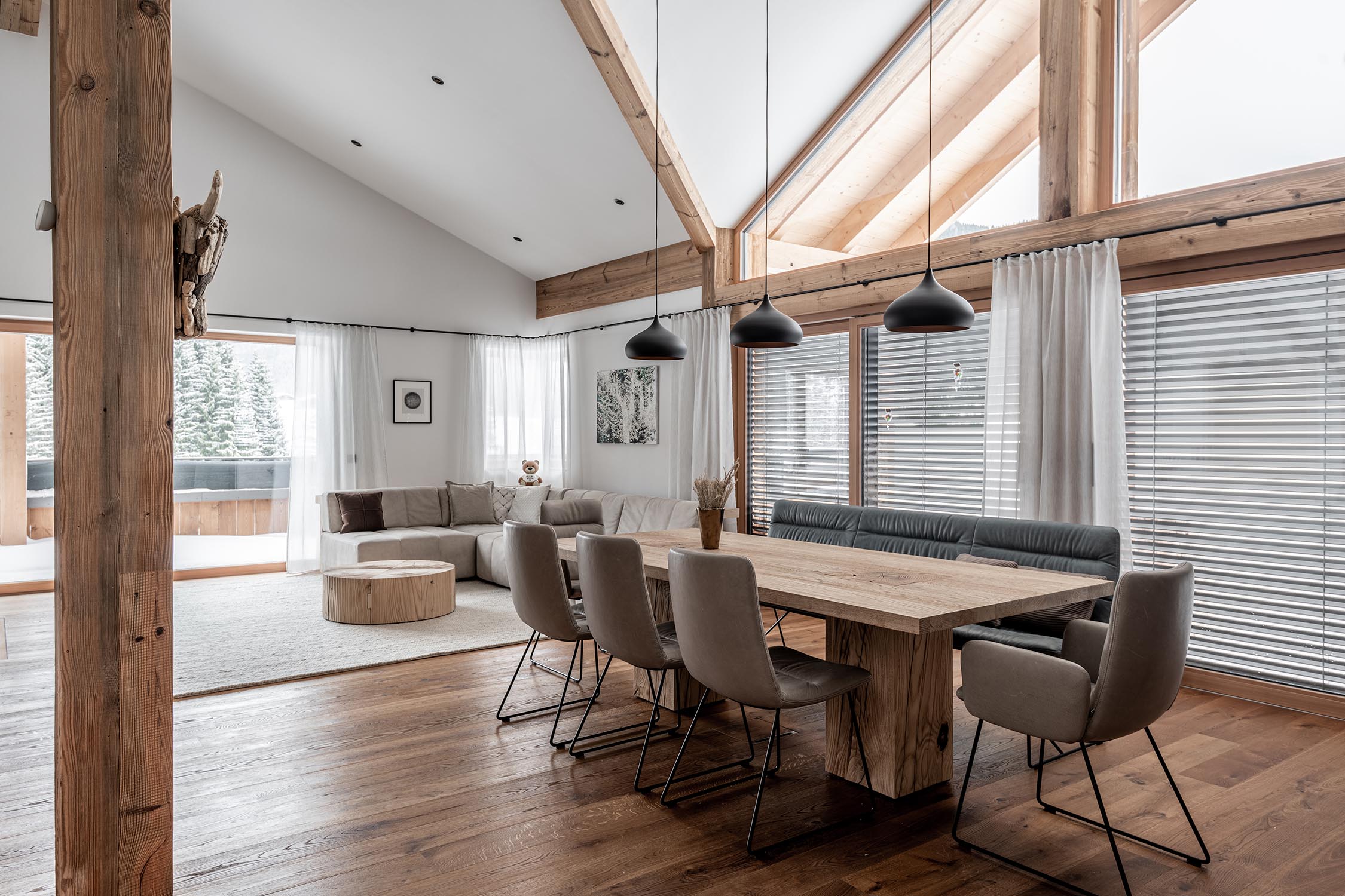 Holz wird zum verbindenden Element des Projekts, gewählt, um eine harmonische Verbindung zwischen den Wohnräumen und der umliegenden alpinen Landschaft herzustellen.