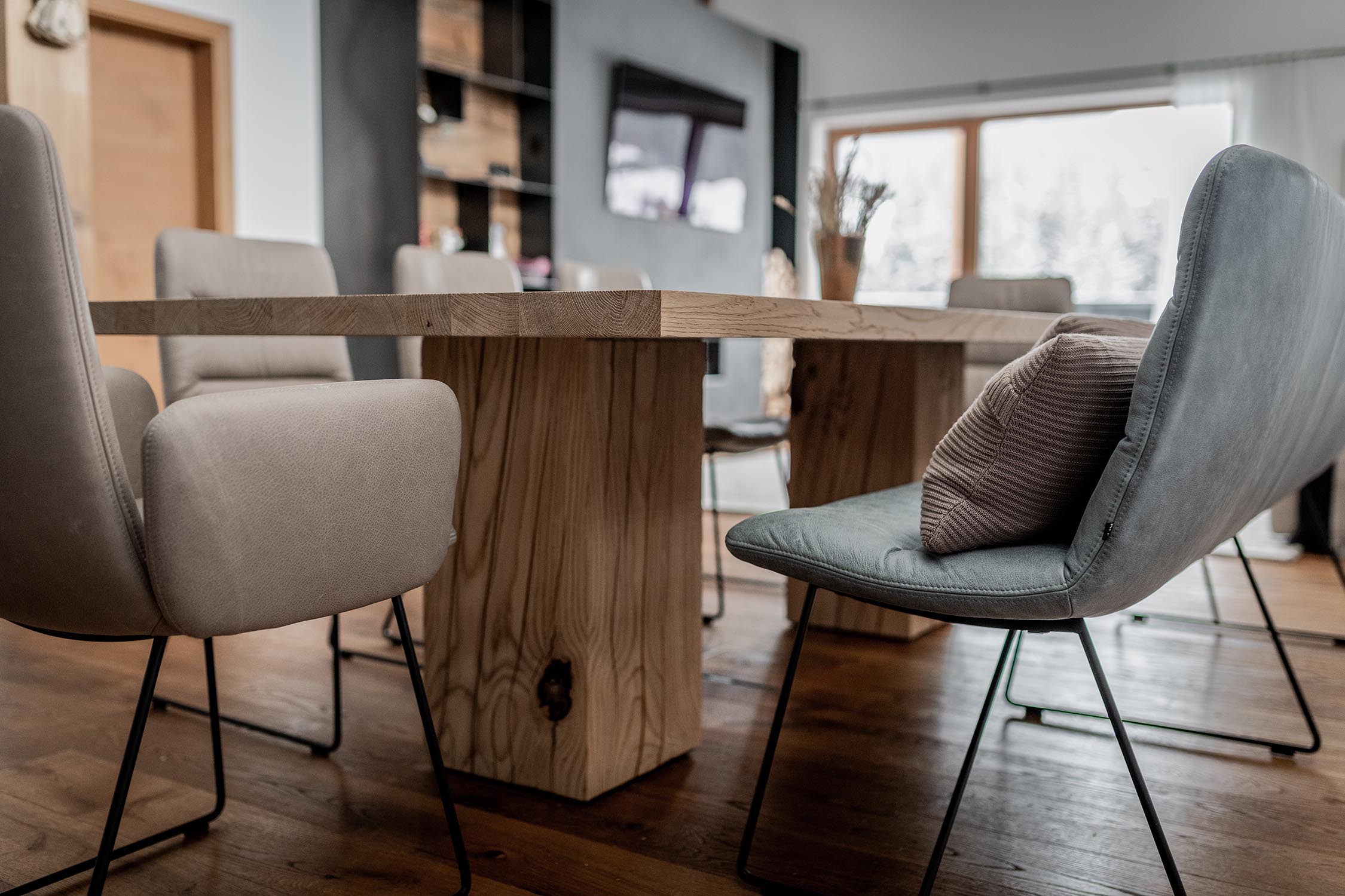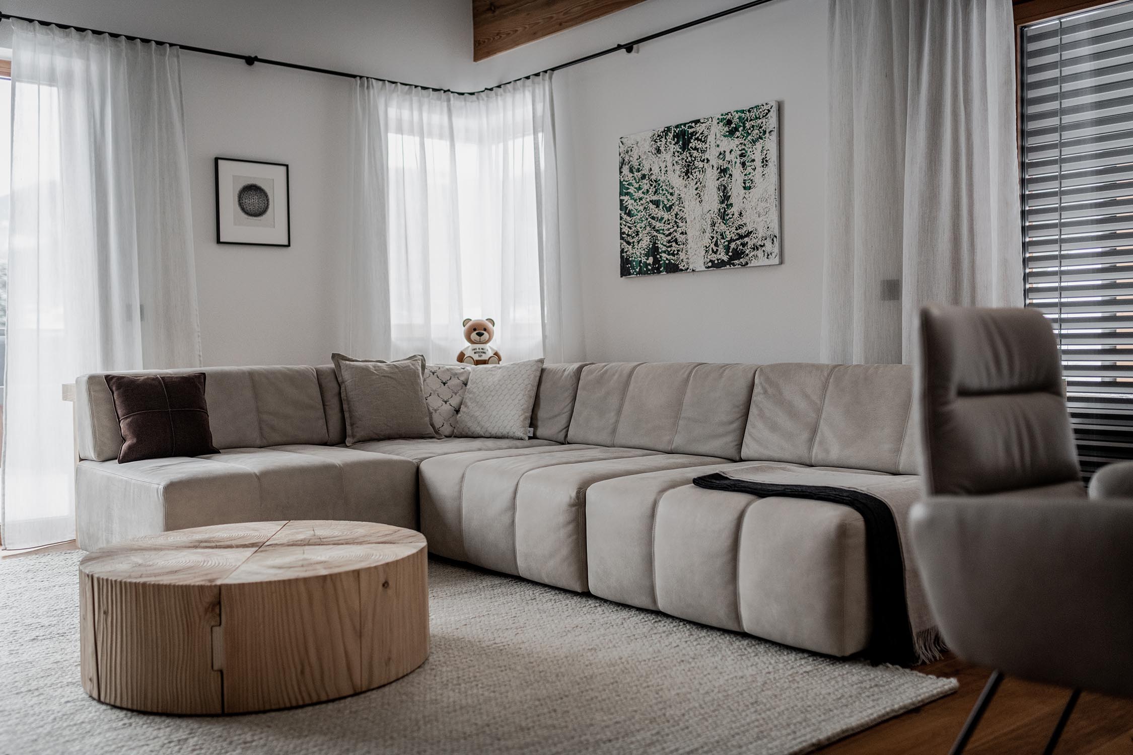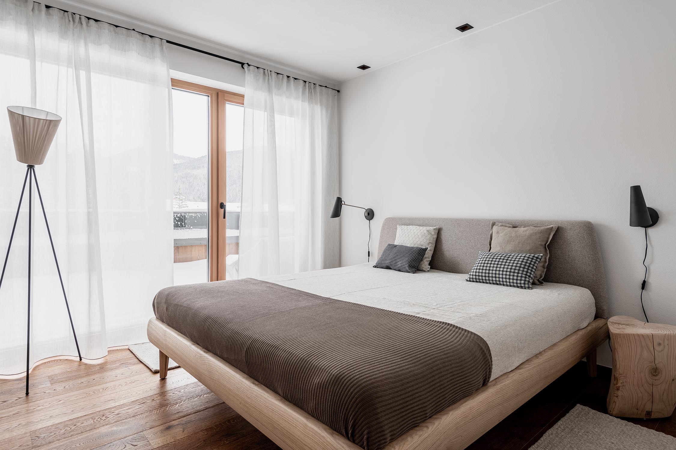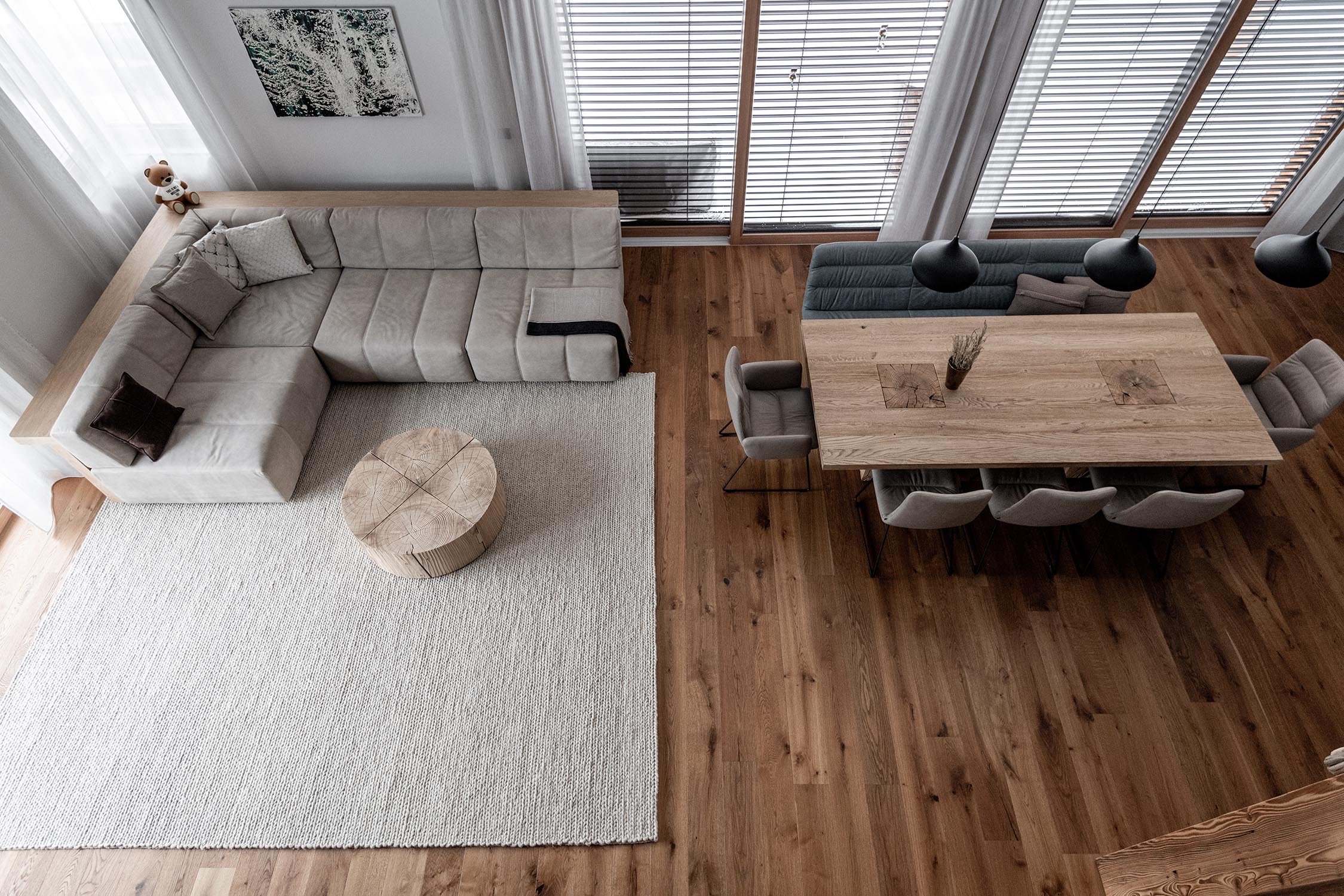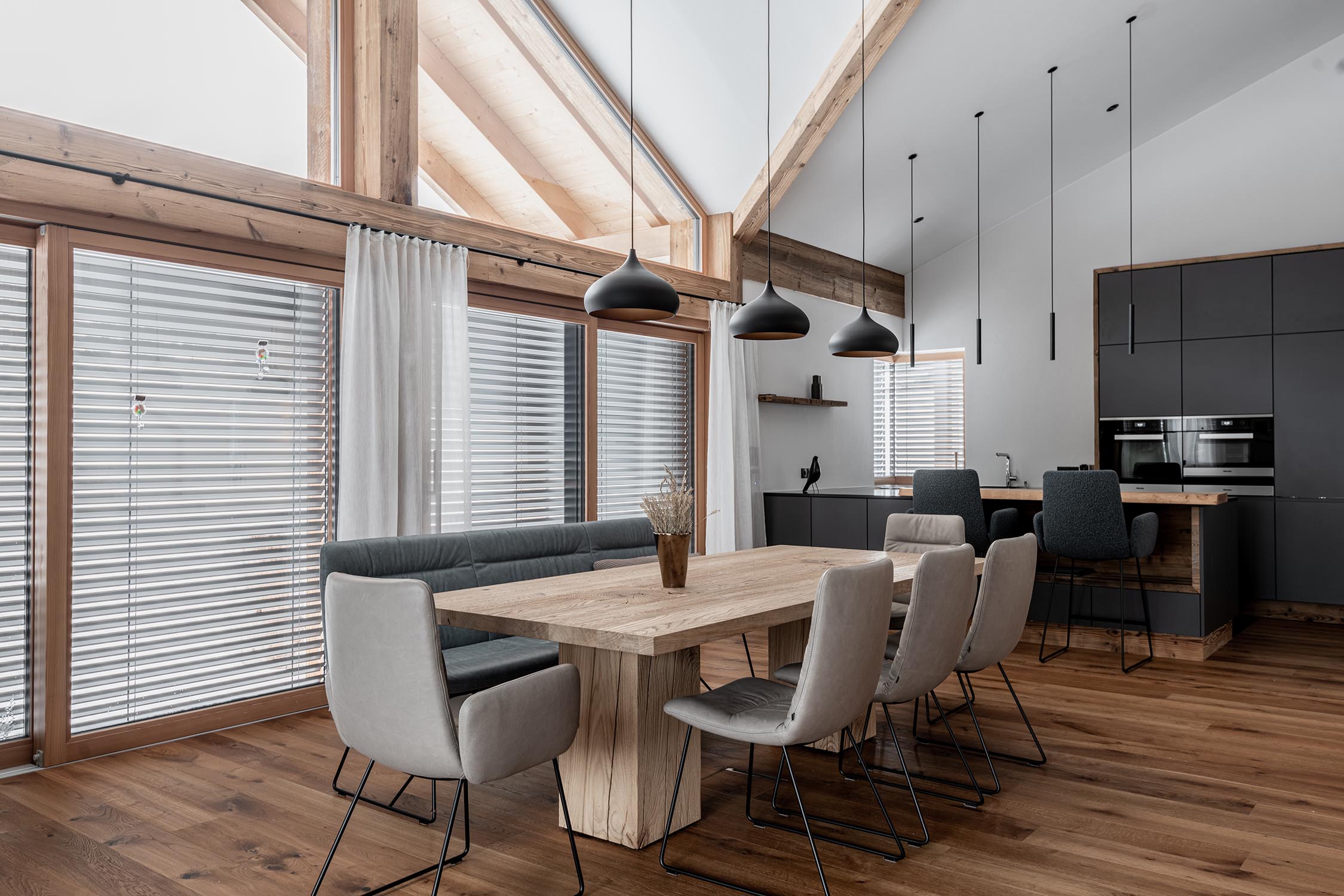 Holz wird zum verbindenden Element des Projekts, gewählt, um eine harmonische Verbindung zwischen den Wohnräumen und der umliegenden alpinen Landschaft herzustellen.