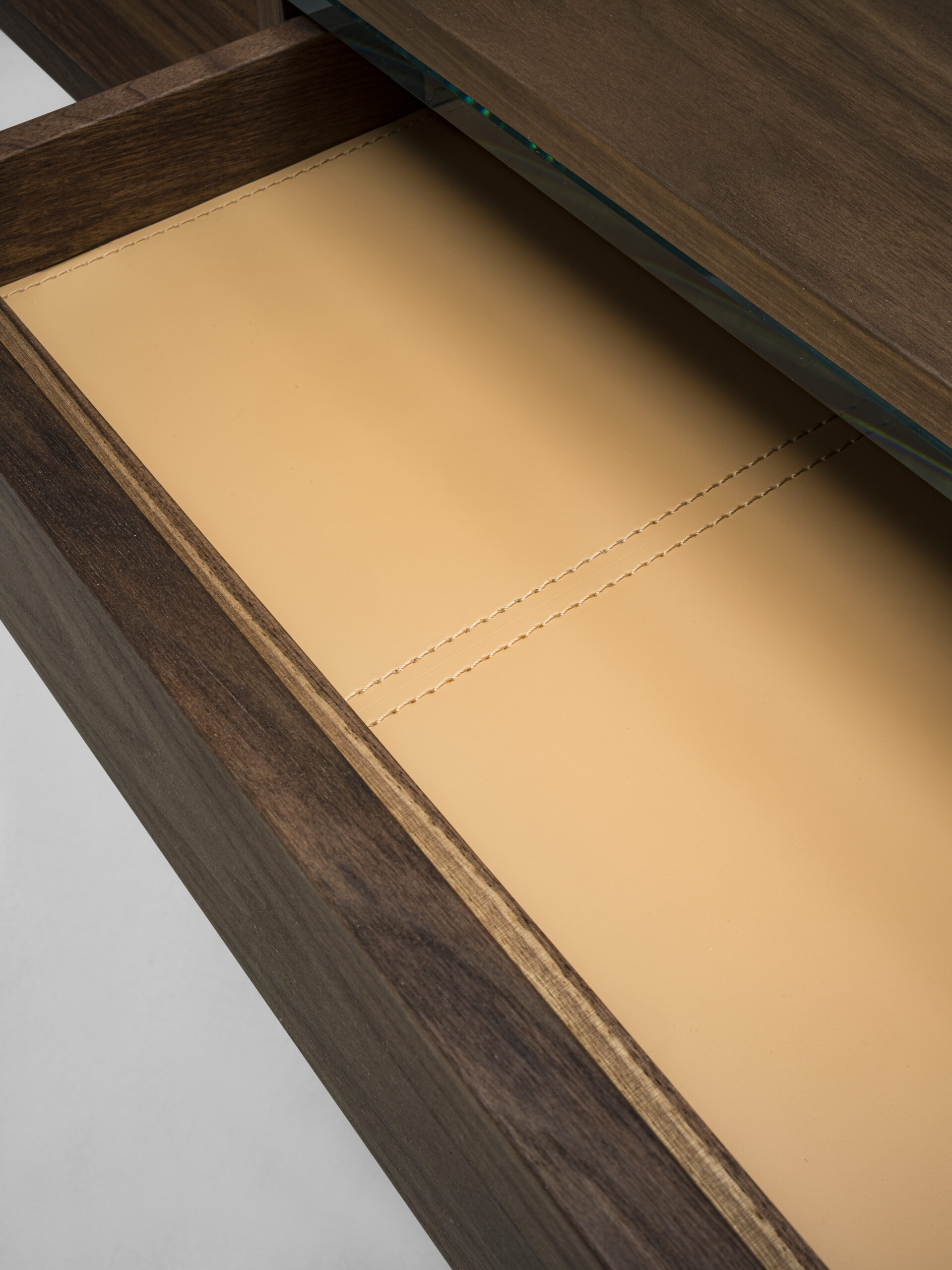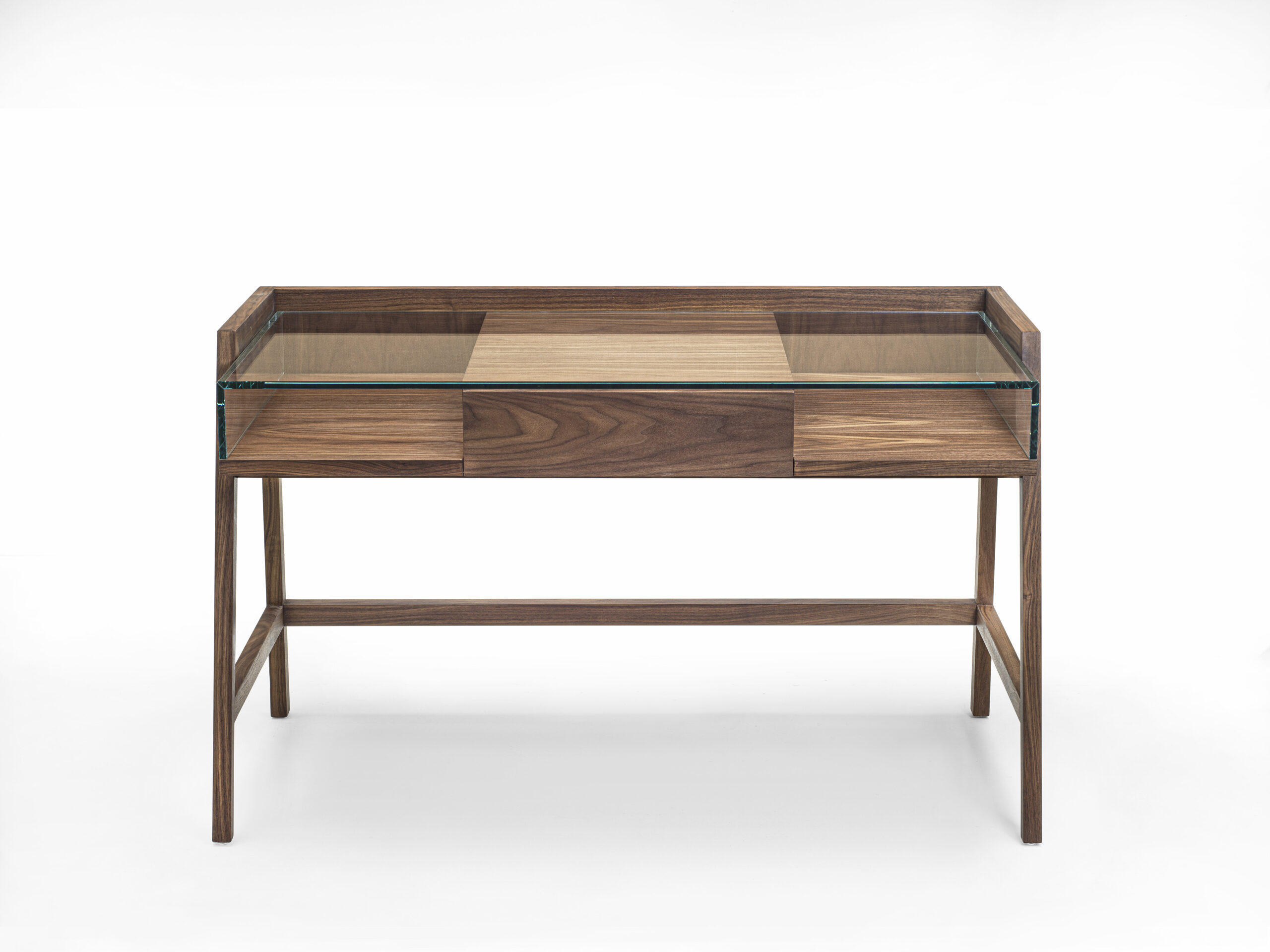 Bureau aux lignes carrées, avec structure en latté plaqué et bois massif et plan de travail en verre. Équipé d'un tiroir central assemblé en queue d'aronde