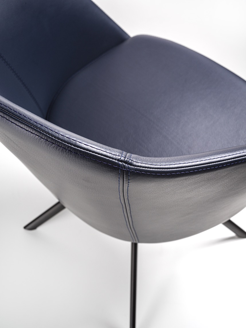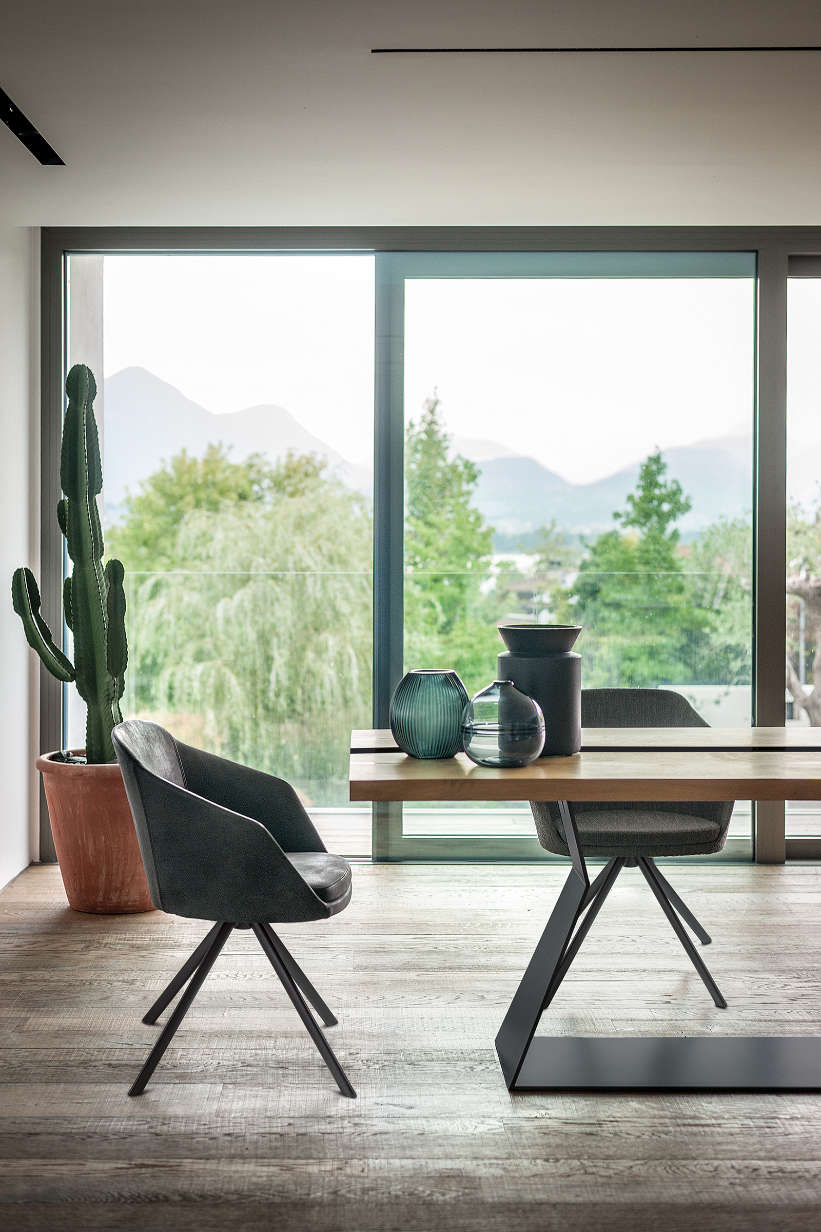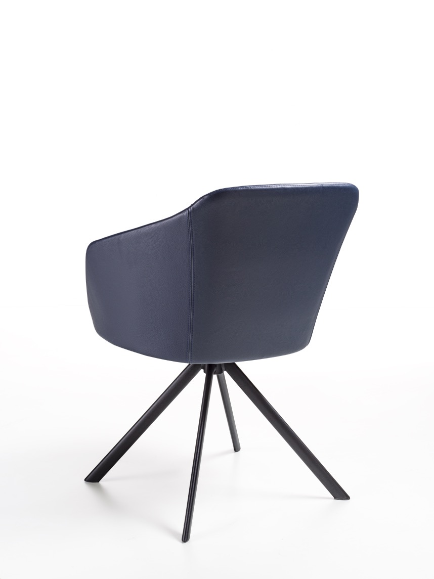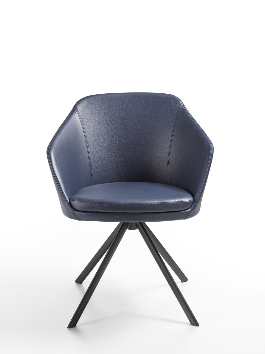 Fauteuil élégant et enveloppant, avec pieds en acier. Structure en mousse de polyuréthane continue entre le dossier et les accoudoirs, dotée de coussin intégré dans l’assise. Disponible aussi en version pivotante.