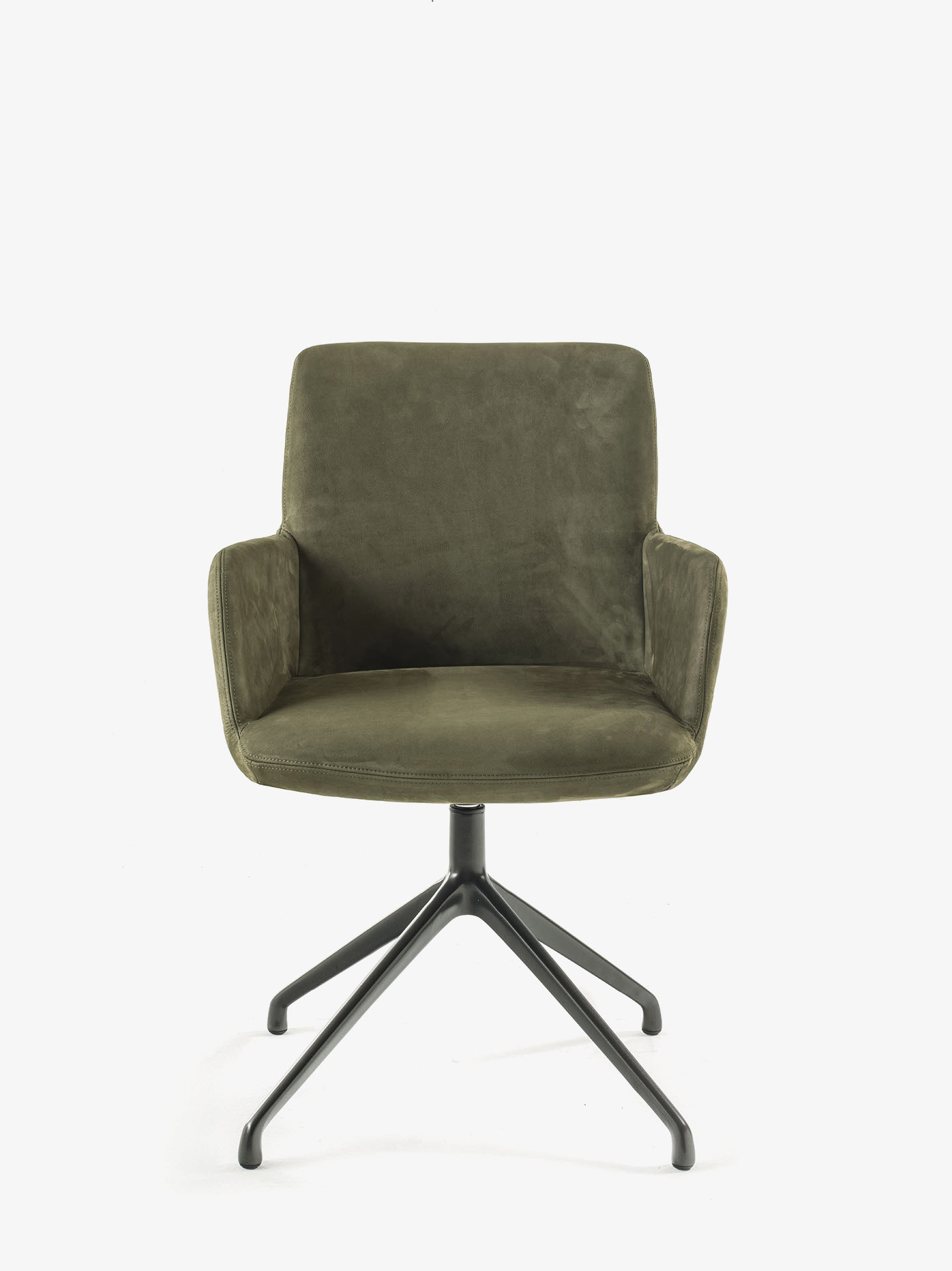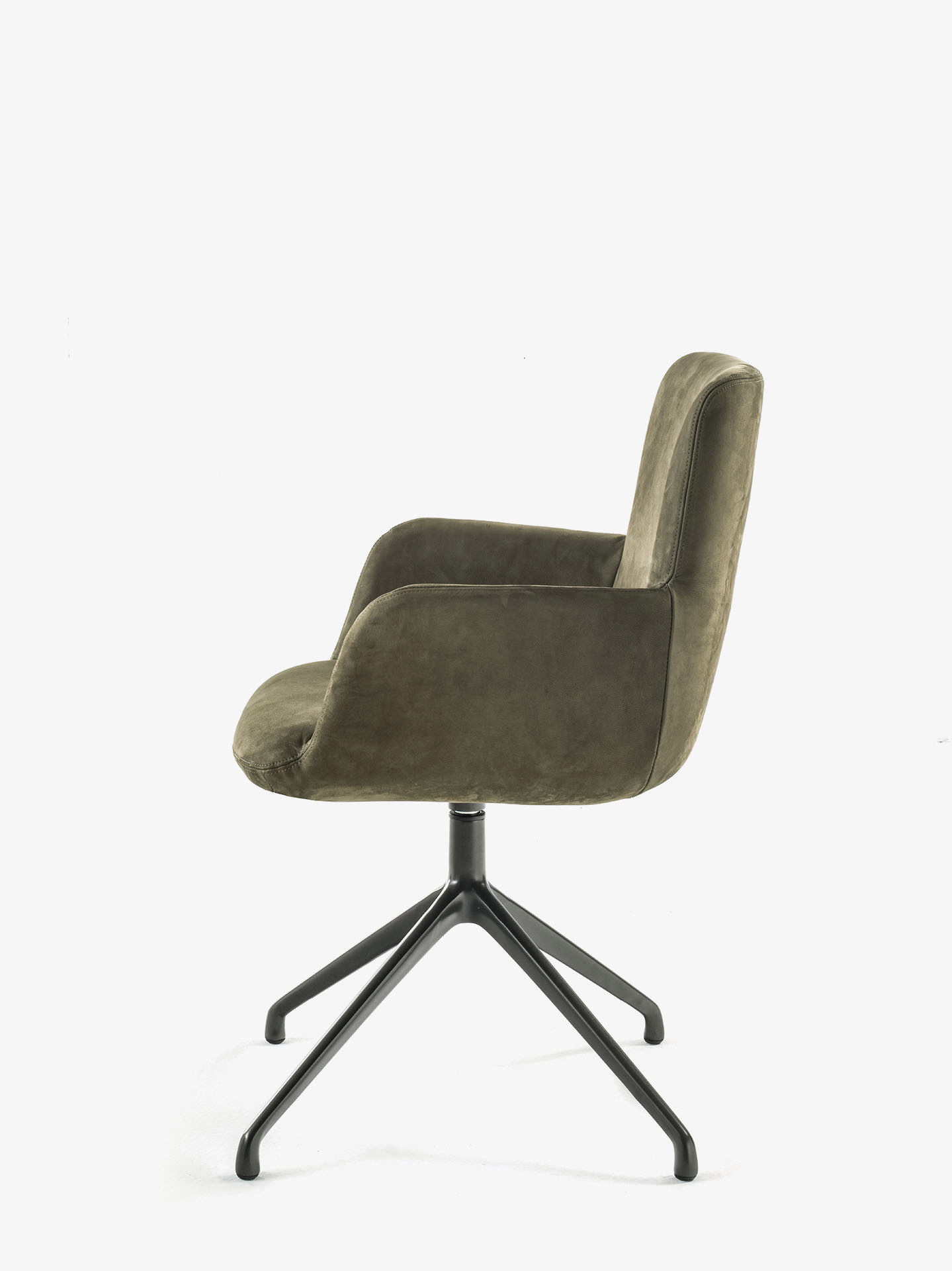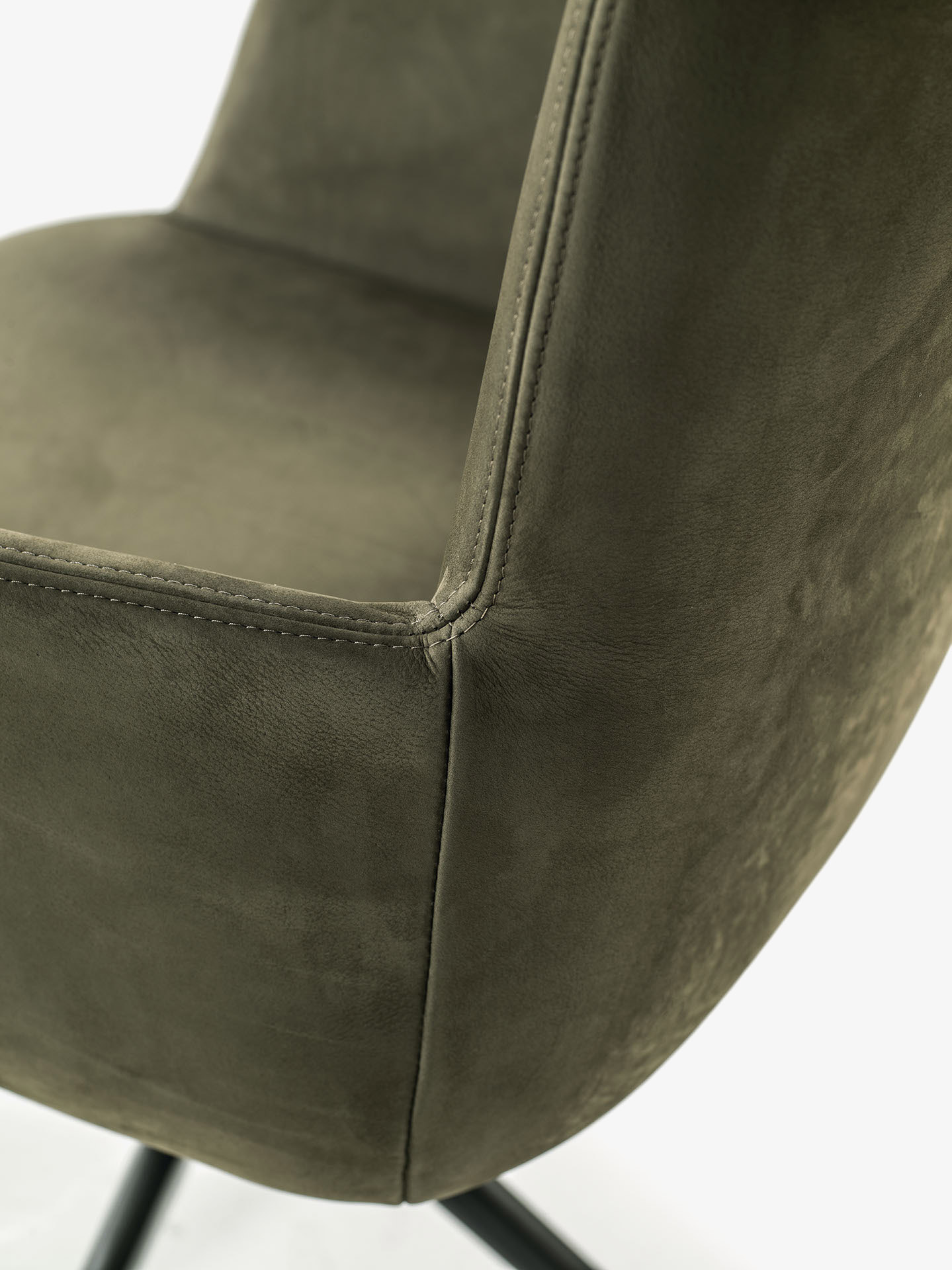 Chaise enveloppante en polyuréthane avec dossier, assise et accoudoirs revêtus en cuir ou en tissu avec coutures apparentes. Piètement pivotant en acier.