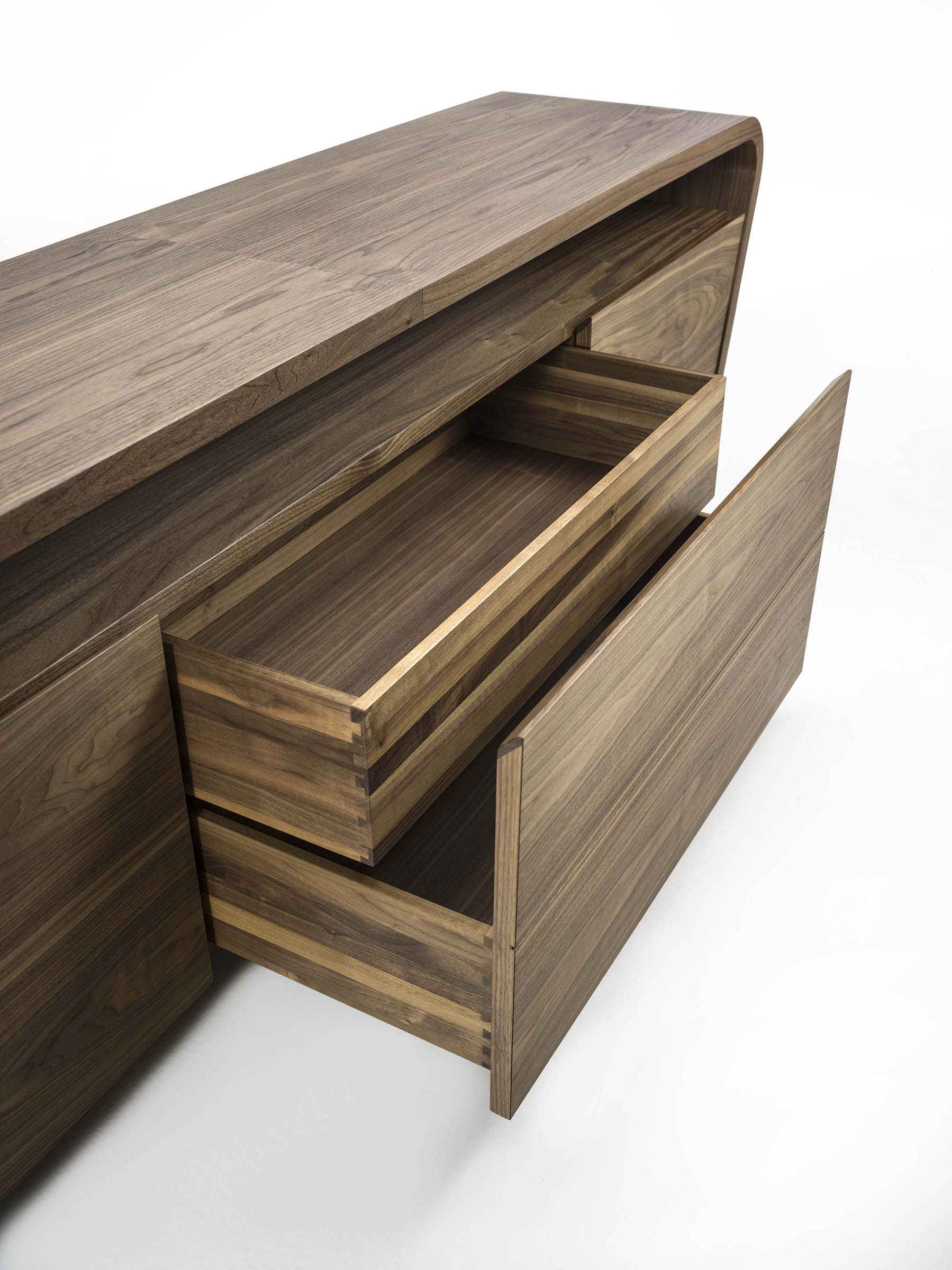 Buffet en bois massif et multiplis avec deux portes latérales et tiroirs centraux, caractérisé par des lignes sinueuses et arrondies. Un compartiment ouvert, pratique et fonctionnel, se trouve sous la partie supérieure.