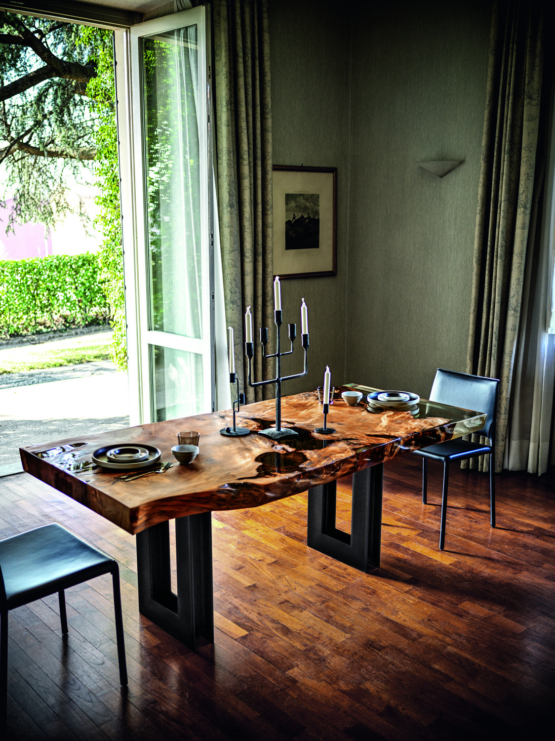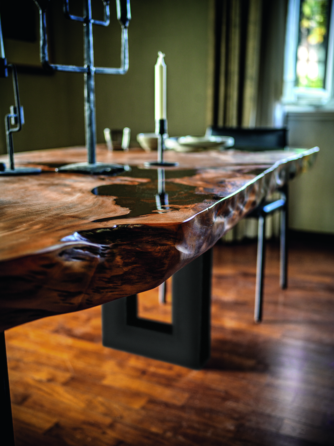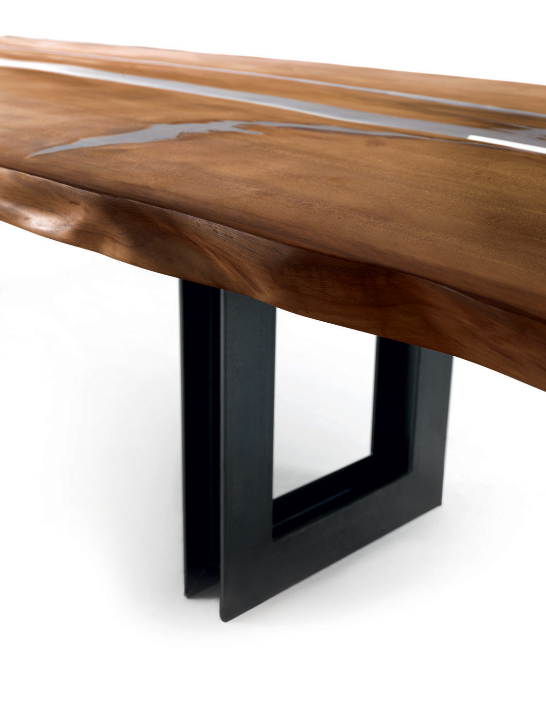 Table avec plateau en bois massif de Kauri, uni à un piètement géométrique en acier, qui s’inspire de la forme de la poutrelle (élément structurel en métal en forme de double T).