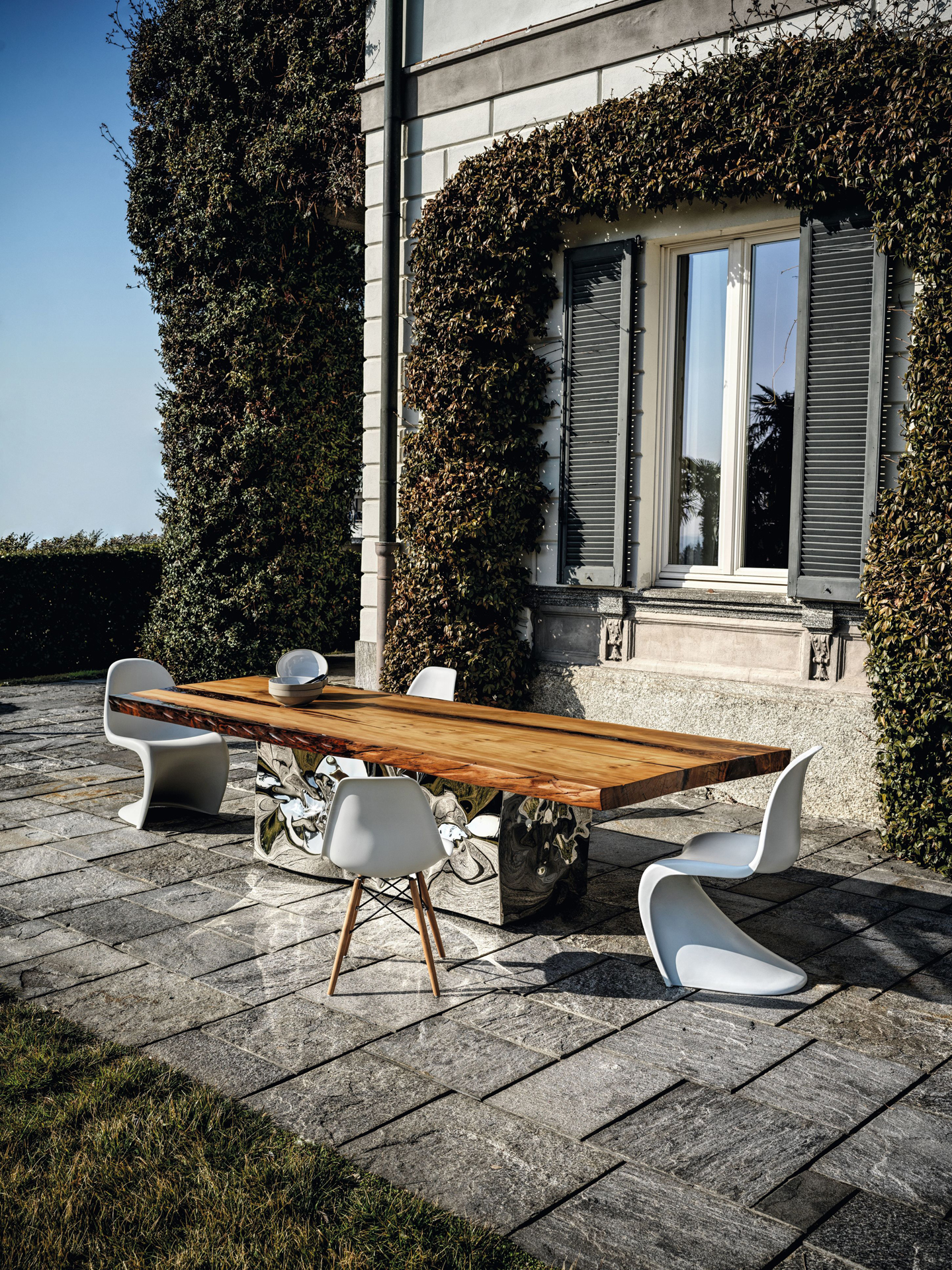 Table avec plateau en bois massif de Kauri, avec piètement sculpté réalisé avec des feuilles d’acier inoxydable forgé par l’artiste de renommée internationale Helidon Xhixha.
