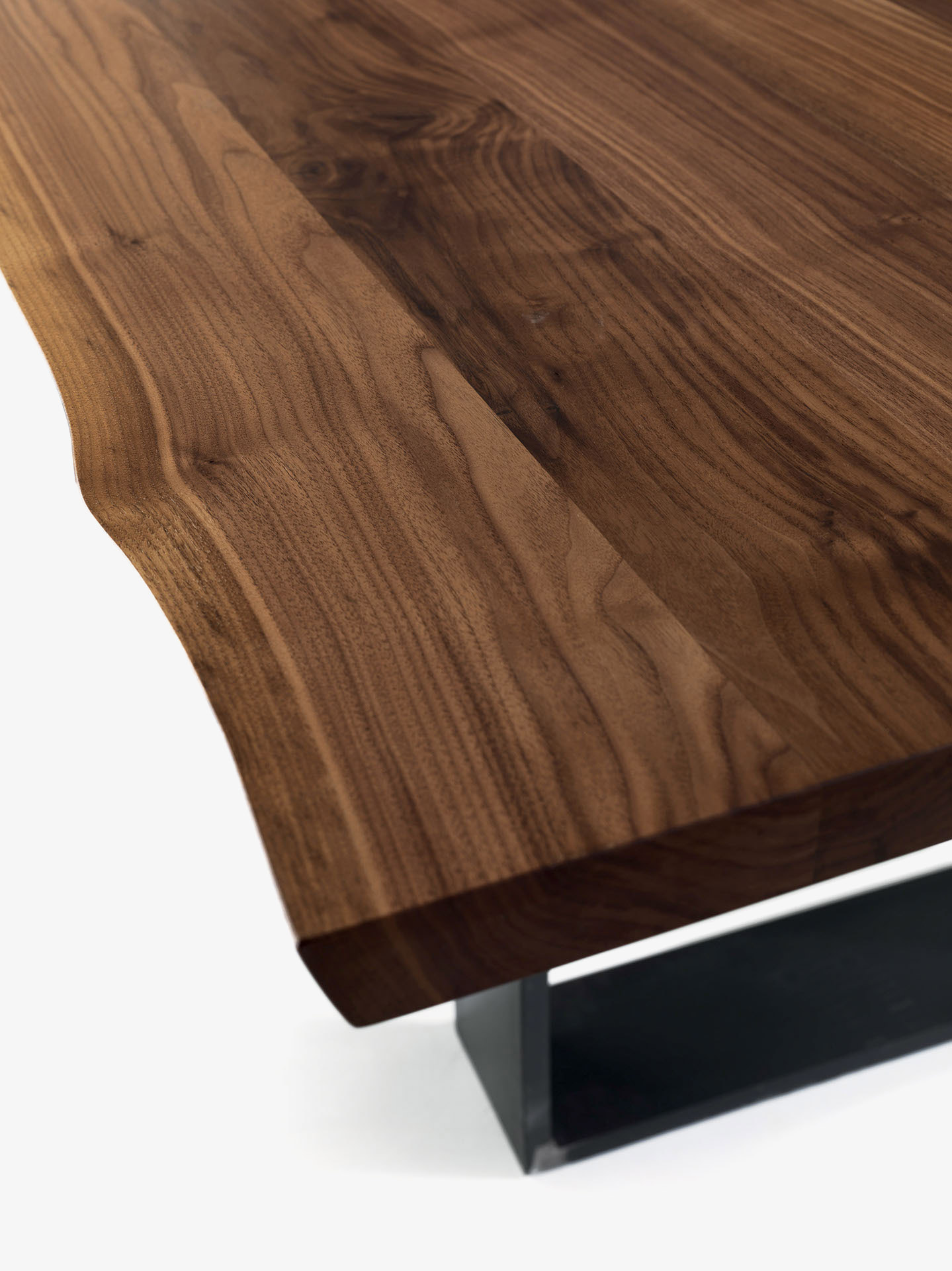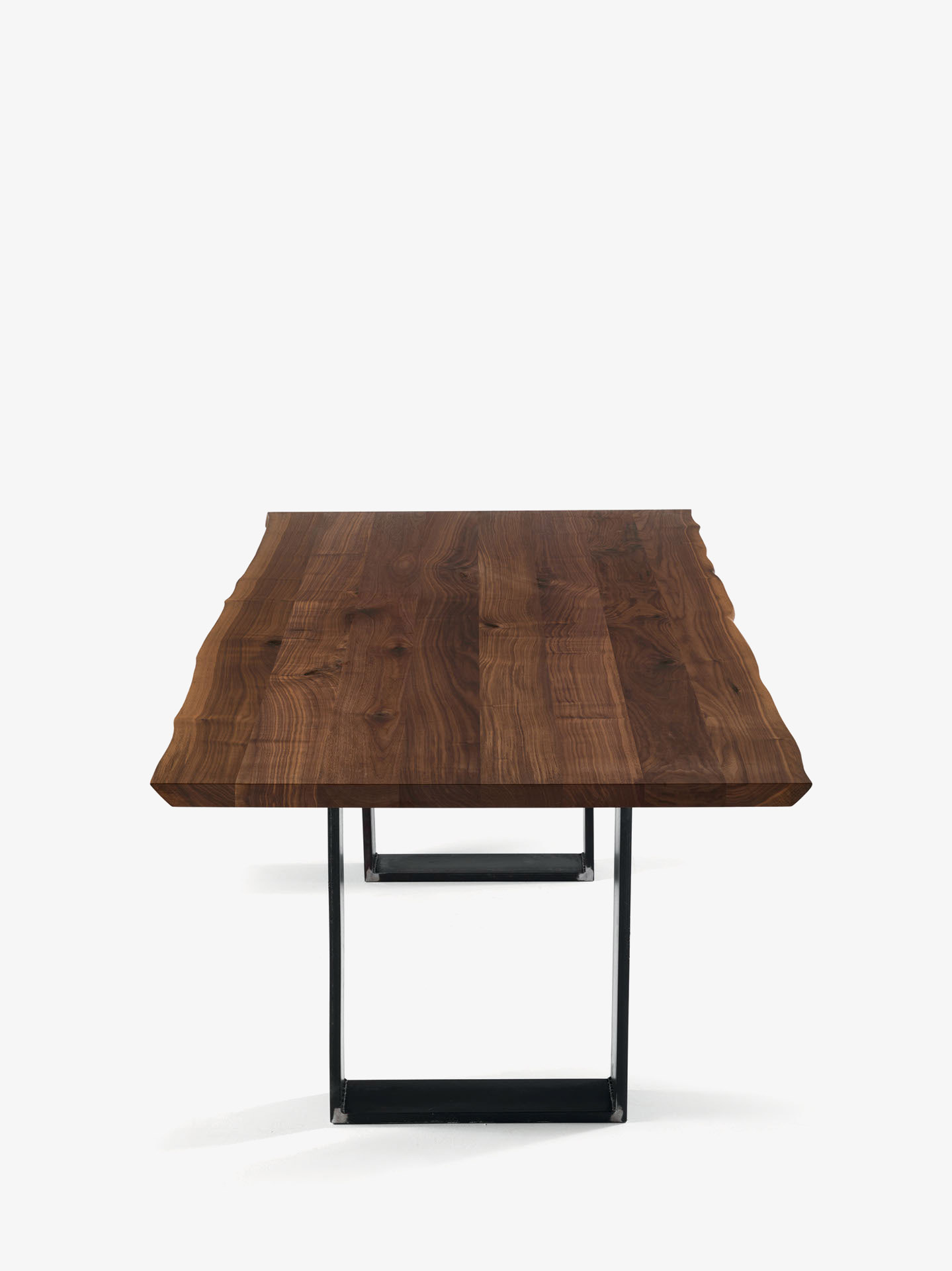Table avec plateau en bois massif en lattes collées, avec bords naturels. Le piètement se compose de pieds en acier.