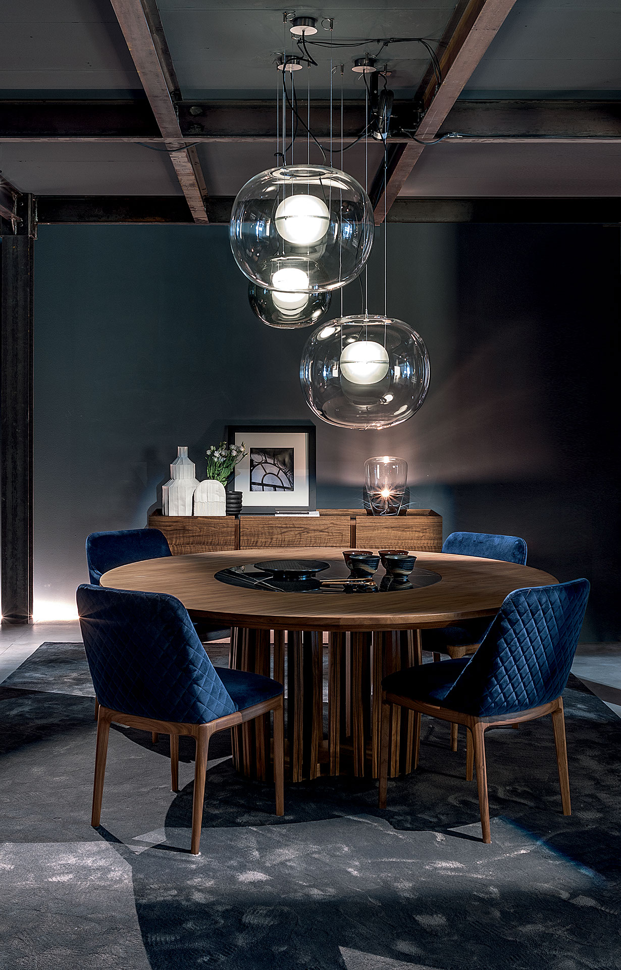 Table ronde avec plateau en bois massif, avec possibilité d'ajouter un plateau tournant Lazy Susan en bois ou en marbre en appui. Le piètement, composé par des lattes en bois massif, ressemble le symbole de l'infini.