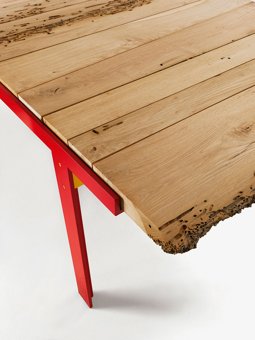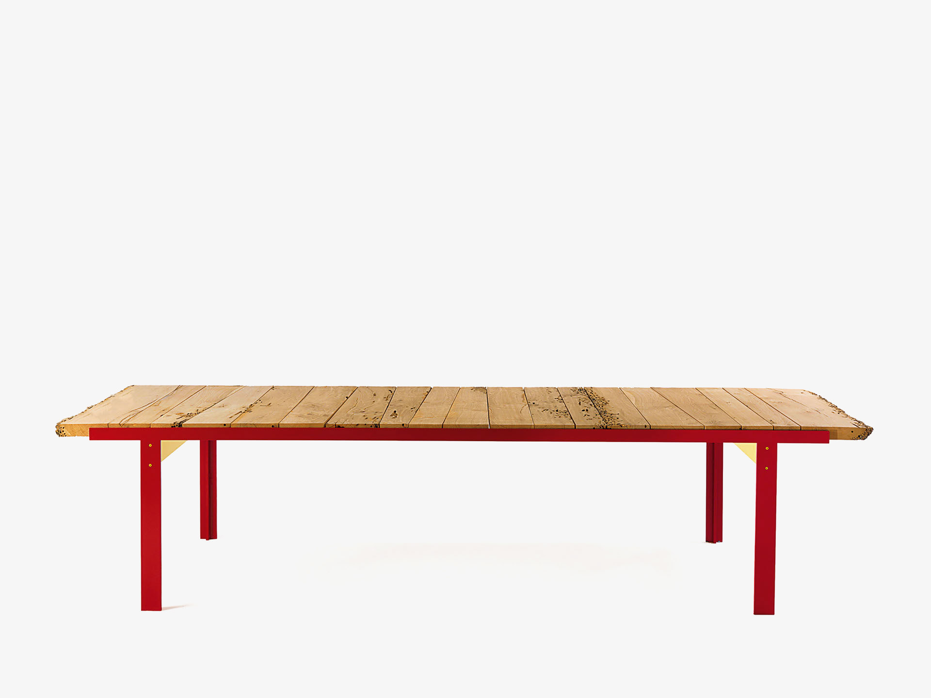 Table avec plateau en planches de Briccola juxtaposées transversalement, bouts de table avec bords naturels. Piètement en acier composé de quatre pieds avec section en T.